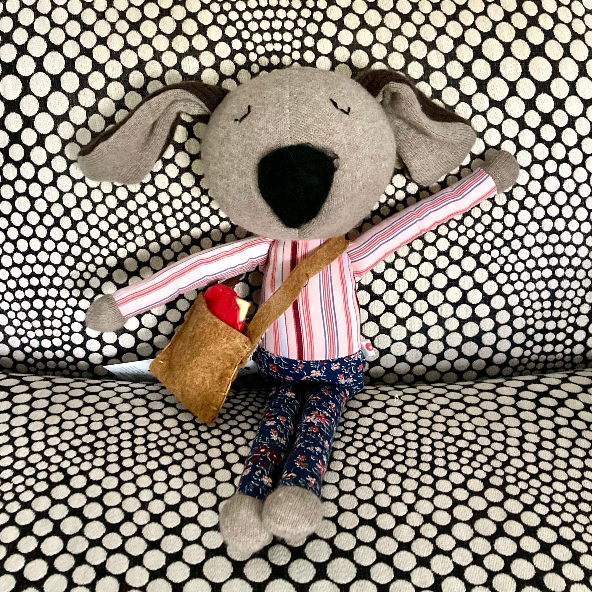 The stuffing is pure kapok batting, a natural, hypoallergenic cotton alternative that has a very small carbon footprint, is mold and mildew resistant, and is soft and fluffy for a lifetime of hugs and love. Each dog also has a removable recycled wool felt satchel containing a little red wool felt bird as their travel buddy. Infant safe without the satchel, for children 3+ and adults of all ages with the satchel.