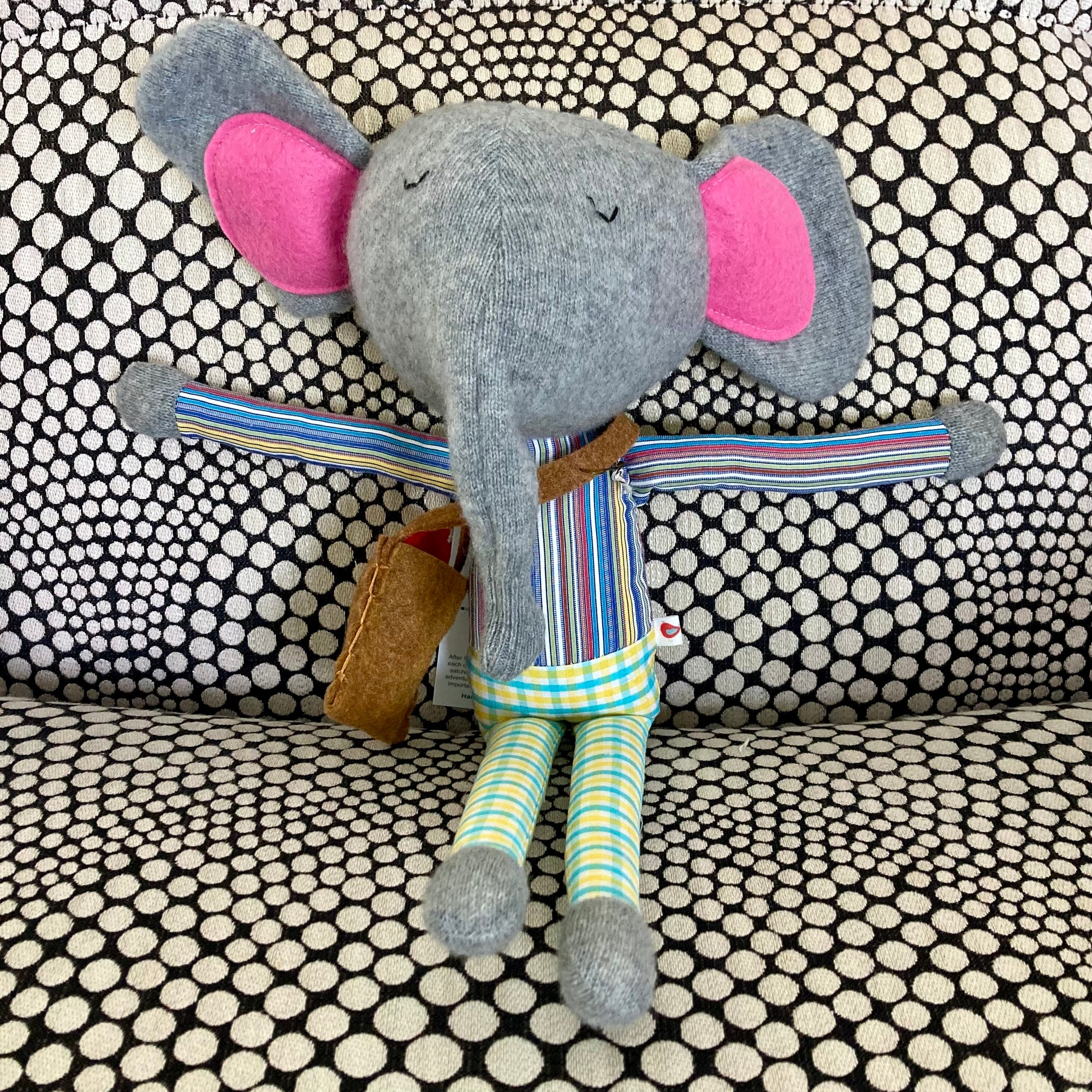 These adorable elephants are covered with gently used, cleaned and upcycled clothing; the bodies are covered in highly patterned cotton shirting fabric, and the head is oh-so-soft cashmere sweaters.