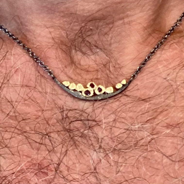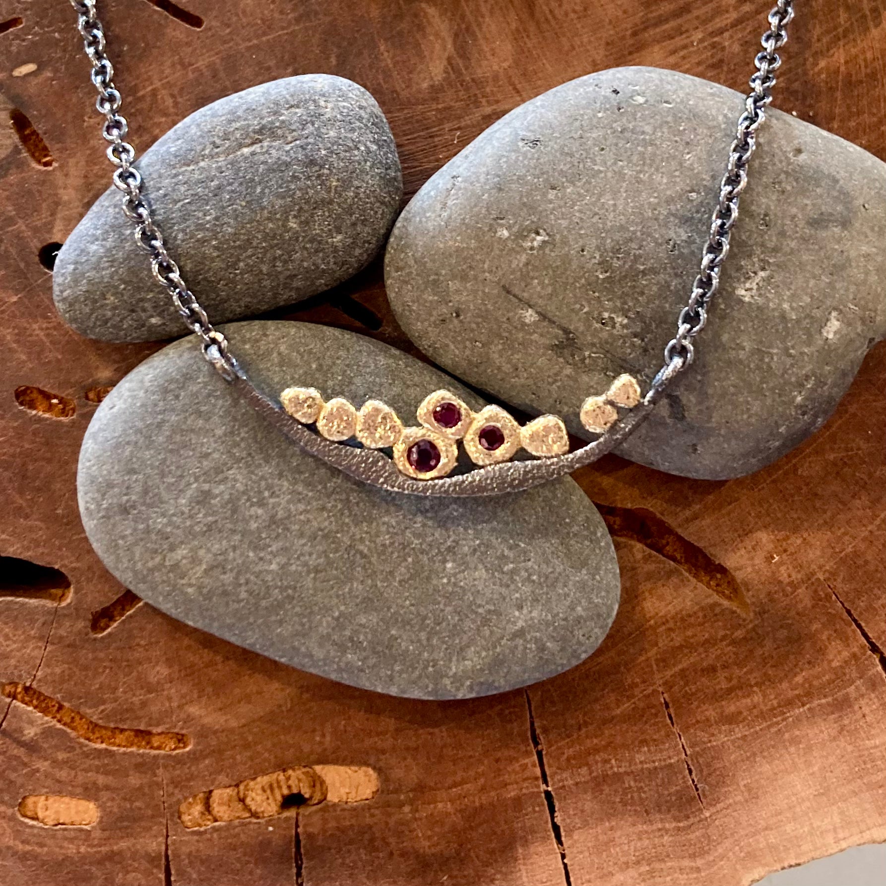A series of 18K textured gold pebbles of various sizes cradle three faceted rubies and rest on an oxidized sterling silver bridge. An oxidized sterling silver chain with easy 18K gold hook clasp complete the look designed to rest just at the base of the neck.