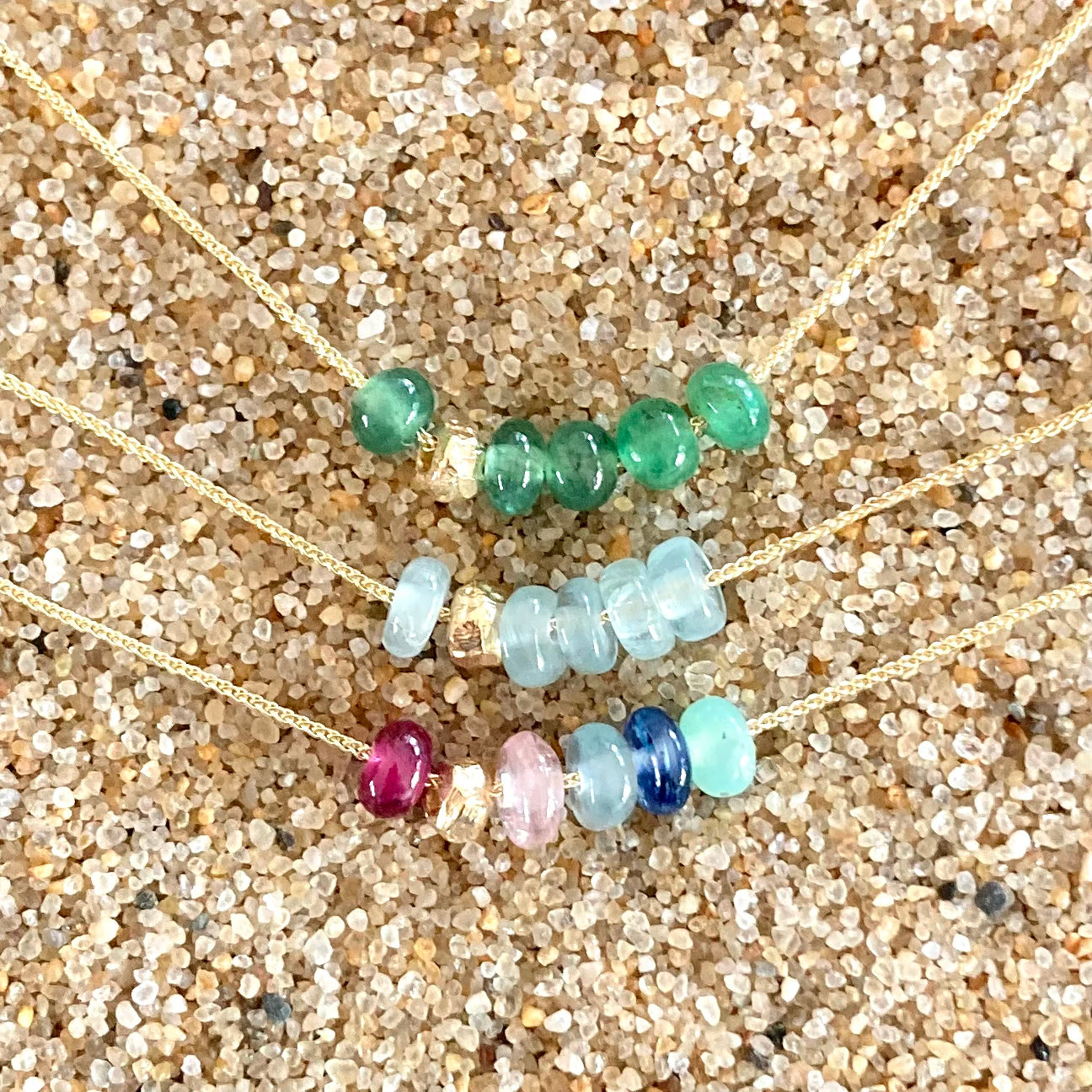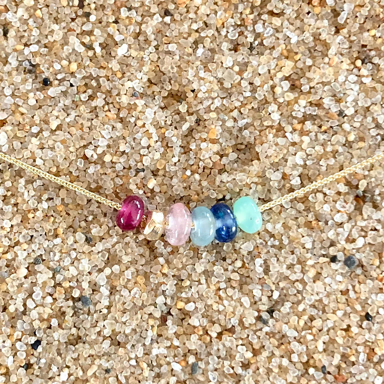 Mixed necklace includes one each of tourmaline, ruby, aquamarine, kyanite and chrysoprase along with a hammered 18K gold bead.
