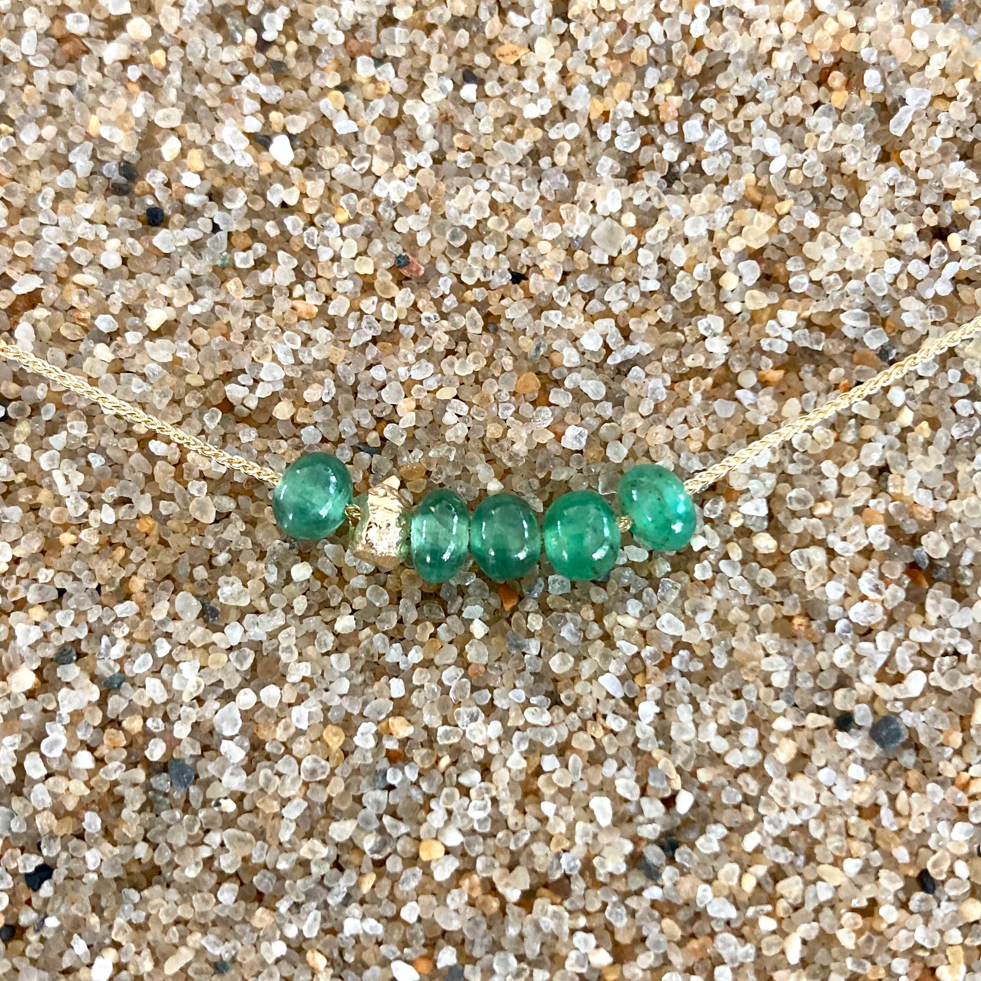 A collection of five round stone beads reminiscent of childhood favorite candies and one hammered 18K gold bead are freely suspended from an 18" wheat sheaf 18K gold chain with a loop at 16" for more petite necks.