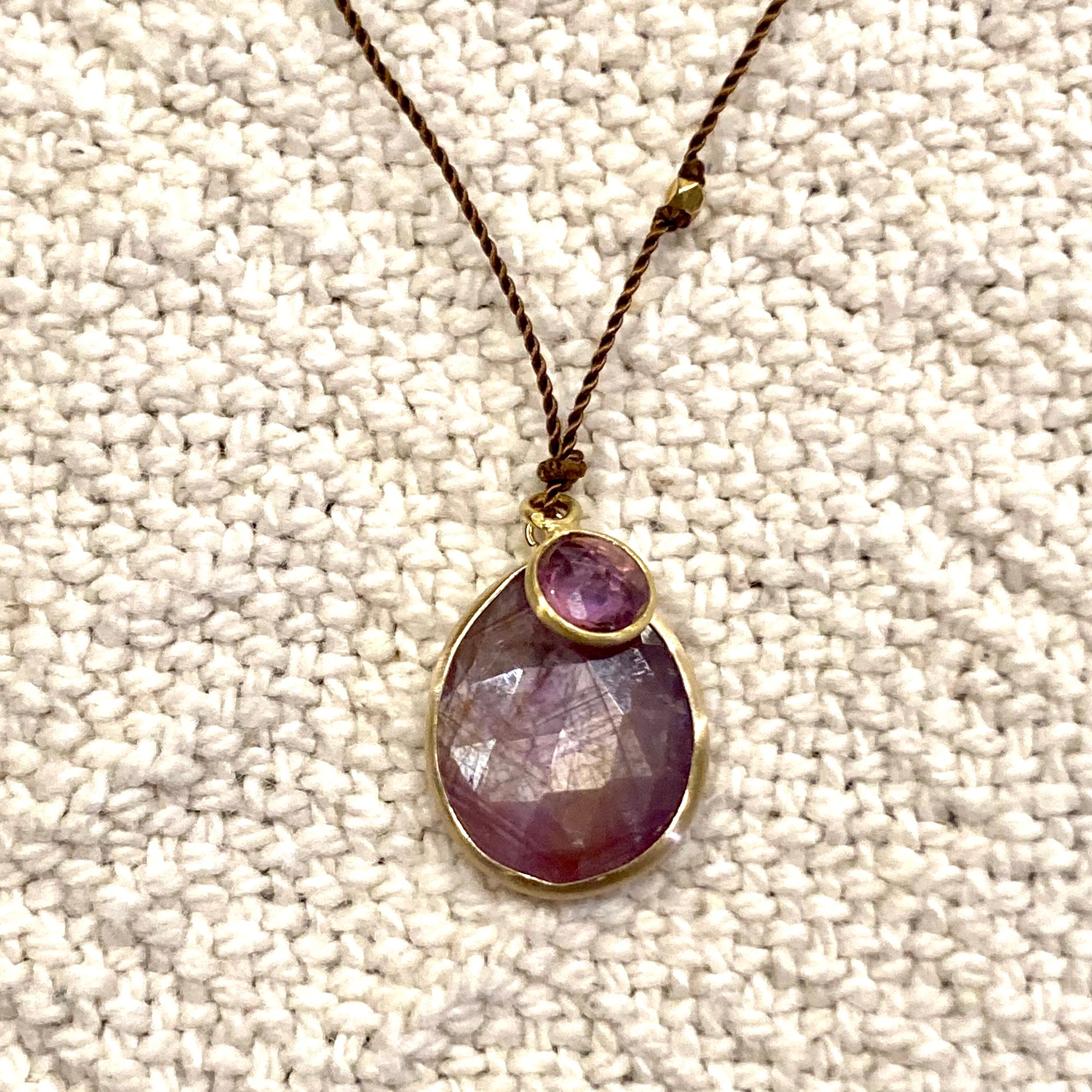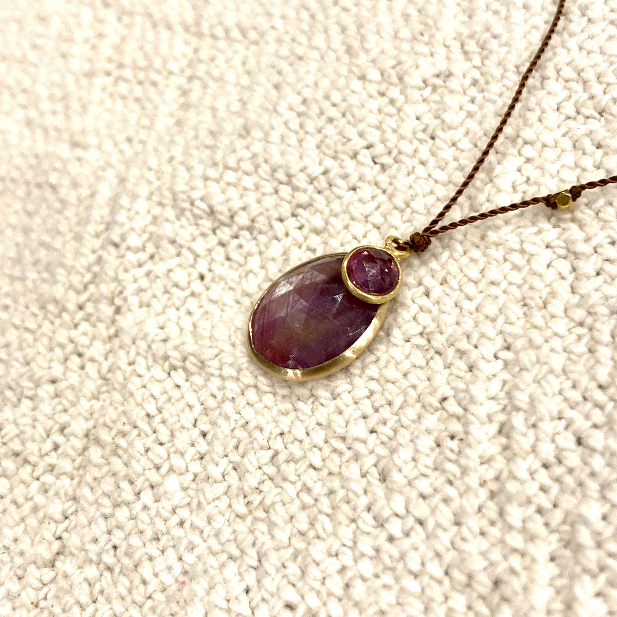 One of a Kind 14K Gold Framed Ruby and Sapphire on Cord Necklace