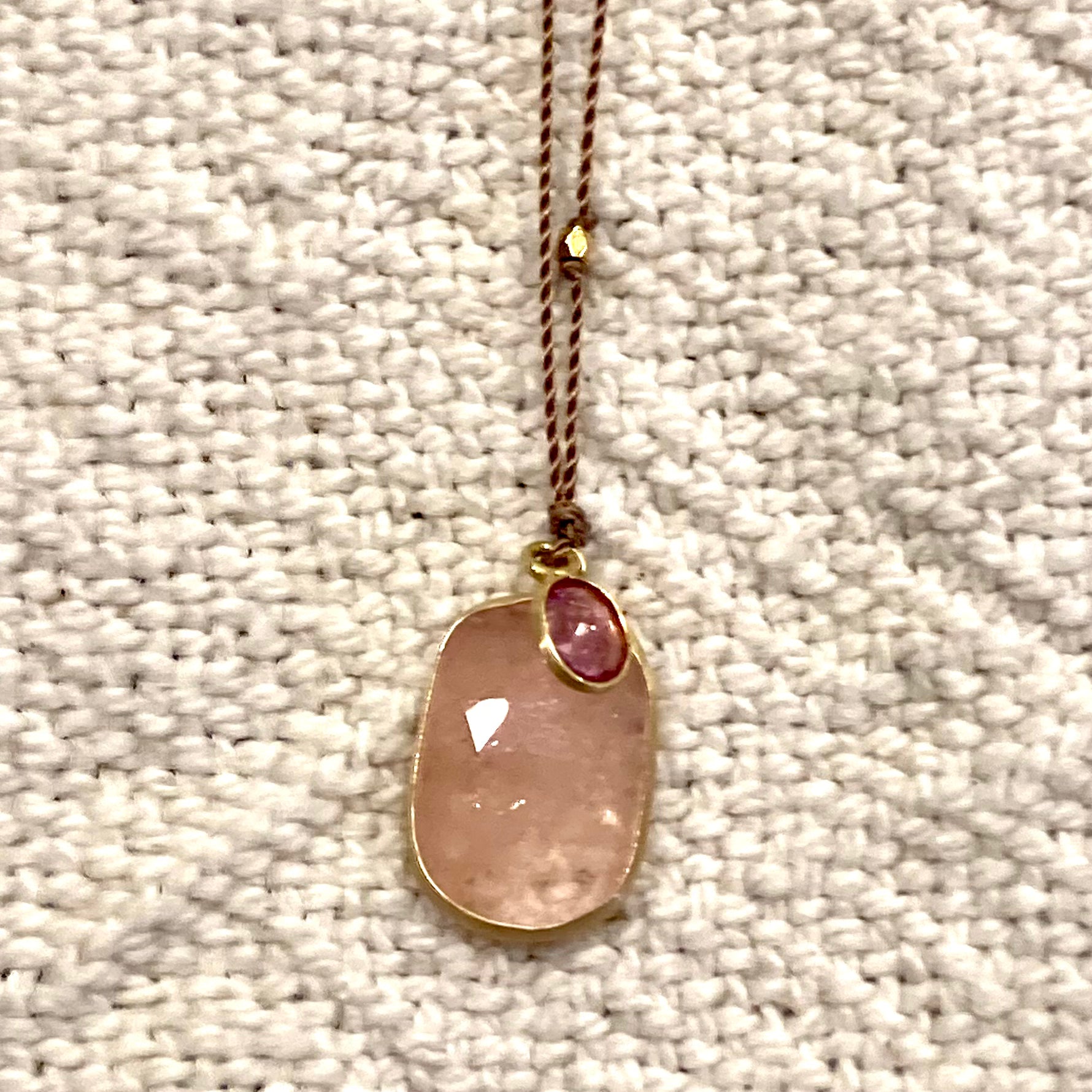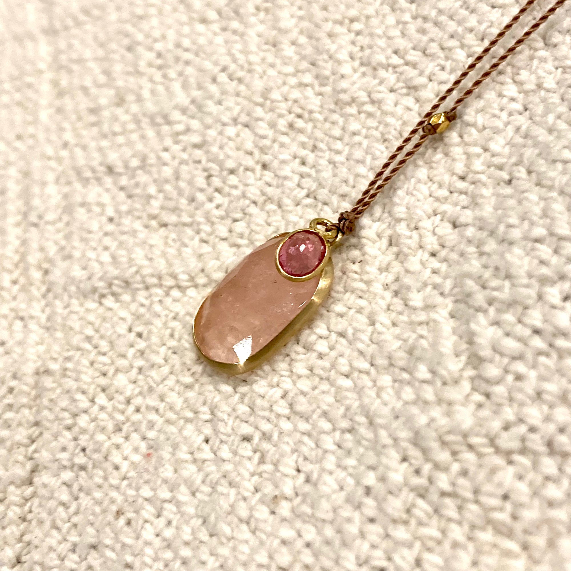 One of a Kind 14K Gold Framed Morganite with Tourmaline on Cord Necklace