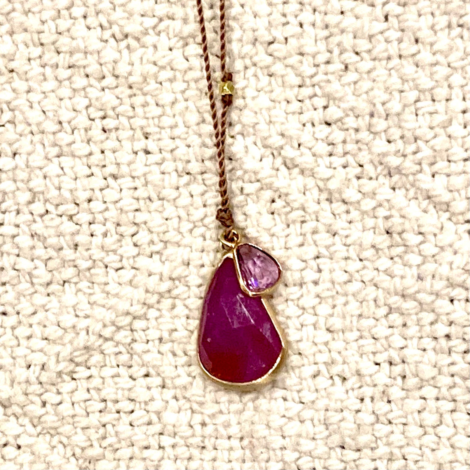 One of a Kind 14K Gold Framed Sapphires on Cord Necklace