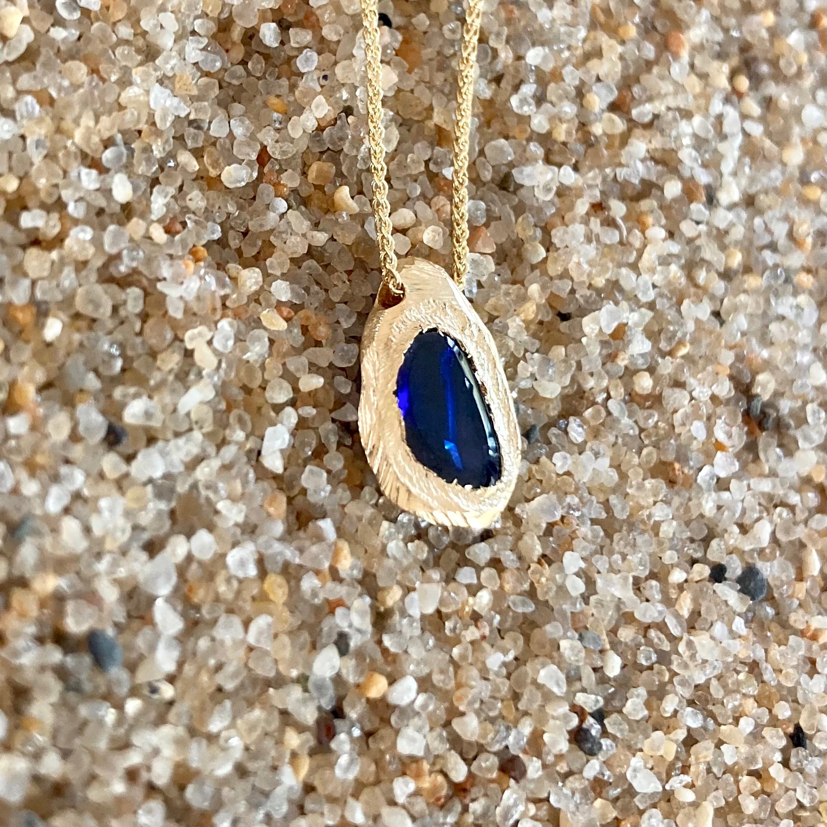 A freeform classic rose cut dark blue sapphire (1TCW) is set into a hand carved 18K gold bezel and freely suspended from an 18" wheat sheaf 18K gold chain with a loop at 16" for more petite necks.