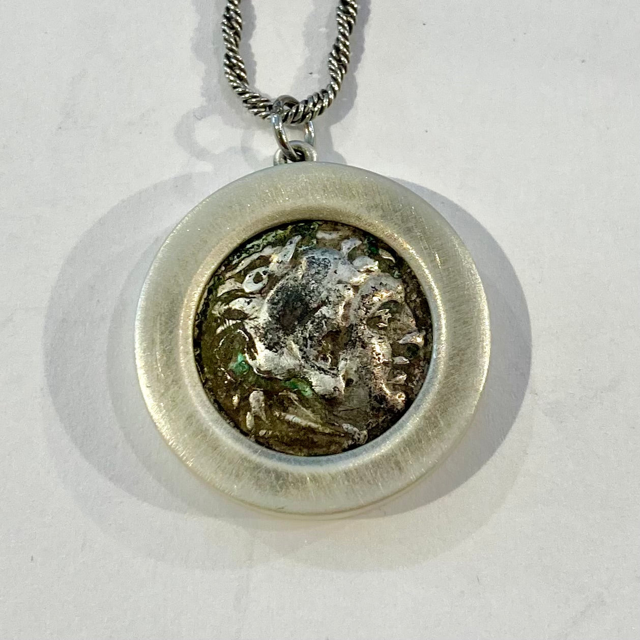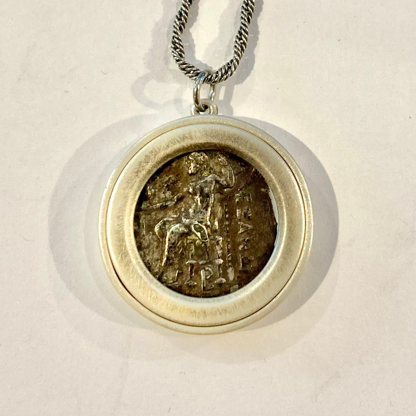 A silver coin found in an archeological dig in Israel, selected by me from the collection of a Jerusalem coin dealer I have known since I was 4 years old, is custom framed in a burnished sterling silver bezel to show both sides and suspended on an 18" oxidized sterling silver rope chain.