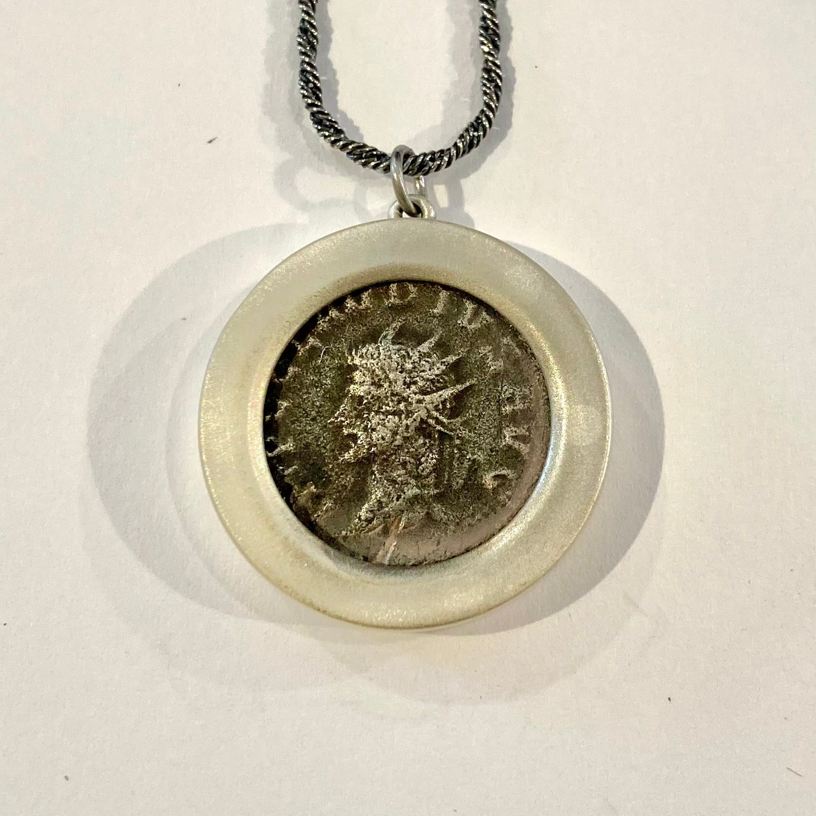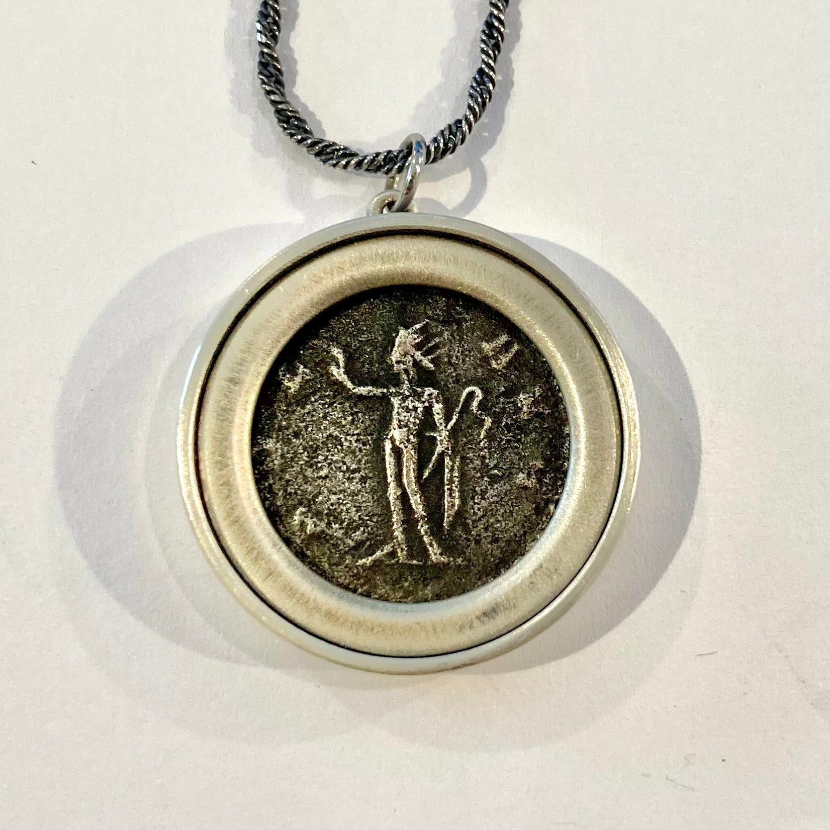 A silver coin found in an archeological dig in Israel, selected by me from the collection of a Jerusalem coin dealer I have known since I was 4 years old, is custom framed in a burnished sterling silver bezel to show both sides and suspended on an 18" oxidized sterling silver rope chain.