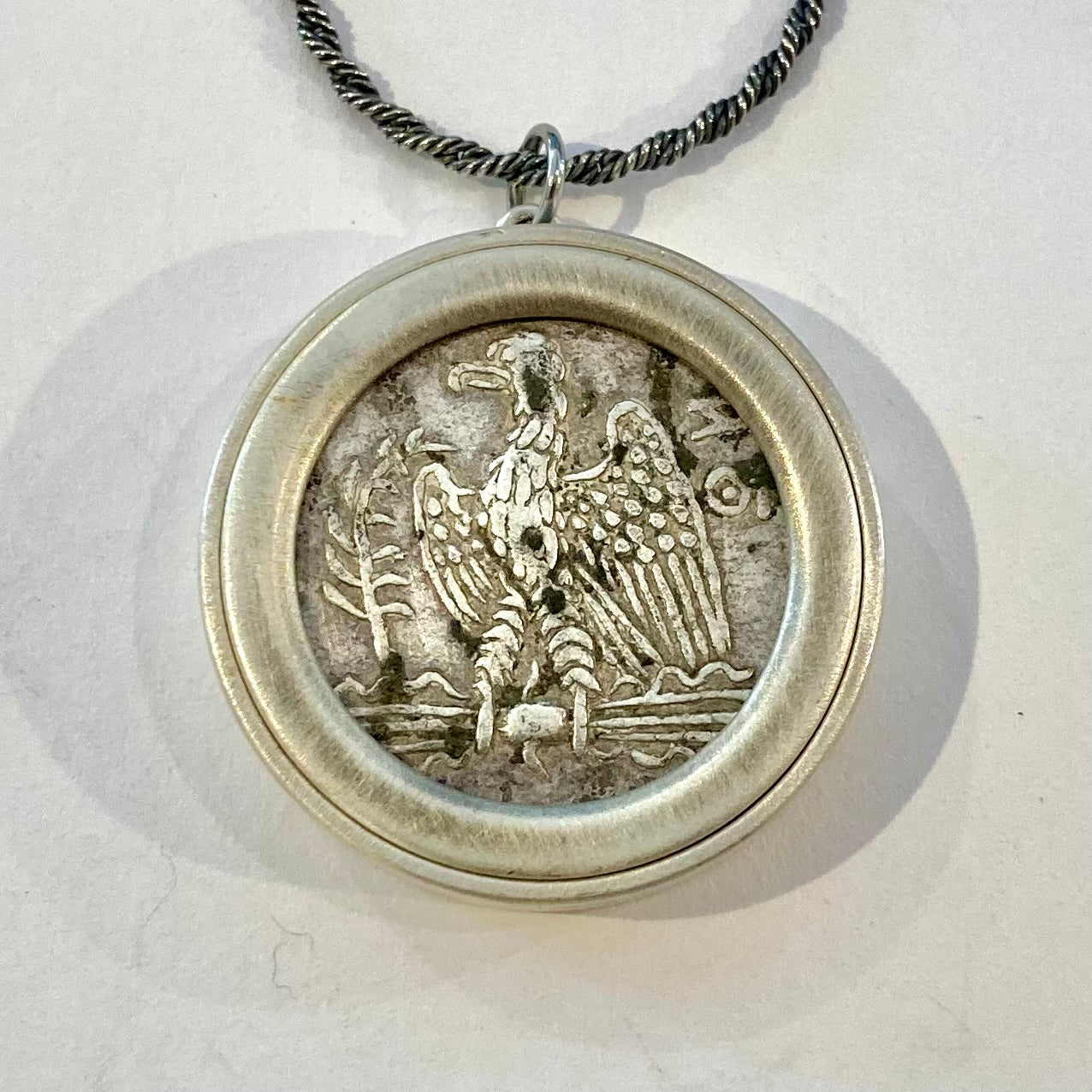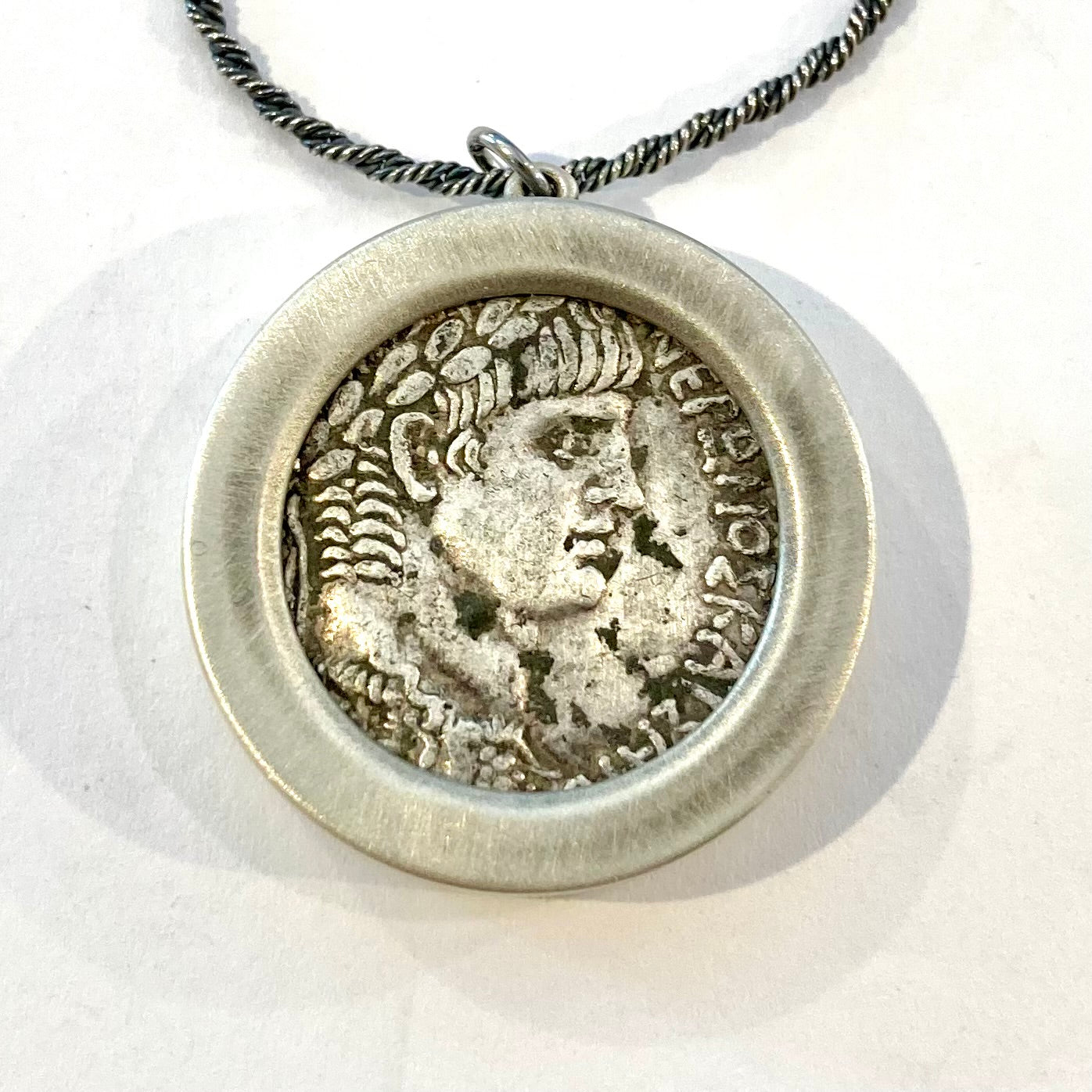 A silver coin found in an archeological dig in Israel, selected by me from the collection of a Jerusalem coin dealer I have known since I was 4 years old, is custom framed in a burnished sterling silver bezel to show both sides and suspended on an 18" oxidized sterling silver rope chain.