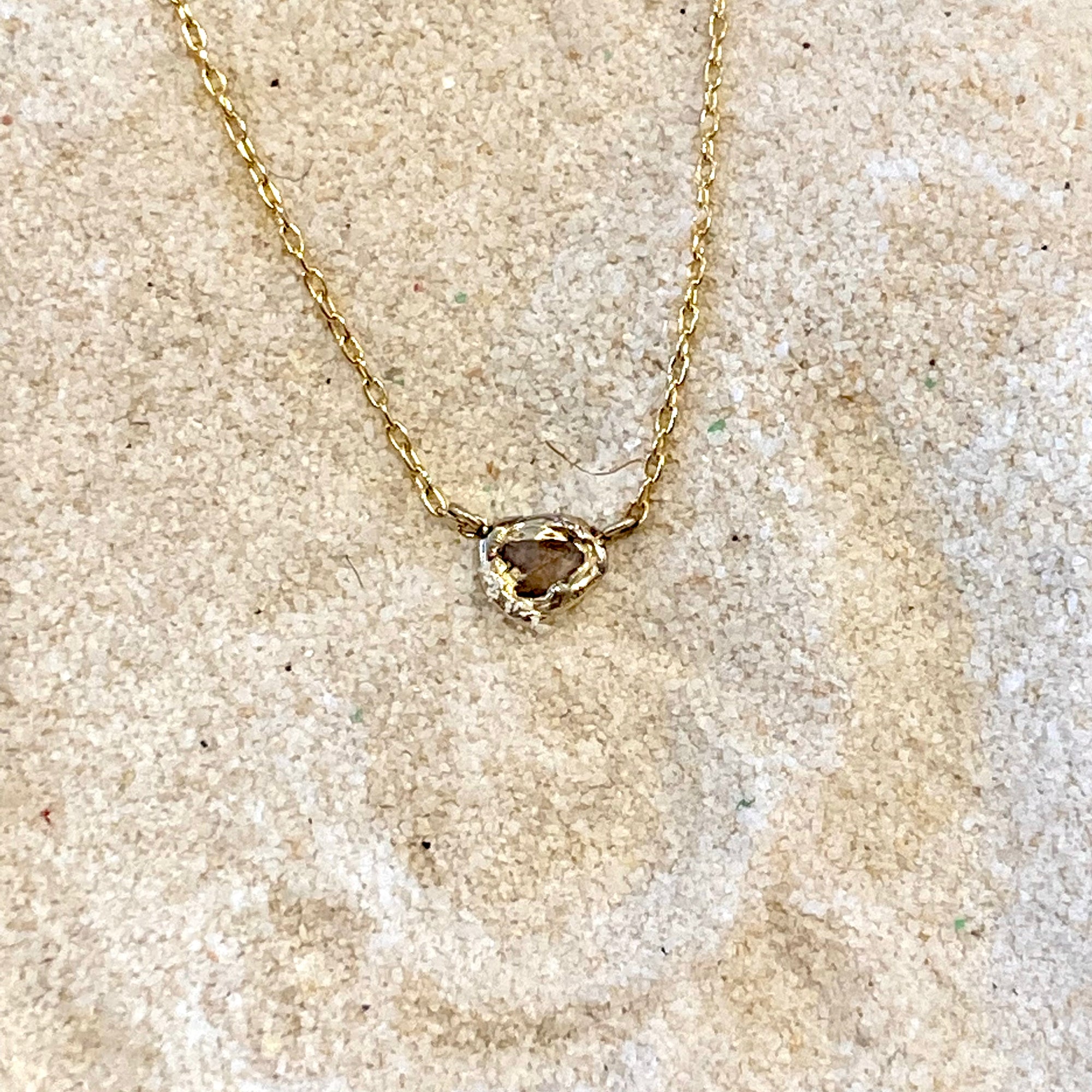 A rose cut champagne diamond is set into organically shaped 14K gold and suspended on a 16" thin 14k gold chain with a loop at 14" for more petite necks.