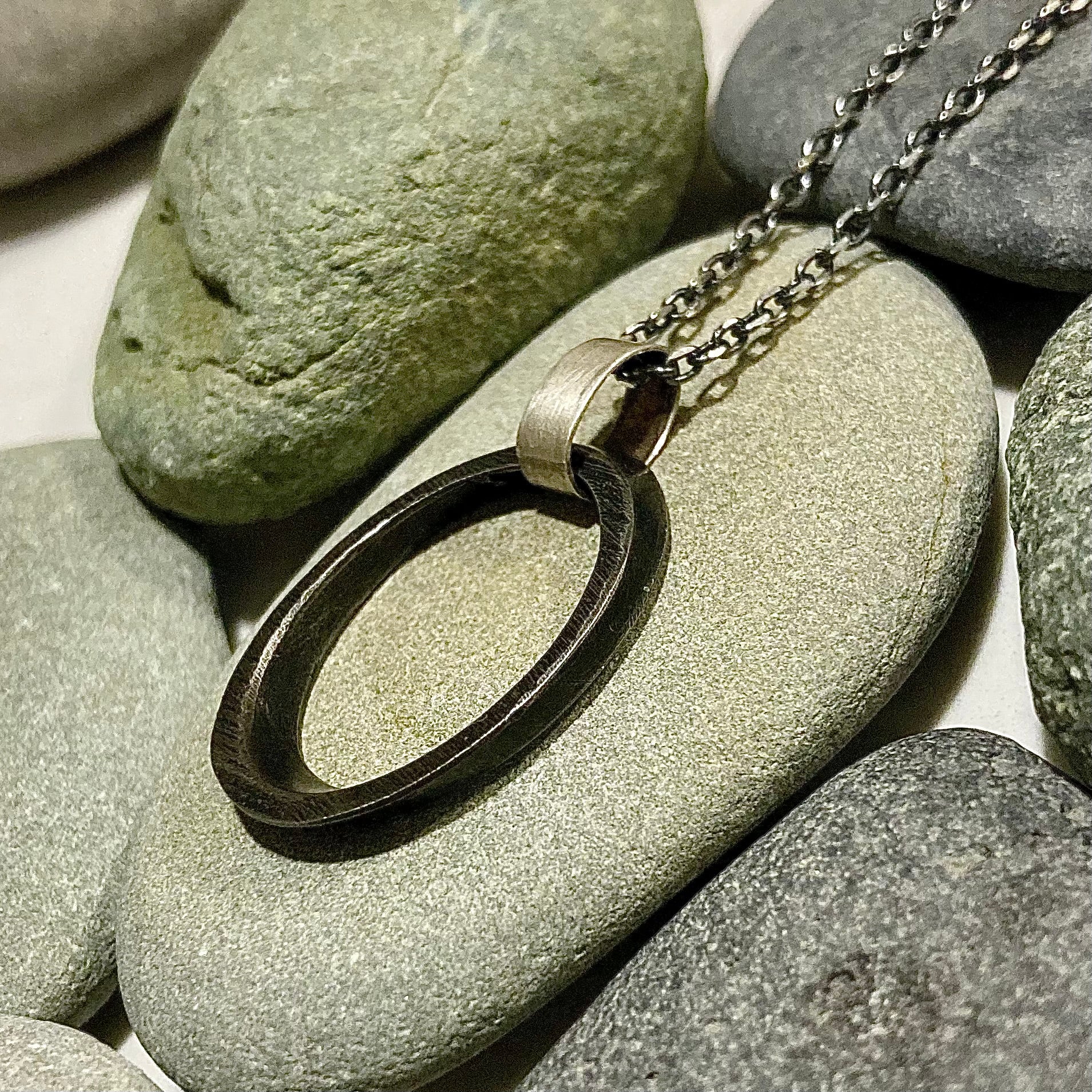 The maker is a trained metalsmith who has studied blacksmithing. This classic metalworking technique combining steel with sterling silver is rarely encountered in jewelry making. While the sterling silver frame and chain will remain the same, the steel will oxidize and subtly change colors with time, wear, exposure to water and salt, allowing you to enjoy the magic of metallurgy over time.