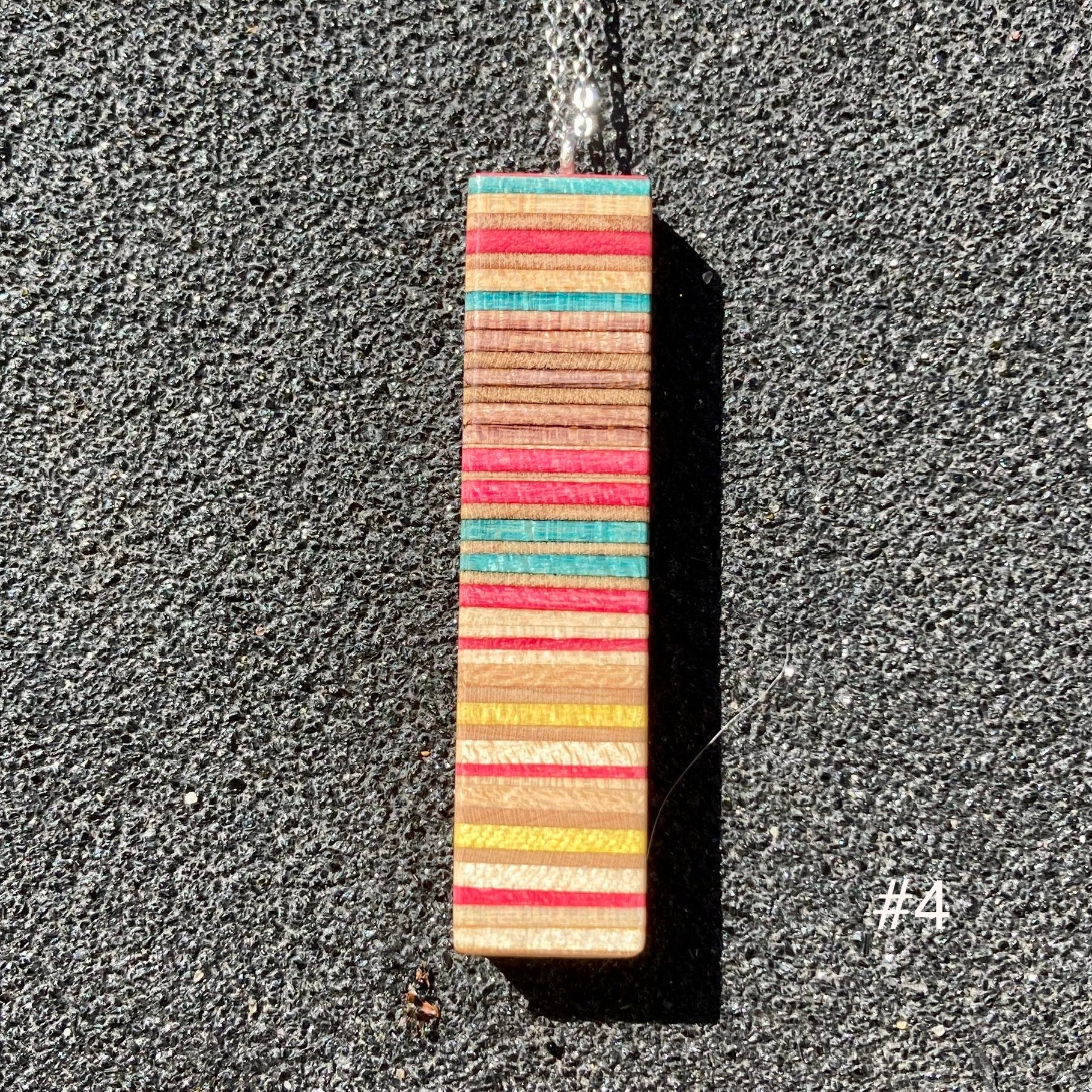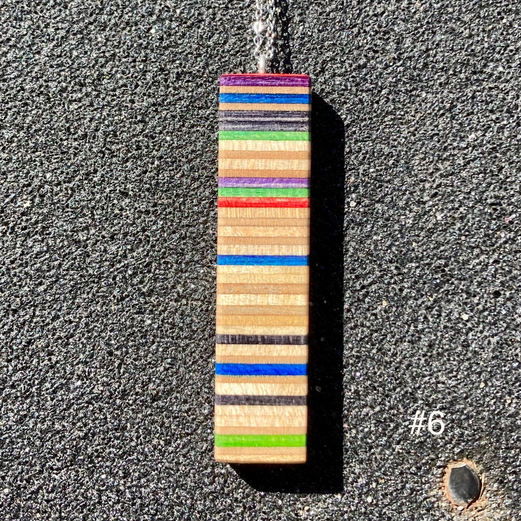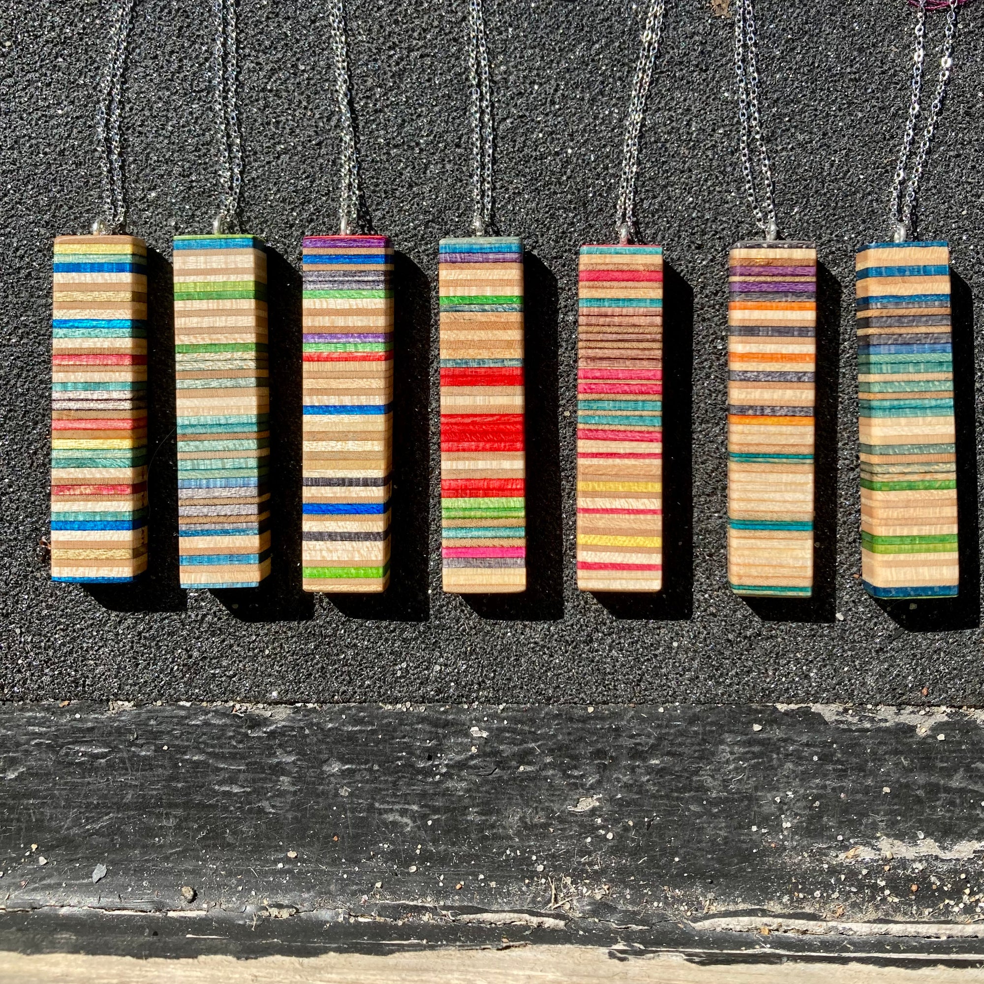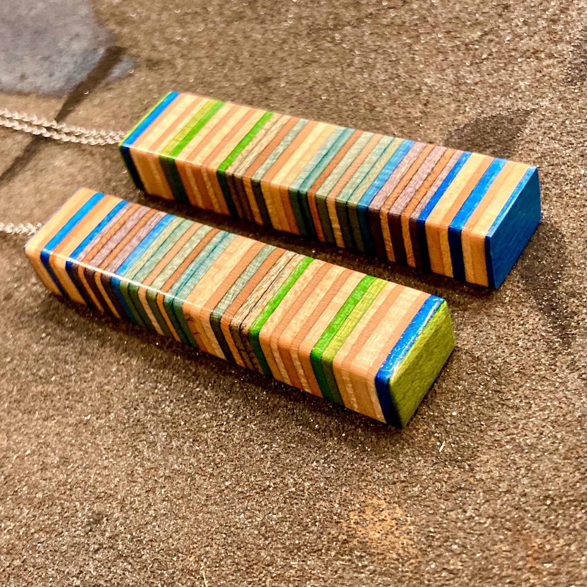 Old skateboards are turned into super cool columnar pendants instead of ending up in a trash heap somewhere. Layers of solid Canadian Maple are exposed and colors revealed to create functional works of wearable art. The pendant is sealed to protect it against wear and tear, although the natural aging process will just give the beads even more character over time.