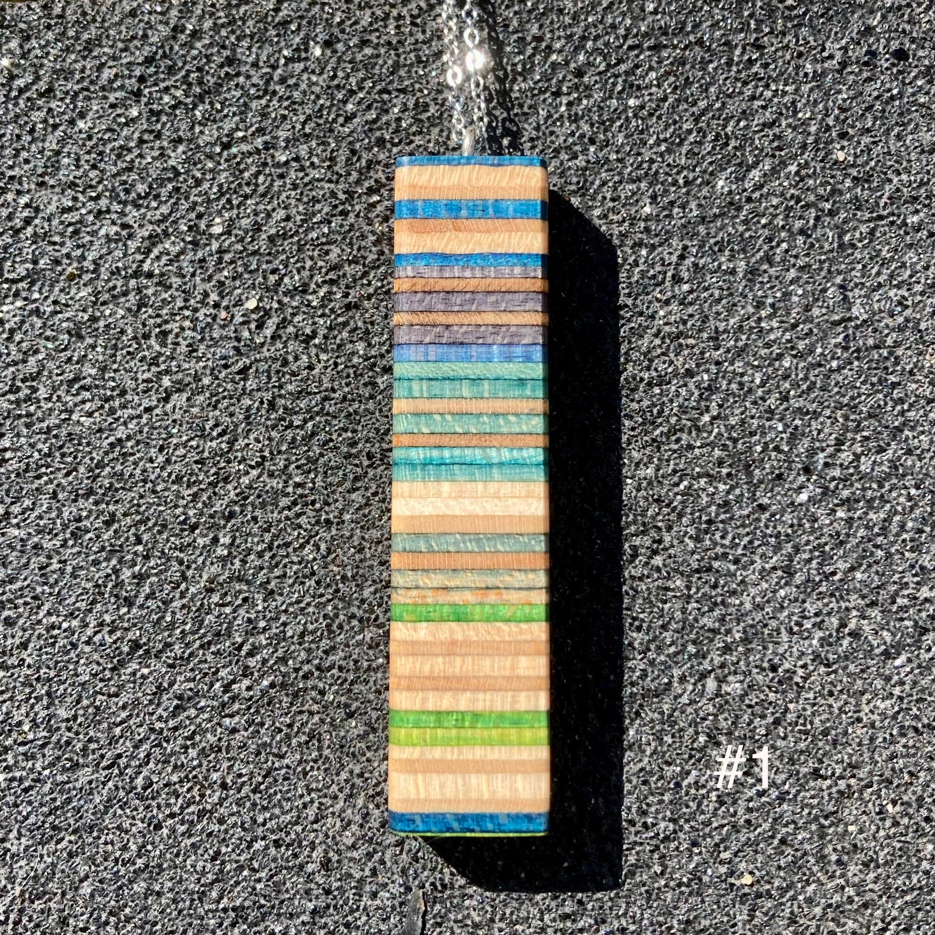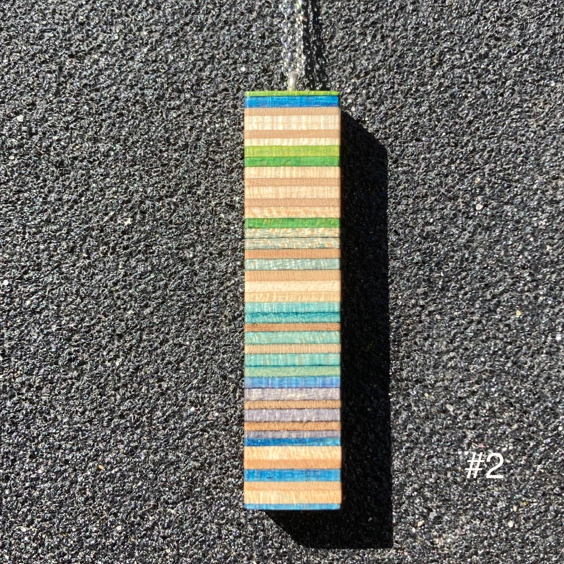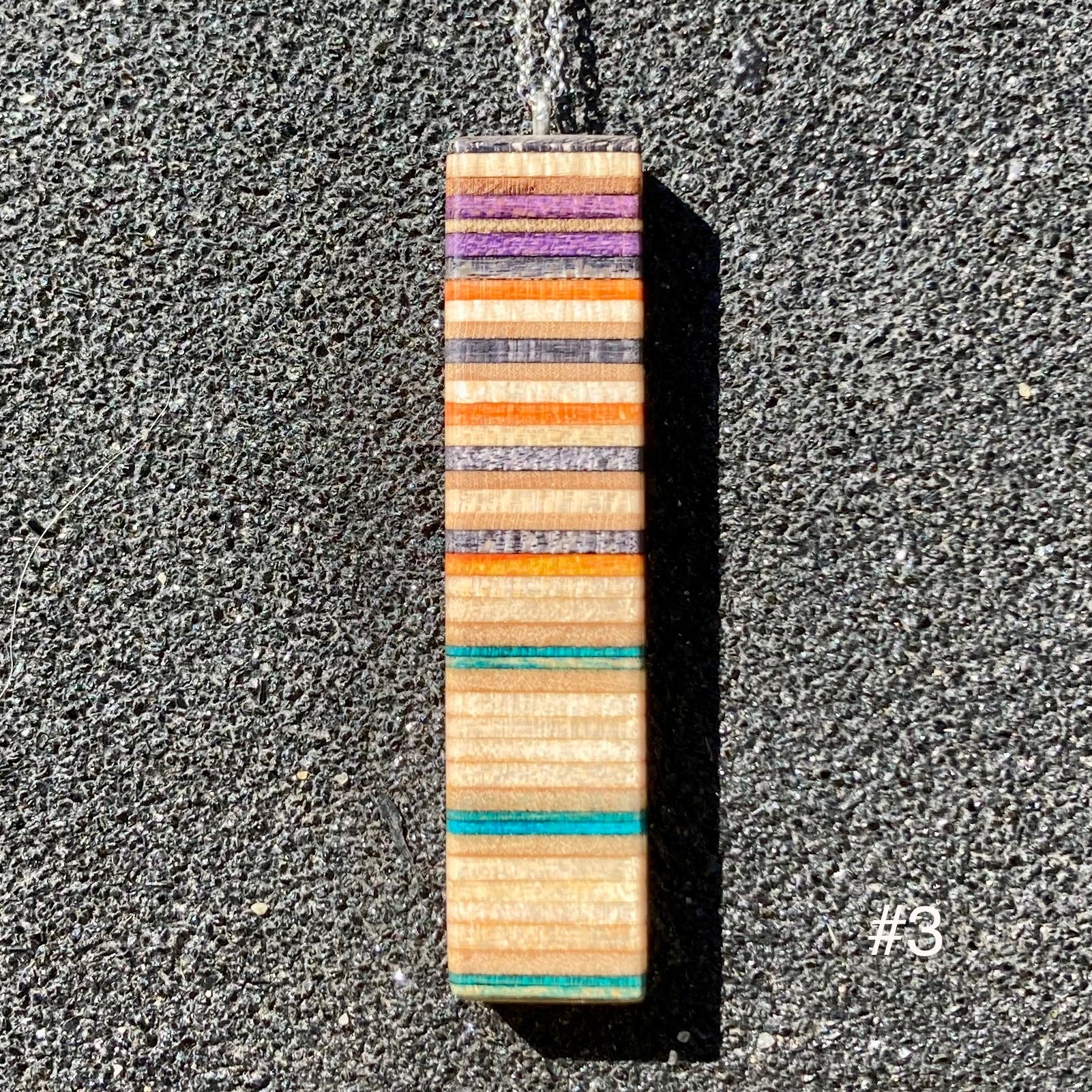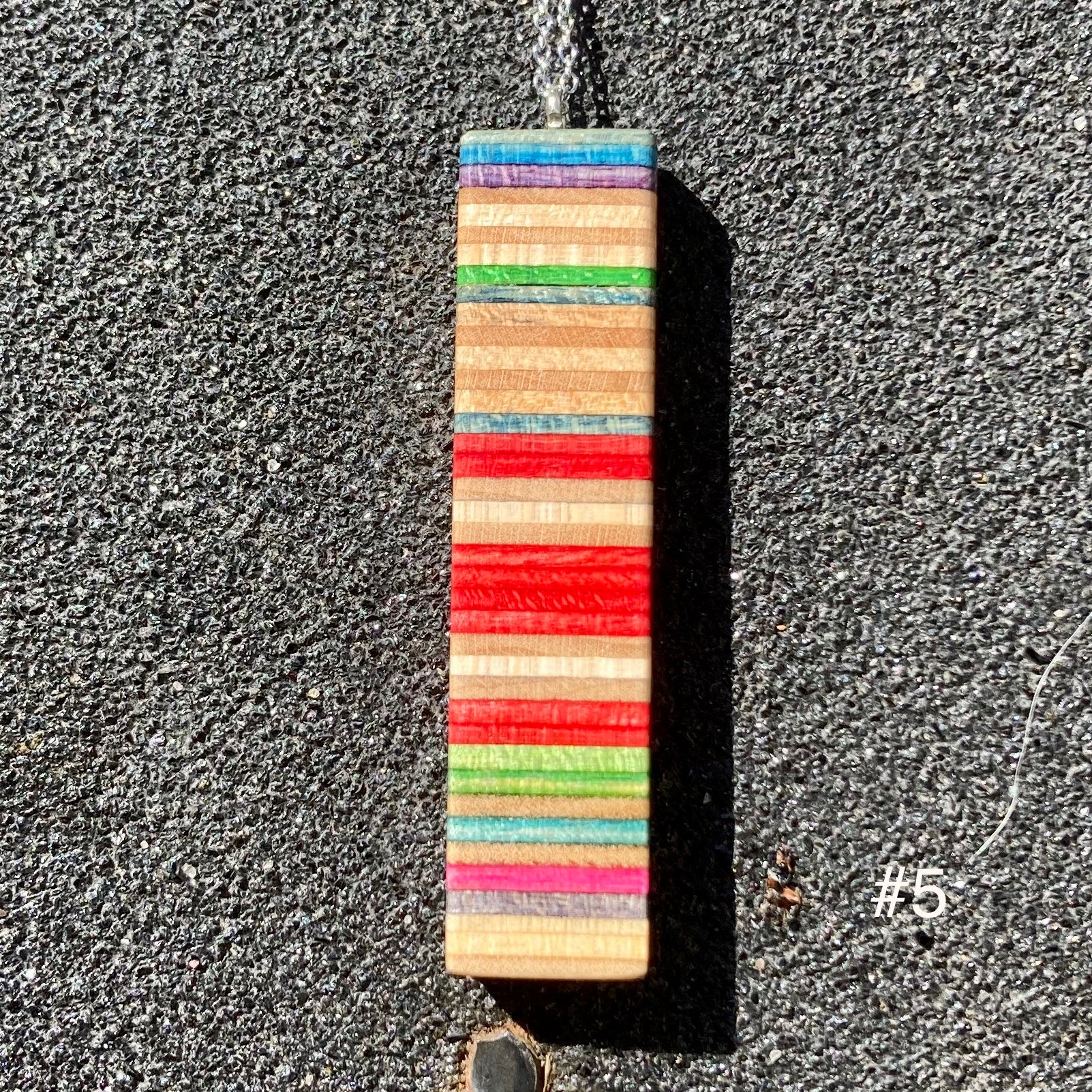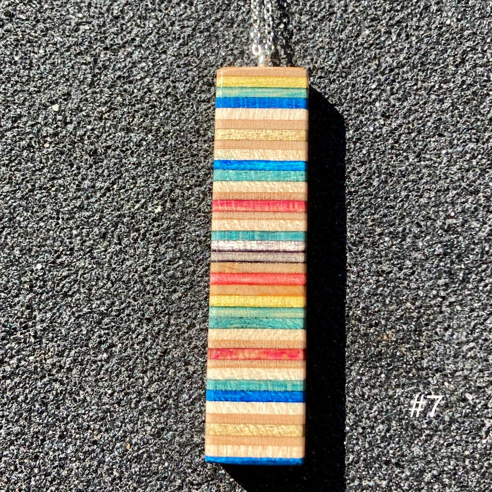 Old skateboards are turned into super cool columnar pendants instead of ending up in a trash heap somewhere. Layers of solid Canadian Maple are exposed and colors revealed to create functional works of wearable art. The pendant is sealed to protect it against wear and tear, although the natural aging process will just give the beads even more character over time.