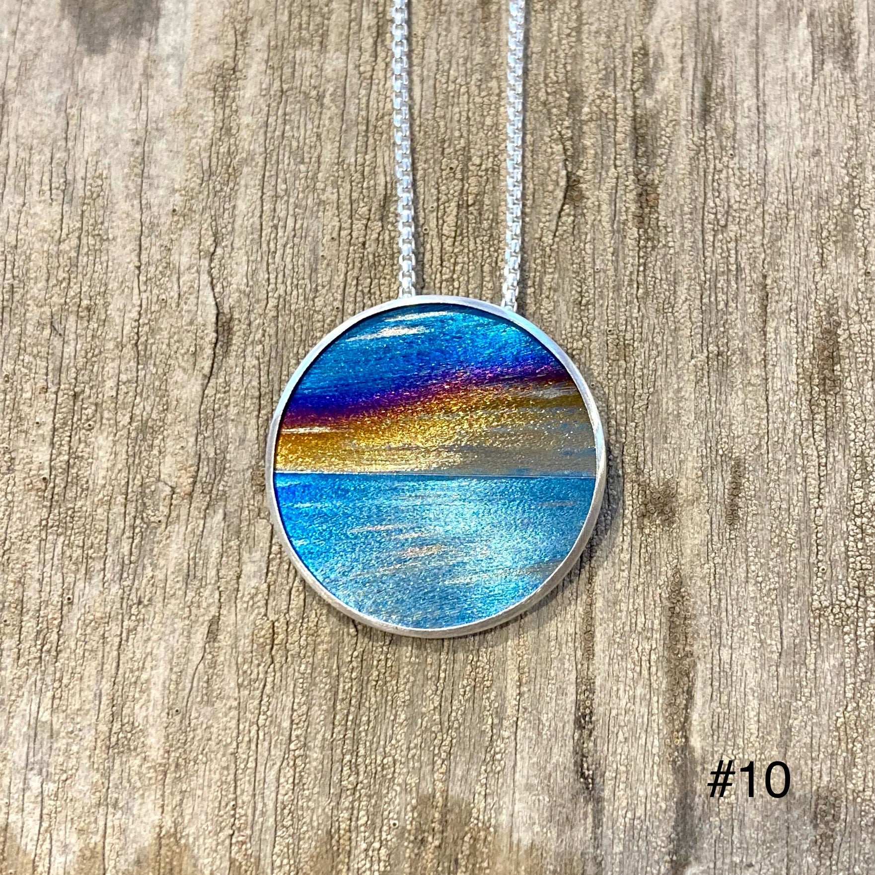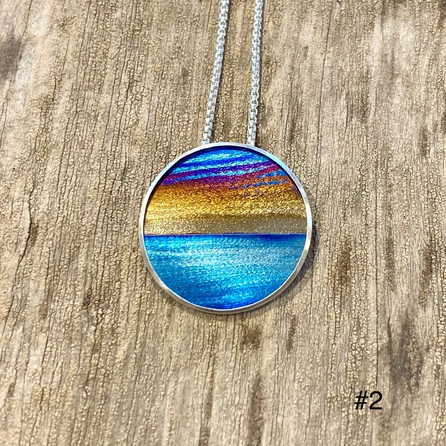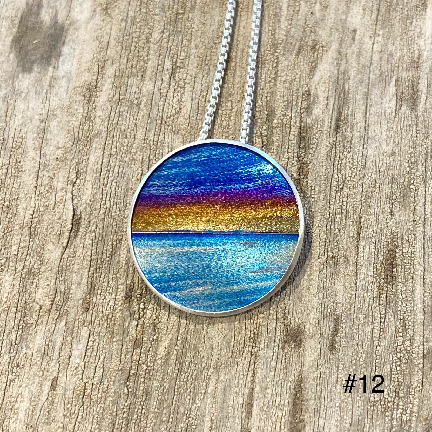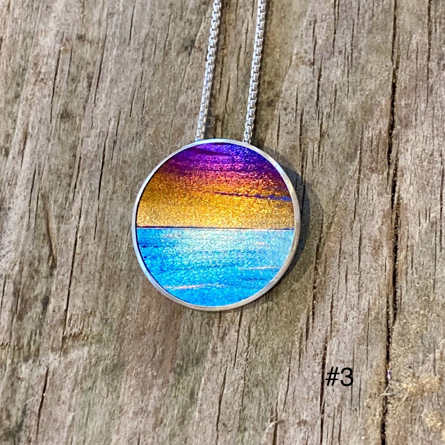 Titanium is carefully flame treated and etched to create a one of a kind "beach sunset" scene, then set into a sterling silver frame and suspended from an 18" sterling silver box chain. No two are ever alike - the necklaces shown here are the ones in stock in the store and images are updated as new deliveries arrive.