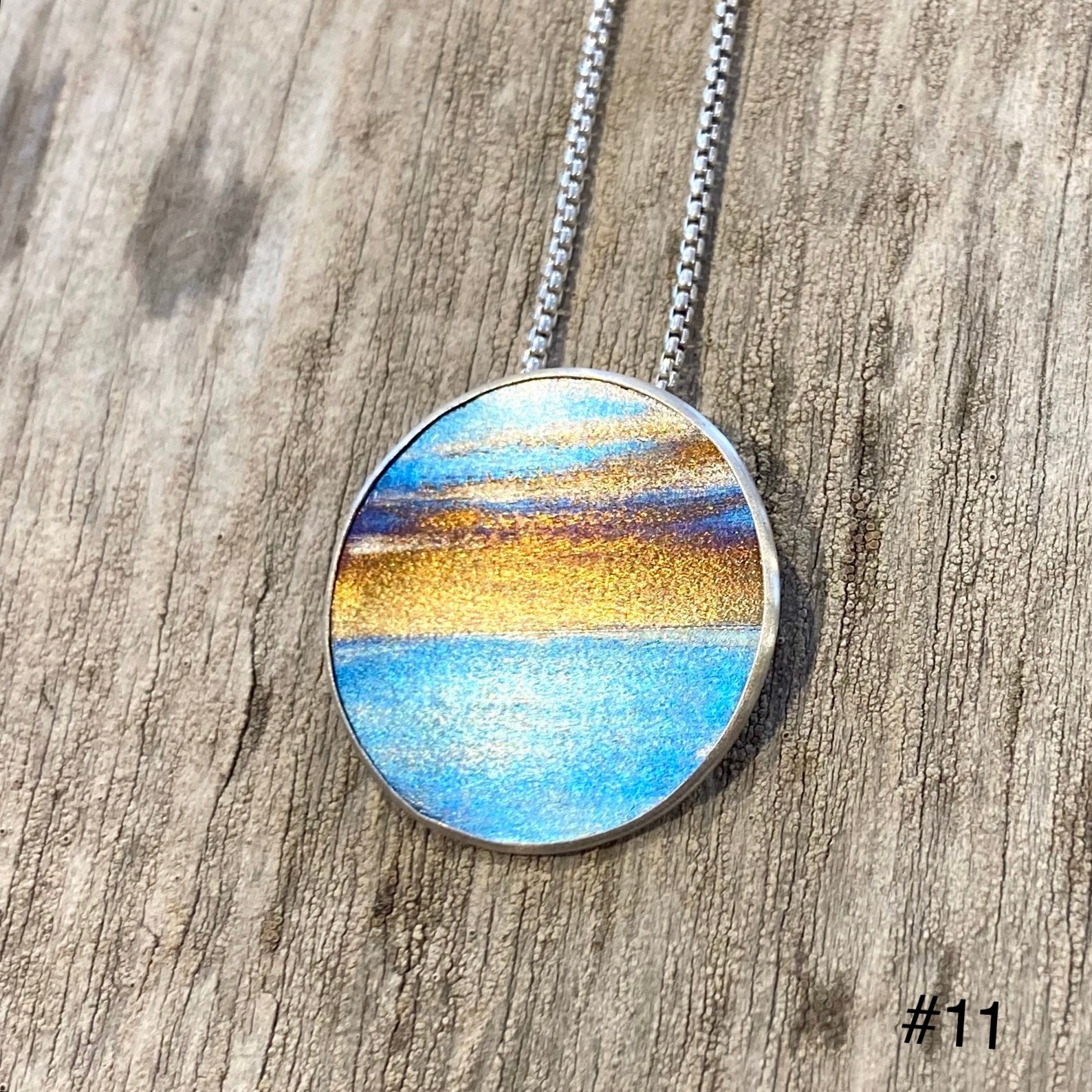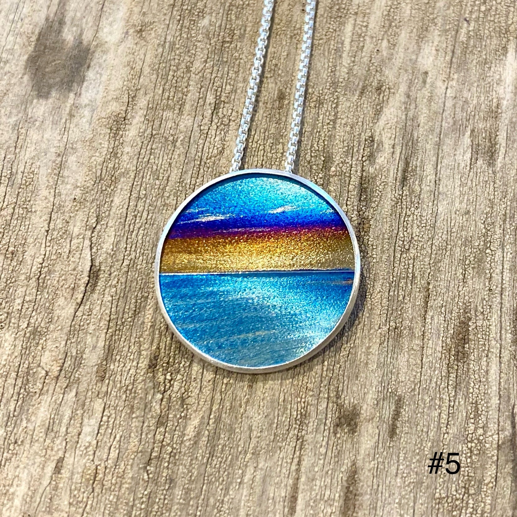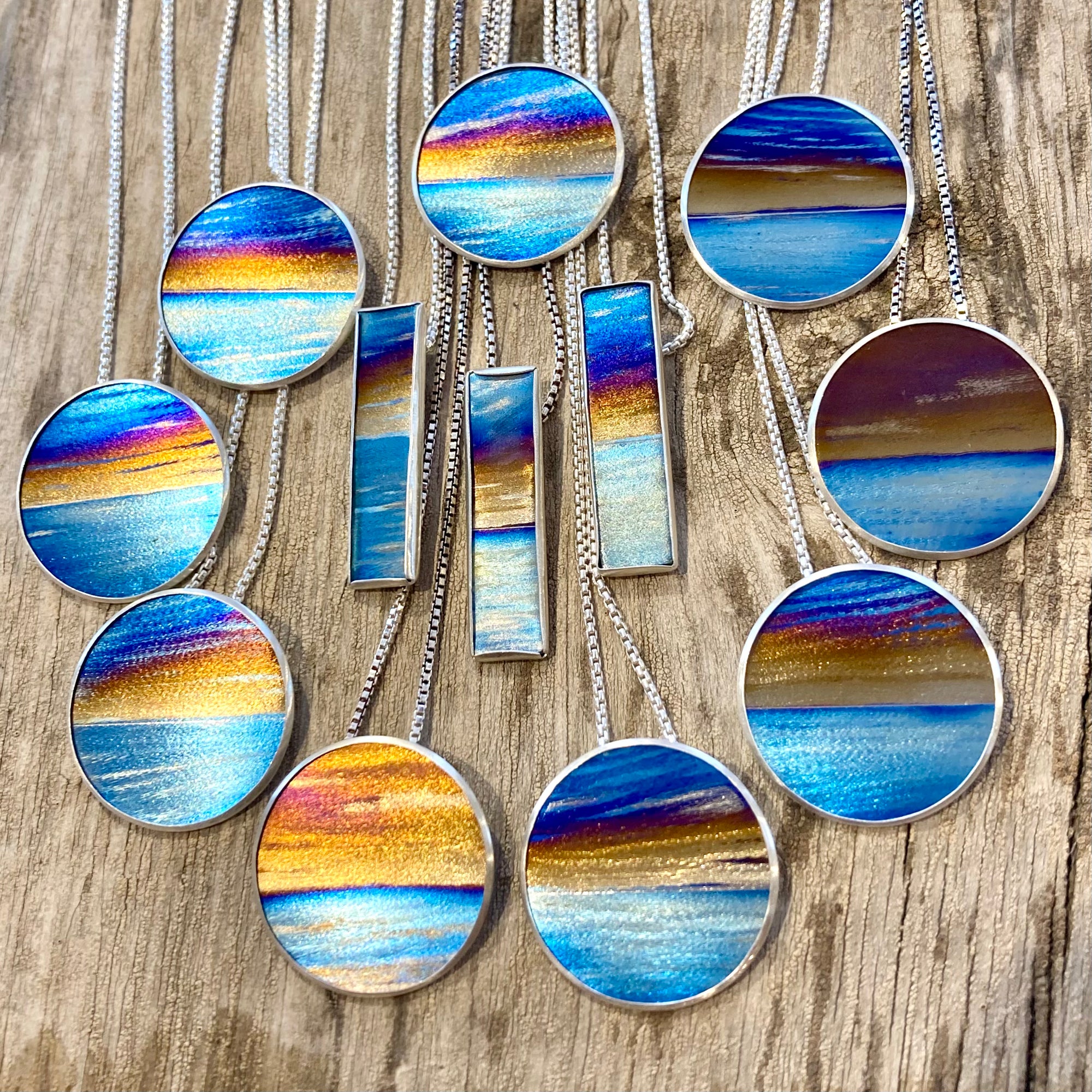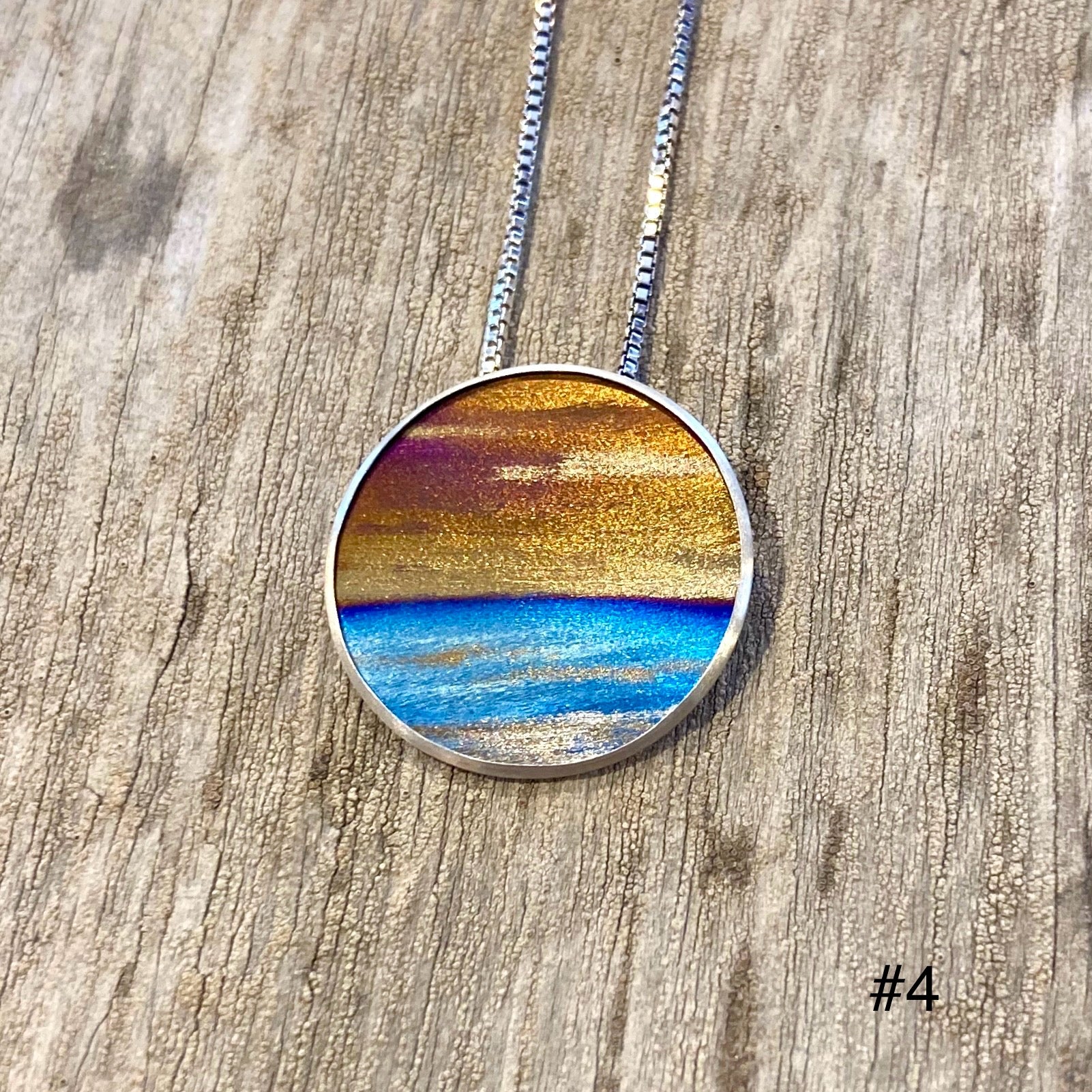 Titanium is carefully flame treated and etched to create a one of a kind "beach sunset" scene, then set into a sterling silver frame and suspended from an 18" sterling silver box chain. No two are ever alike - the necklaces shown here are the ones in stock in the store and images are updated as new deliveries arrive.