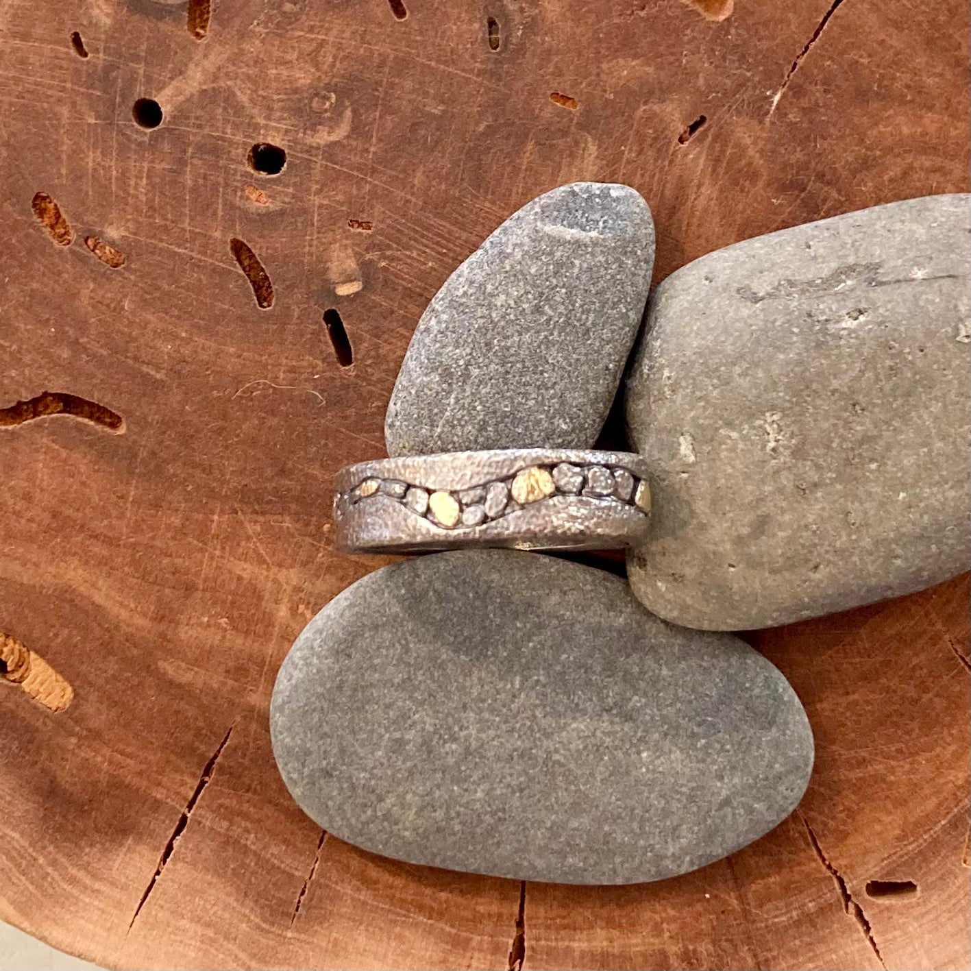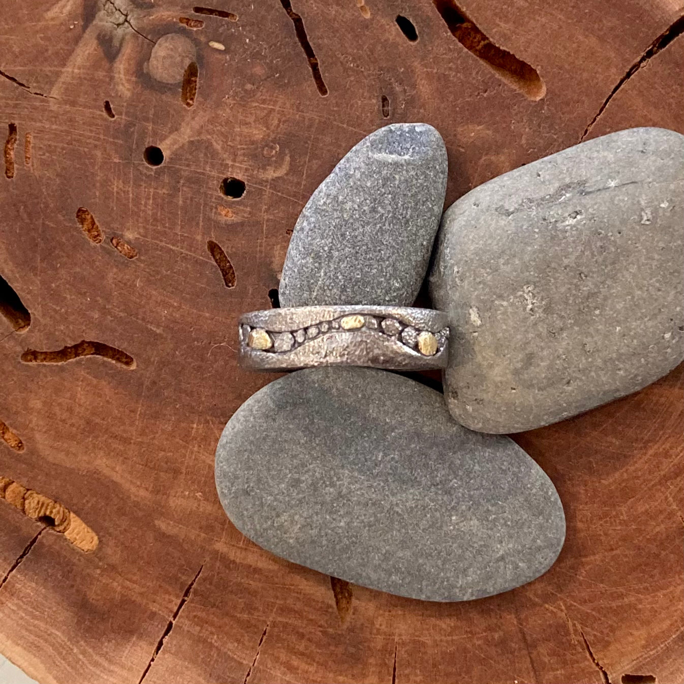 18K Gold and Sterling Silver River Pebbles Textured Oxidized Sterling Silver Stream Ring