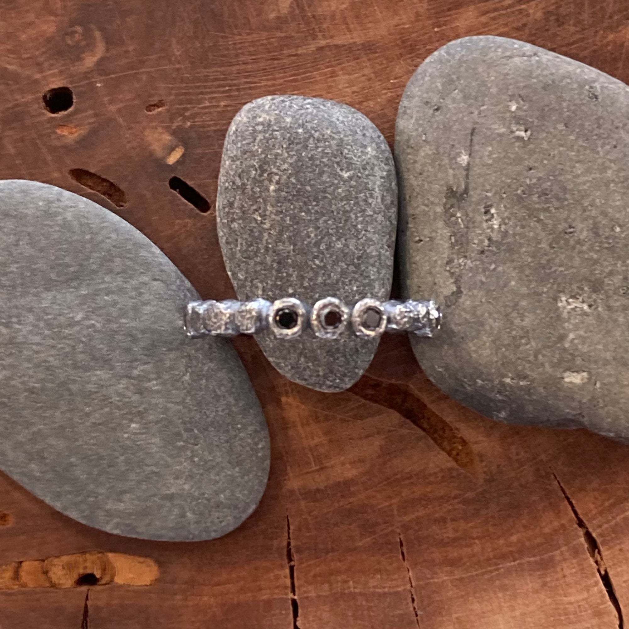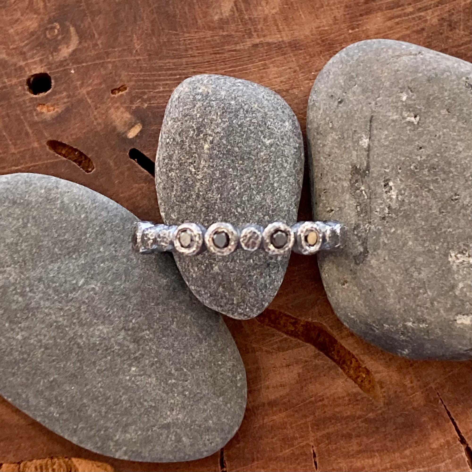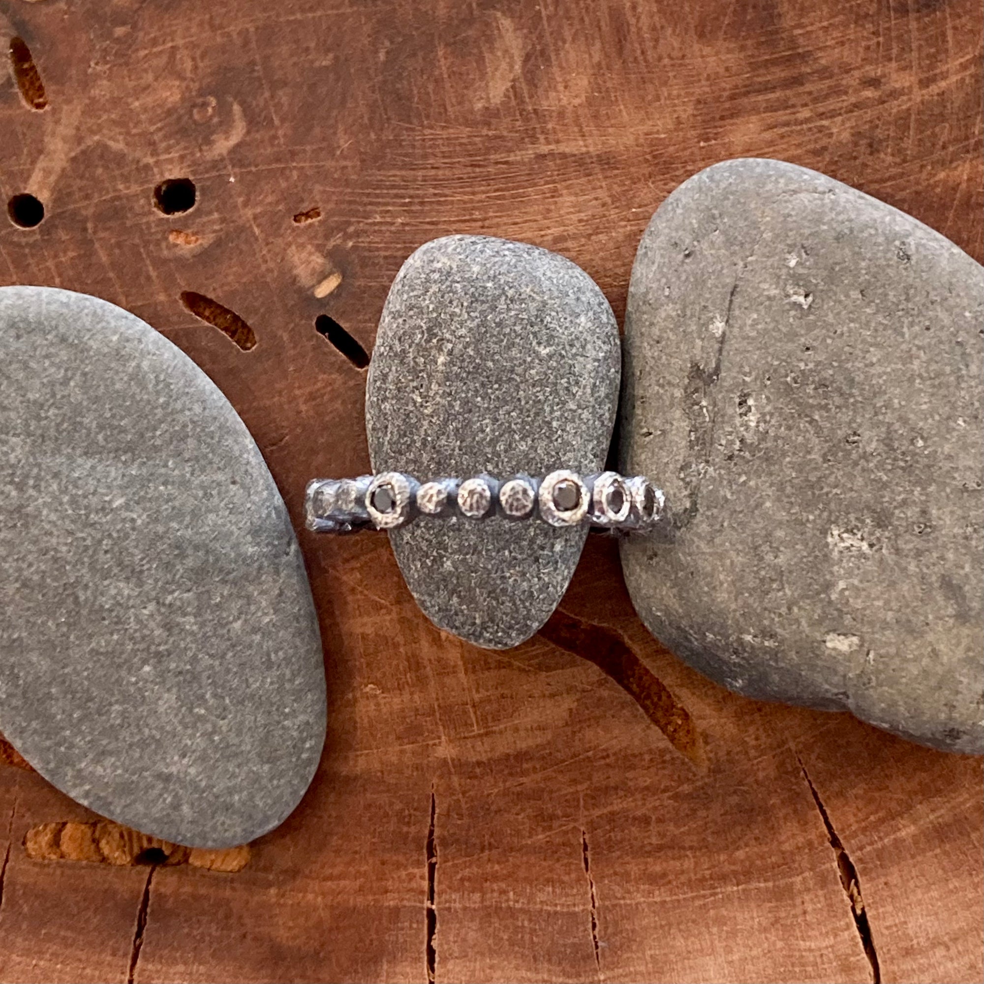 Eleven faceted black diamonds are scattered across this thin, textured oxidized sterling silver organic pebble band. Simply elegant on it's own or perfect when stacked with any of the other Mini Pebbles rings to create a more dramatic presentation.