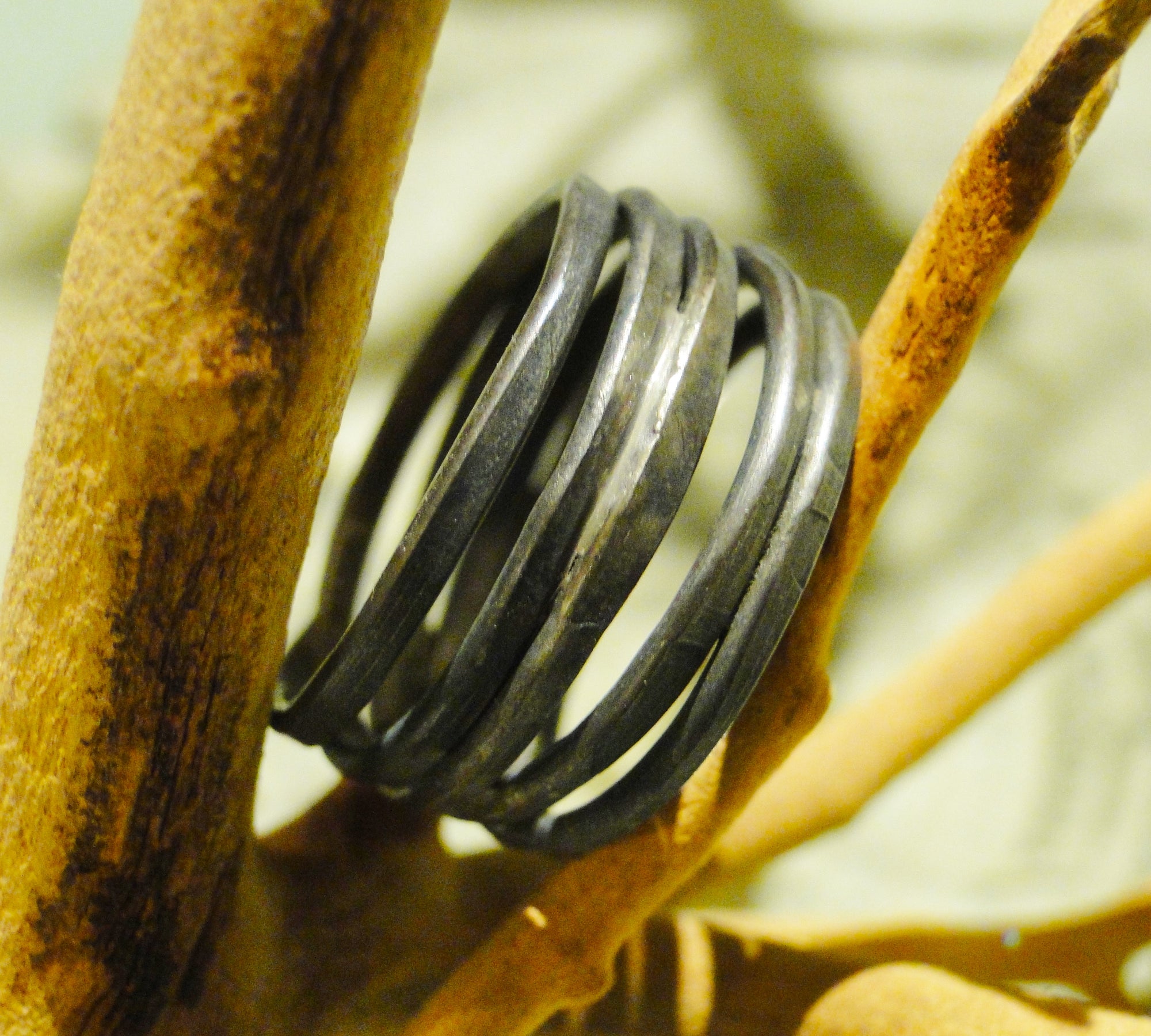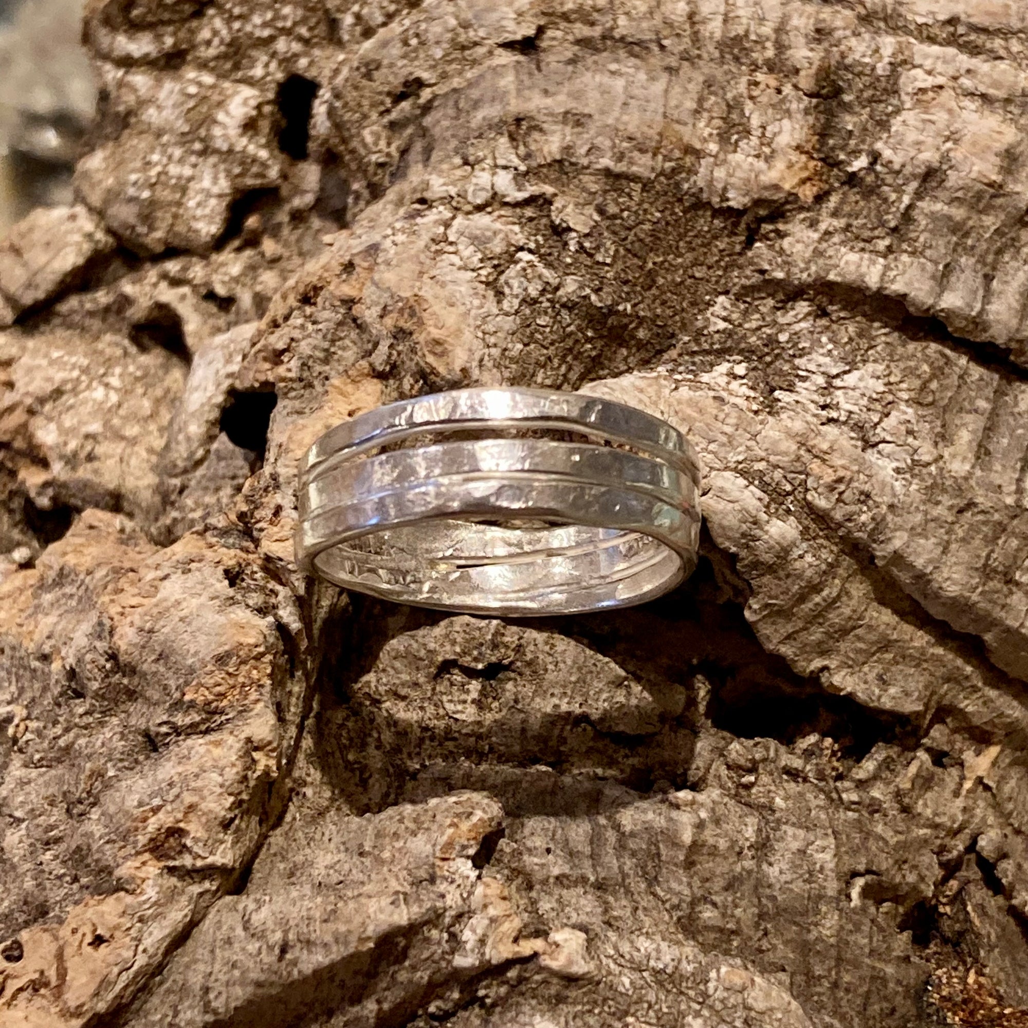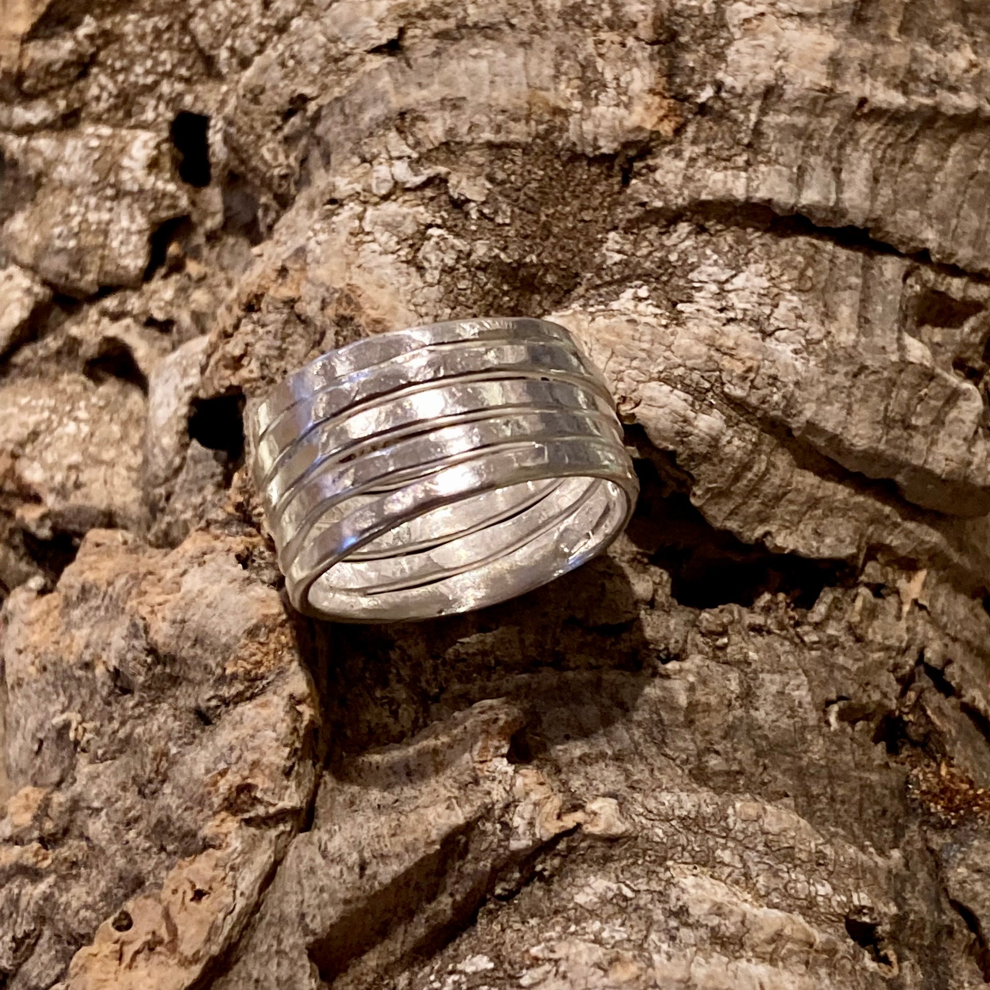 Hammered flat and coiled into a ring, this sterling silver wire is carefully soldered in just a few discreet, virtually invisible spots to create this unique and elegant band reminiscent of the bands on a barrel. A cooper is the person who makes barrels.