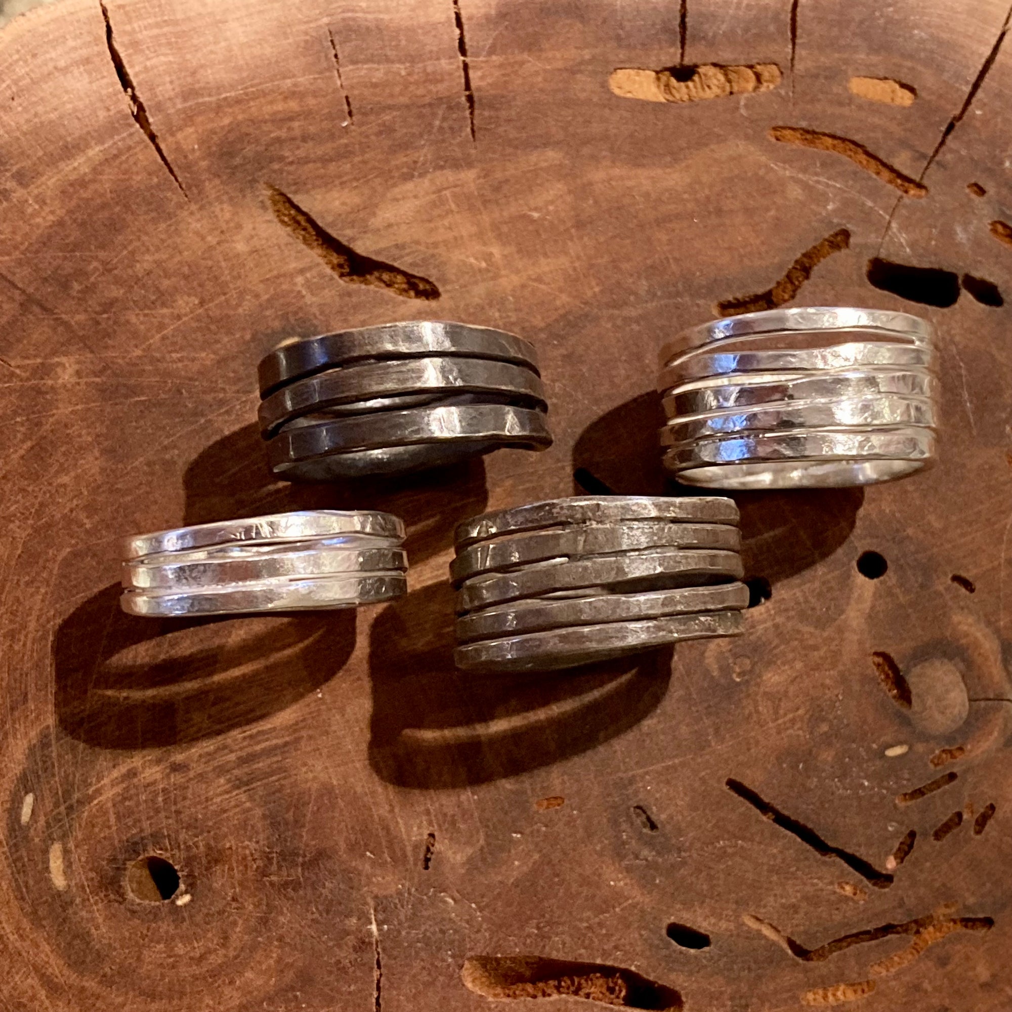 Wide rings are five bands which measure 12MM in width in most places, narrowing slightly at one point and are in stock in a size 9 (US).