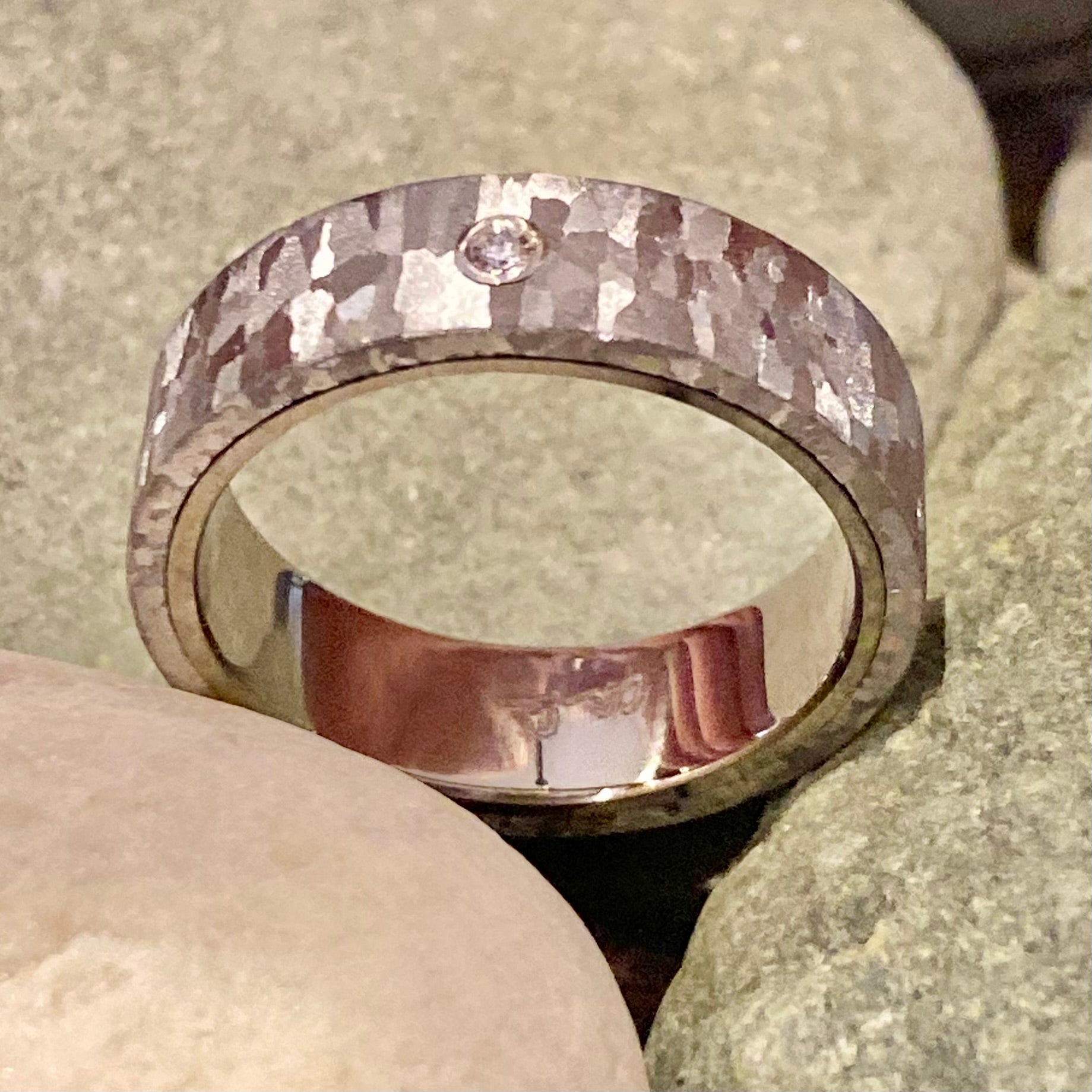 Crystalized stainless steel is wrapped around a polished band of palladium 500 and inset with a 1.7mm white diamond. With a flat profile and polished finish, this 6mm wide band is in stock in a size 8.5 but can be ordered in any size and customized any way you like.