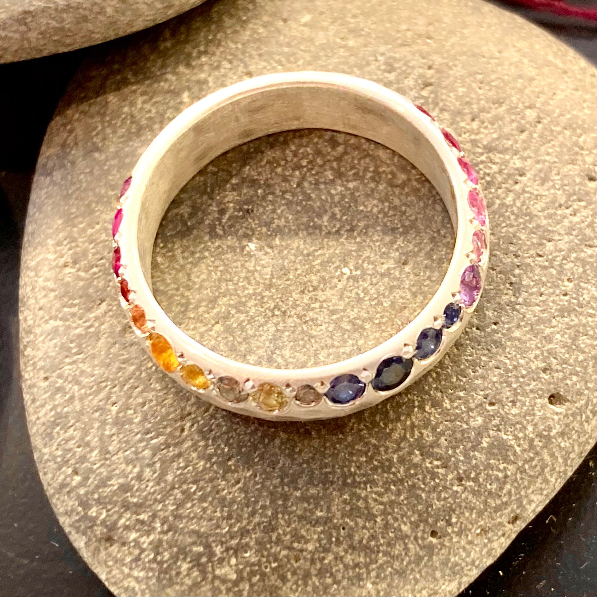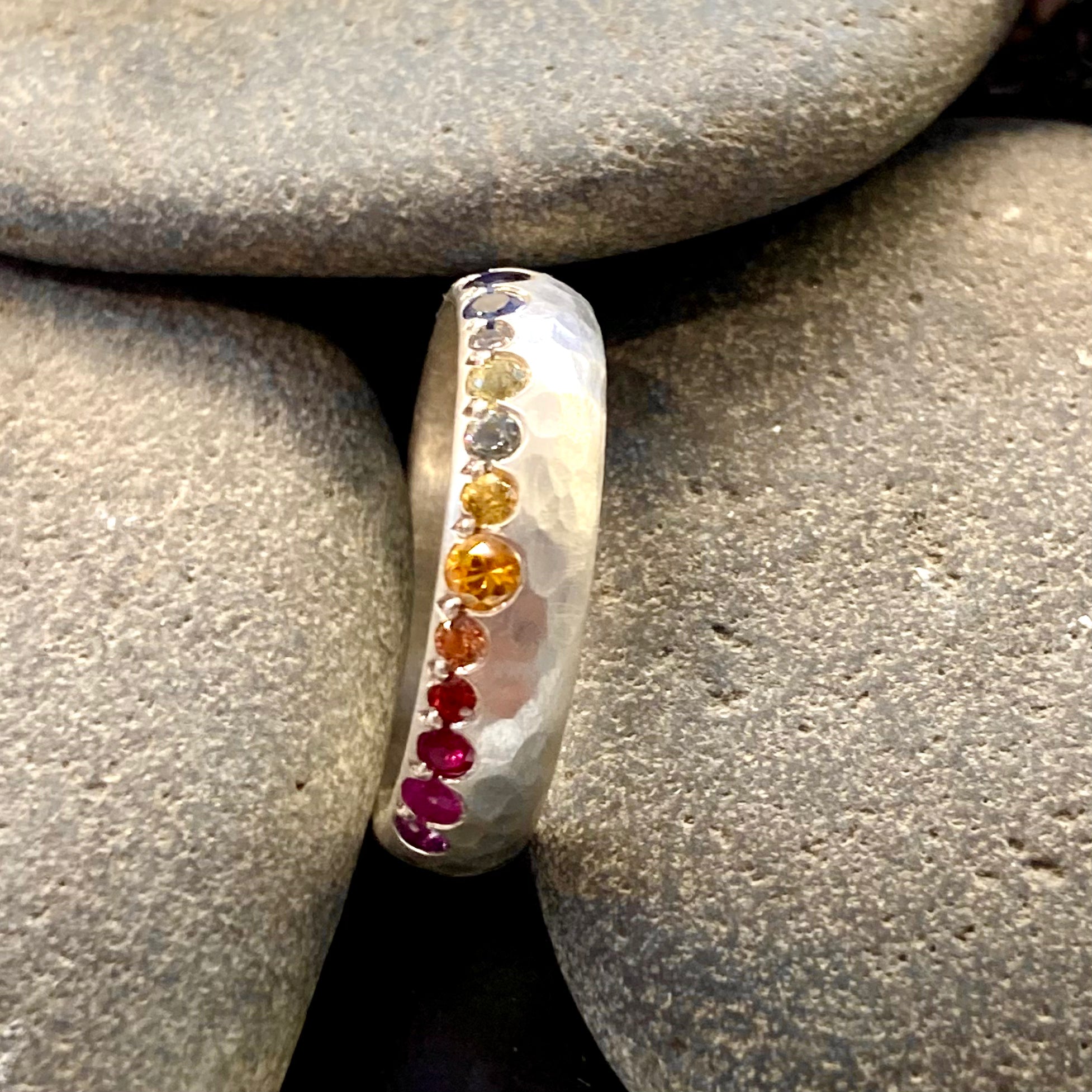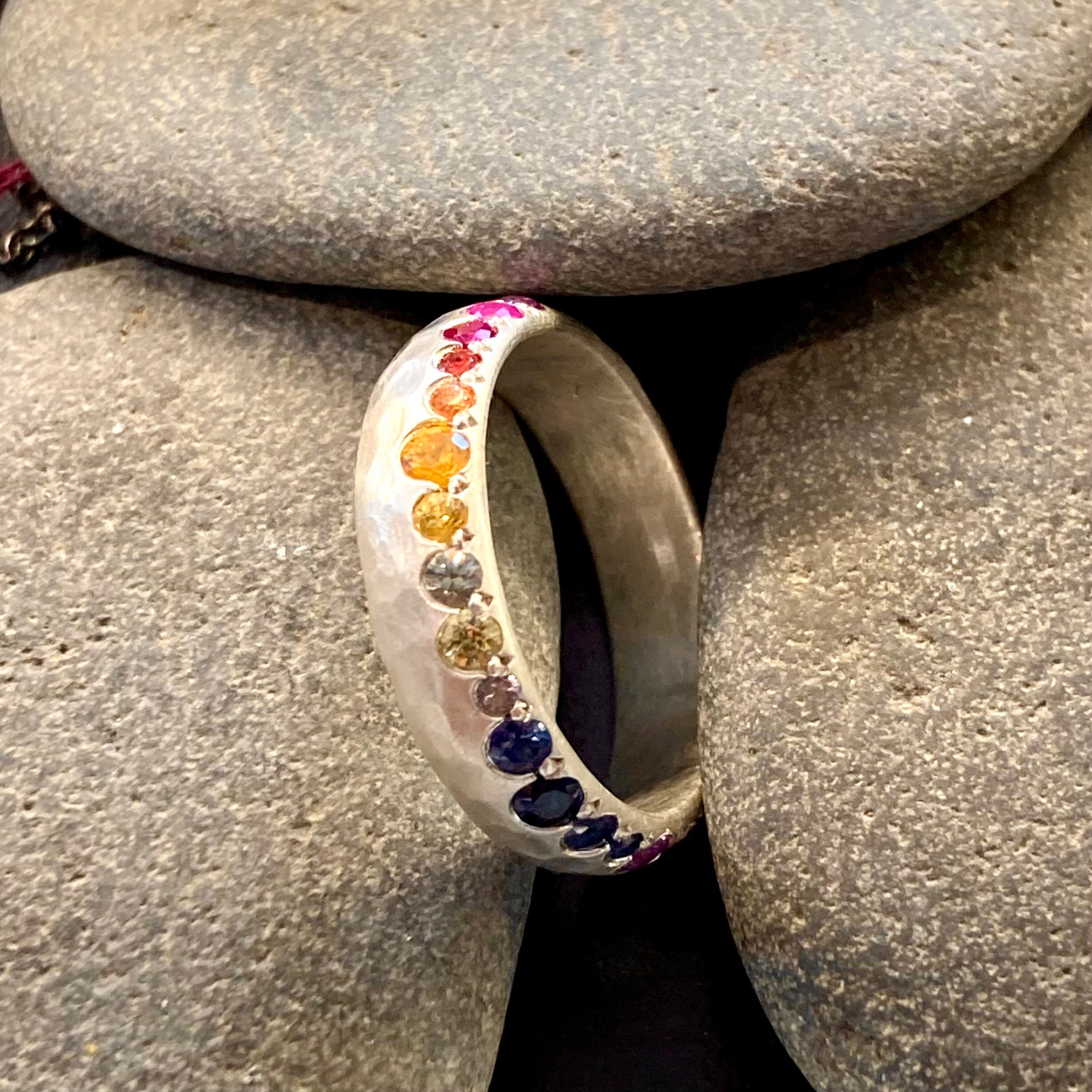 A rainbow of different color and size sapphires dance across the edge of this beautifully hand hammered sterling silver ring, custom made just for Arcadia. Designed so that the entire rainbow can easily be seen while being worn, the graduated sizing of the stones also creates more visual interest and individuality, as each ring will be different.