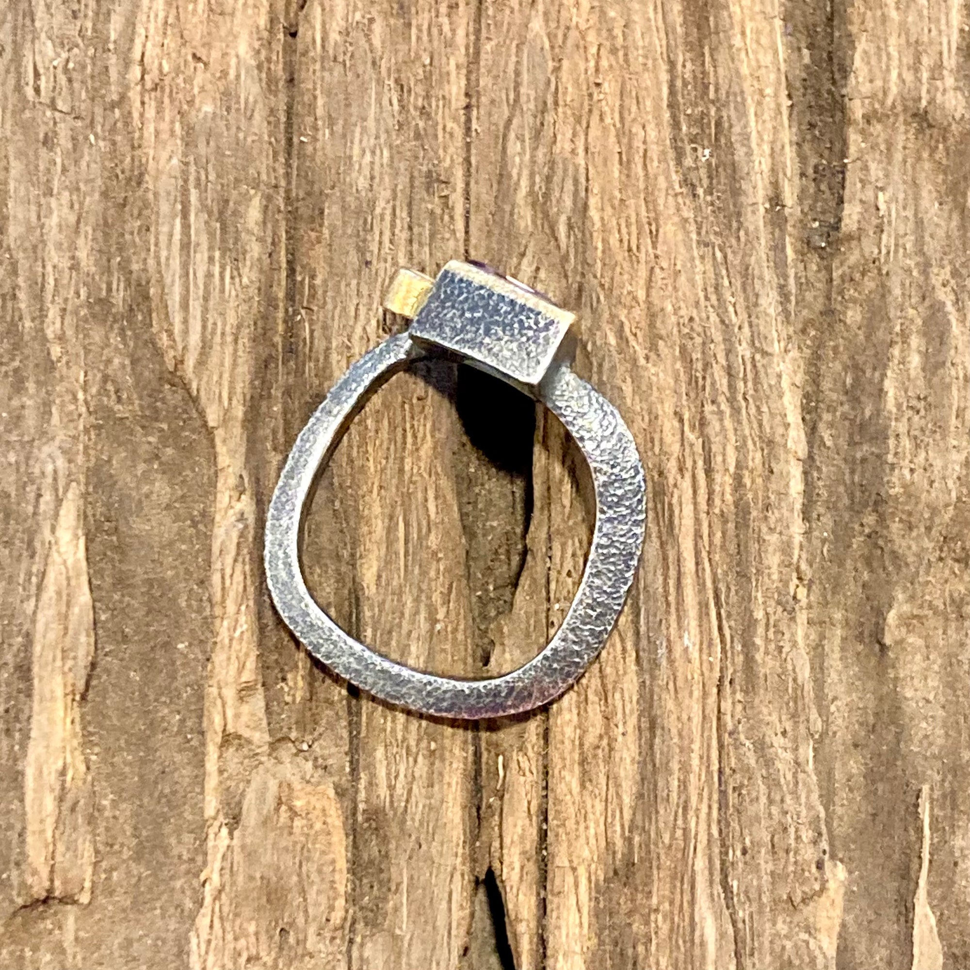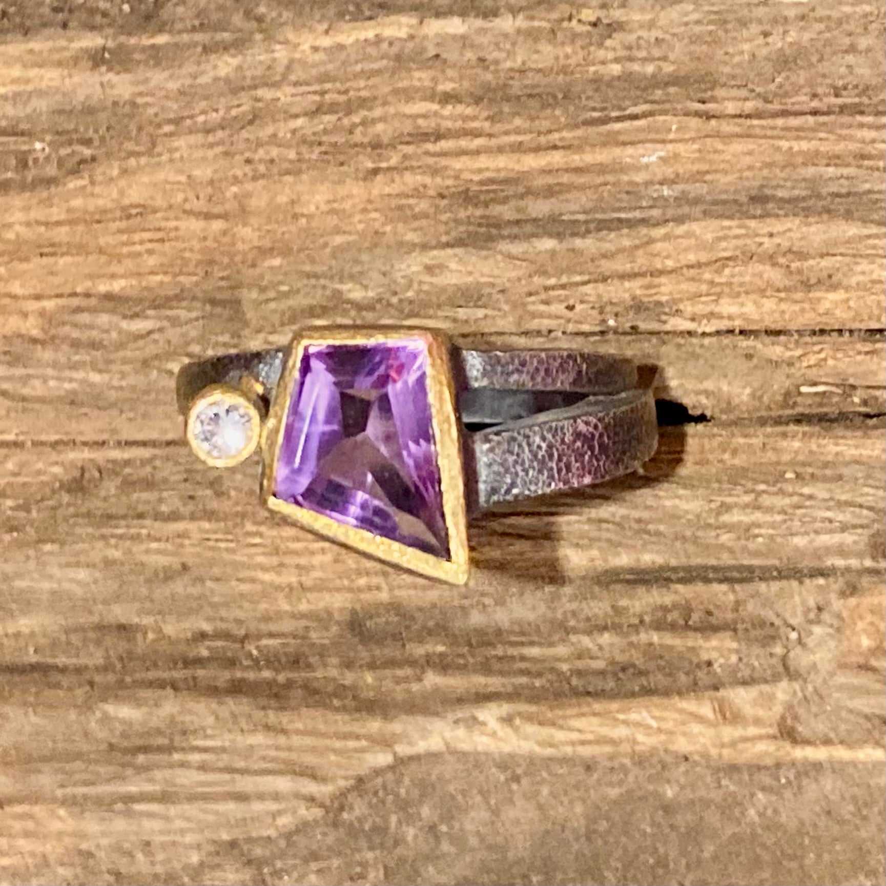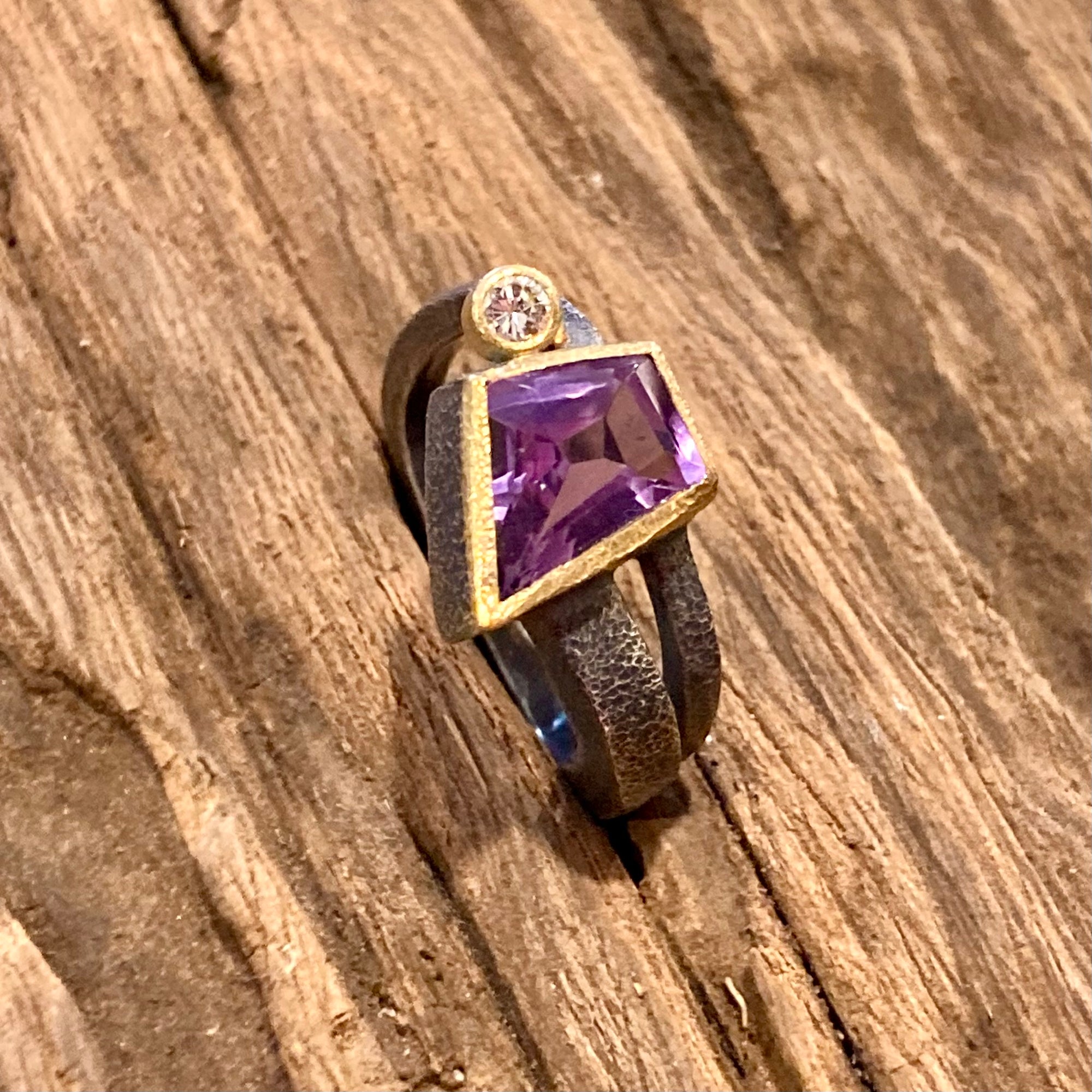 A beautifully faceted amethyst is offset with a faceted diamond, both set within 18K gold settings on a carefully shaped square bar of textured oxidized sterling silver to create this unusual and unique ring. One of a kind.