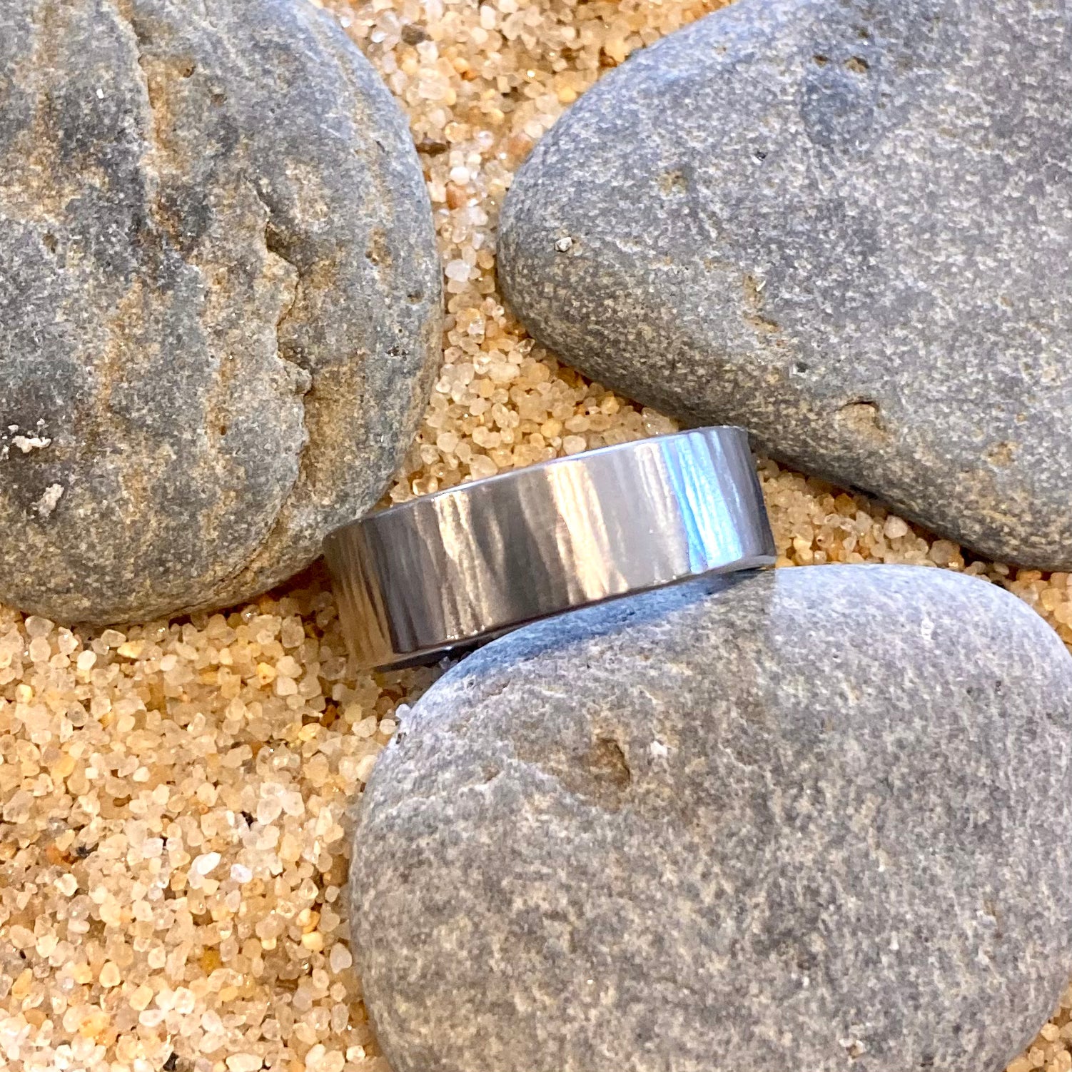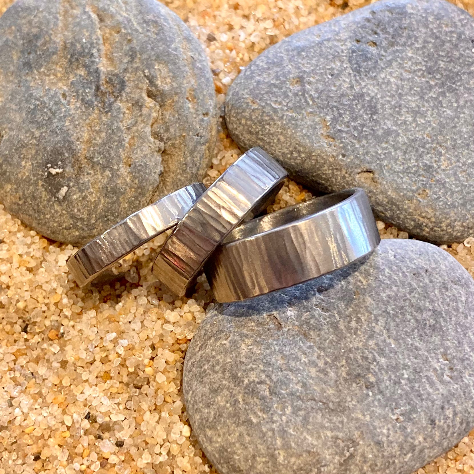 Rings measure either 3mm width, in stock in size 7, 5mm width, in stock in size 8.25, and in 7mm width, in stock in size 9.5, but can be ordered in any size quickly (typically less than 2 weeks).