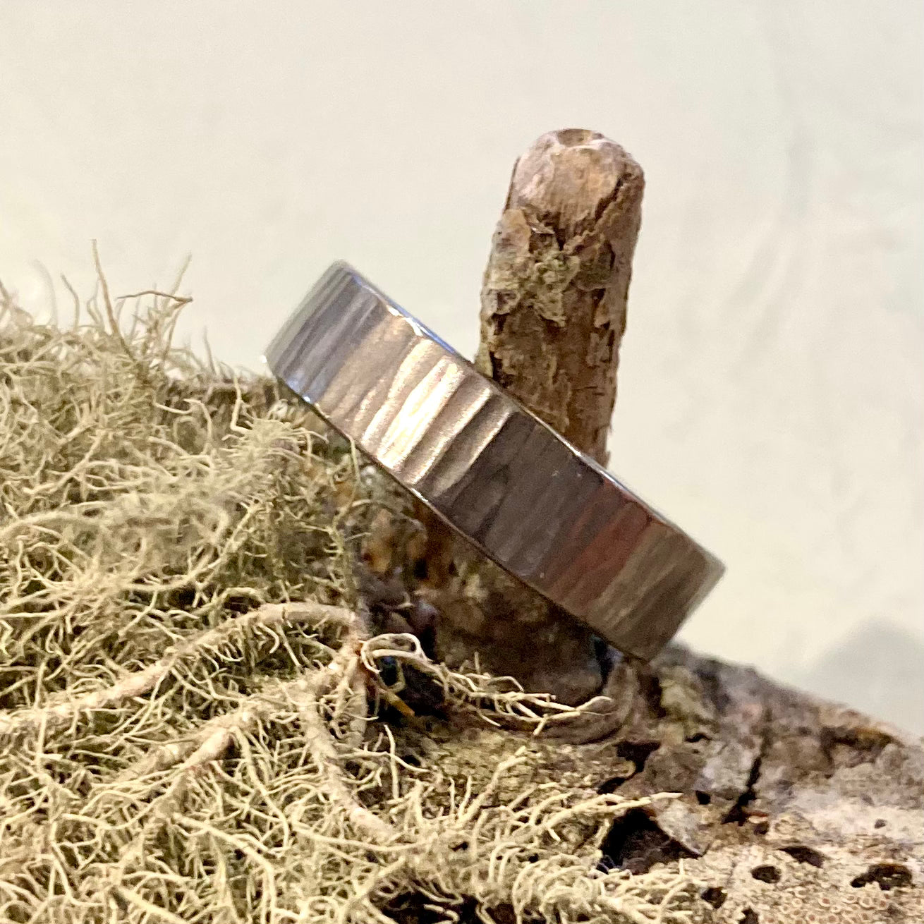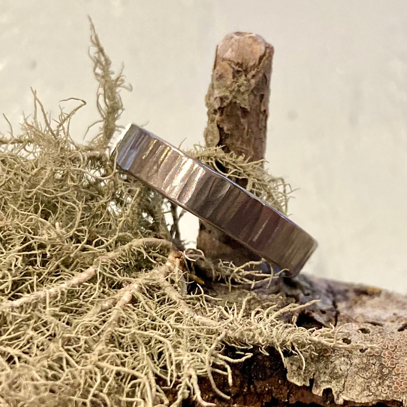 Hand hammered to create a subtle but definite texture, reflective without being polished, this is the sort of ring that will probably provoke envious questions...