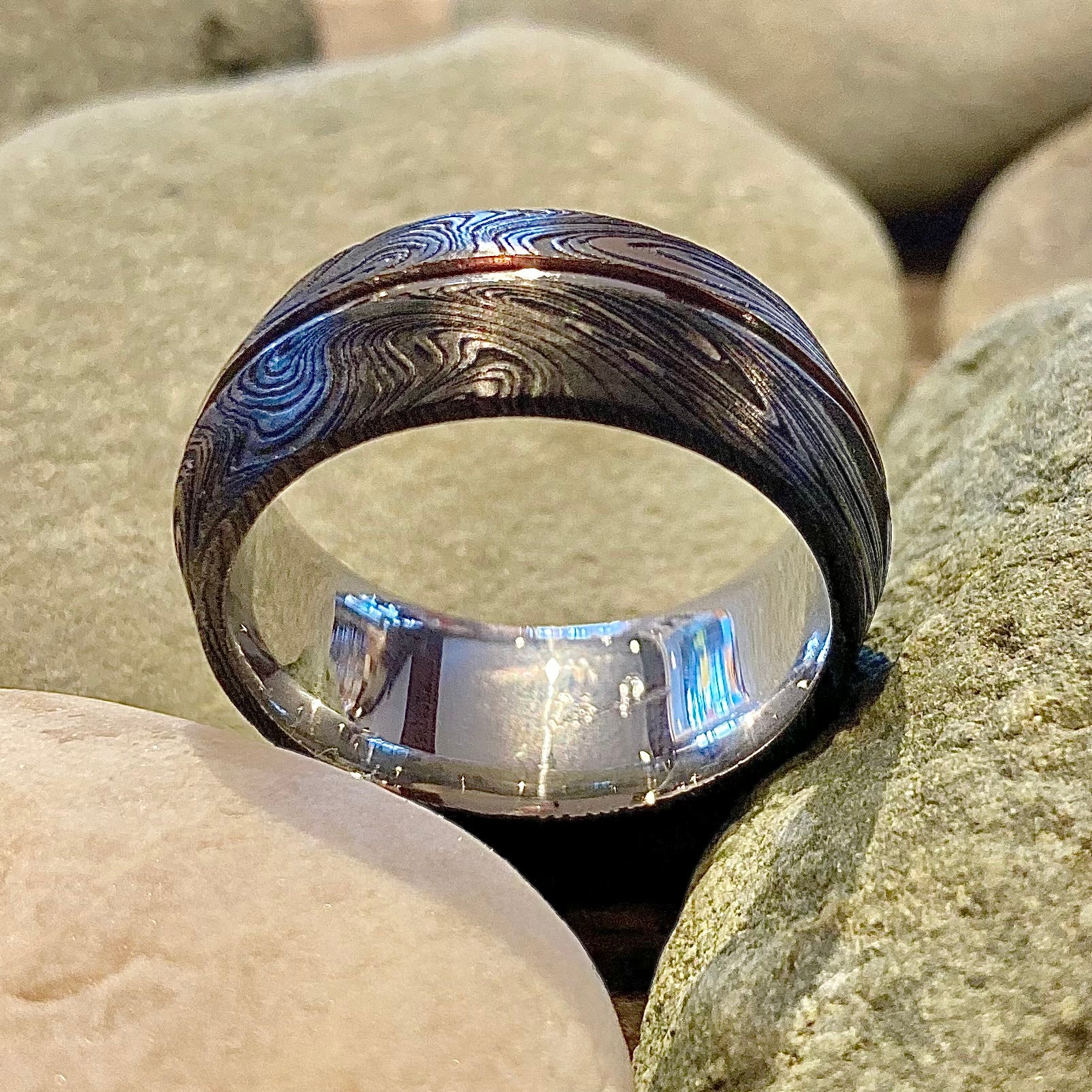 Heavily oxidized and etched Damascus steel is inlaid with a 1mm ring of palladium 500 through the center of the ring and in the interior, with the sharp contrast of the dark vs white of the two metals highlighted by the curved profile of the ring and the texture of the steel vs the smooth finish of the palladium.