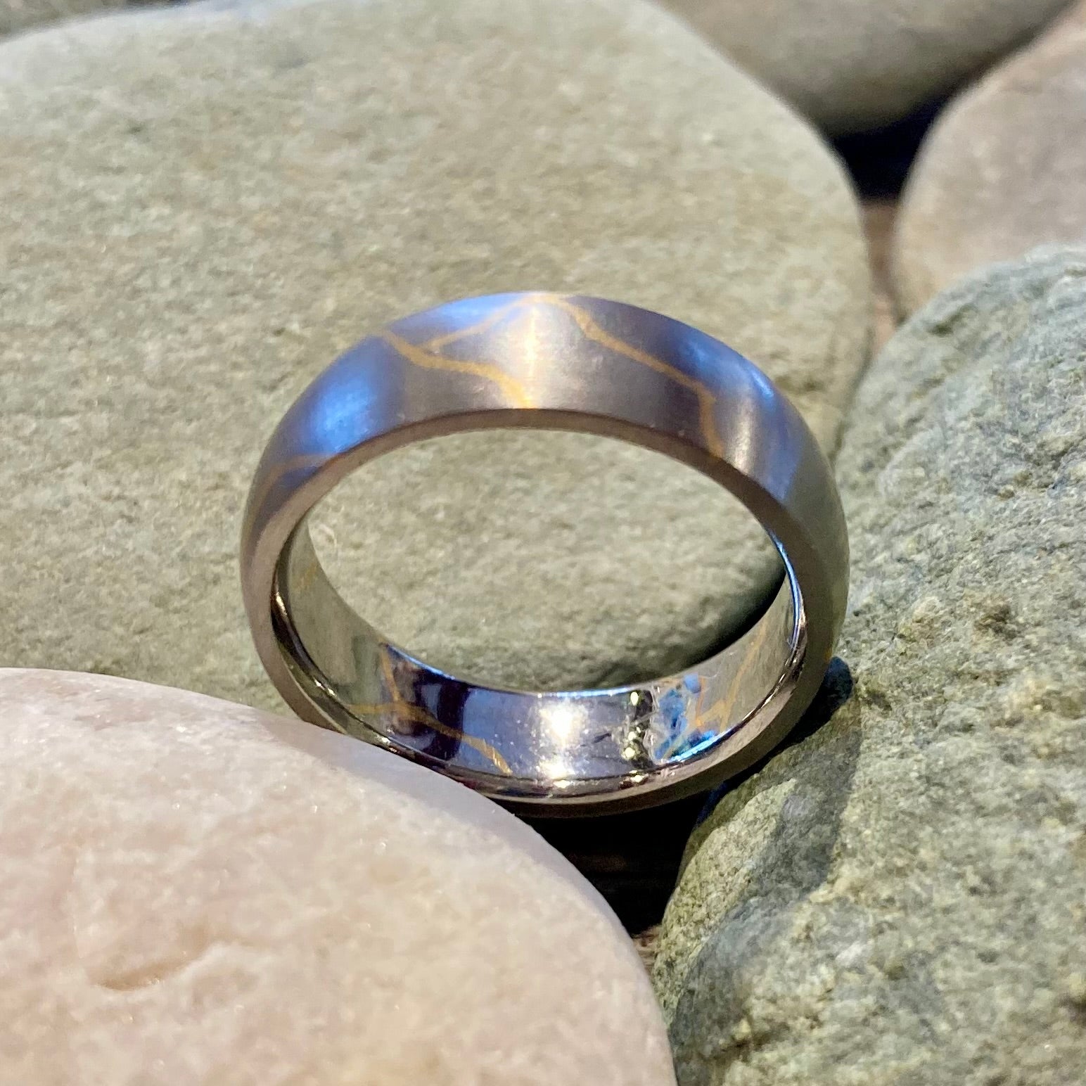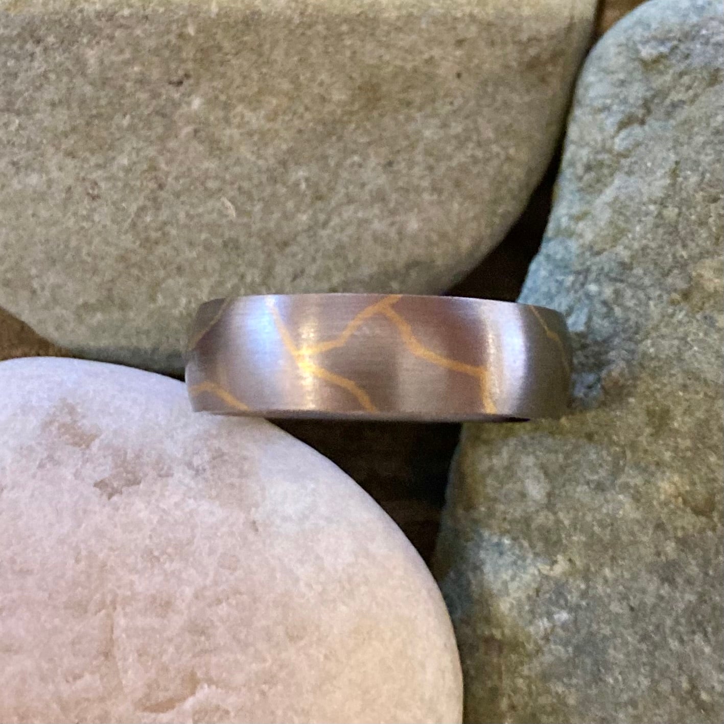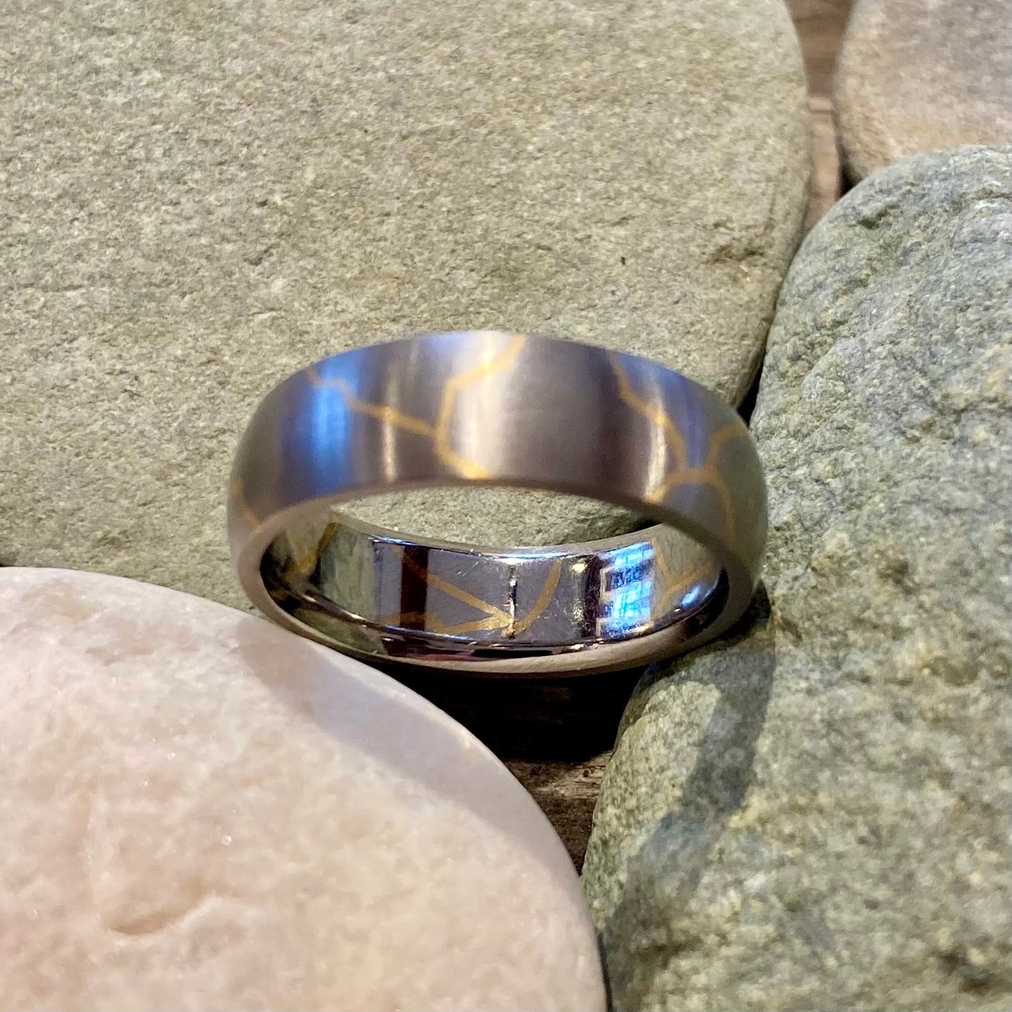 Kintsugi is the ancient Japanese art of reassembling broken pottery with a lacquer combined with powdered gold to create a beautiful, new ceramic piece that is more beautiful than it was originally. This ring is created using palladium 500 with veins of 24K gold running through and across the entire ring in a beautiful expression of this art.