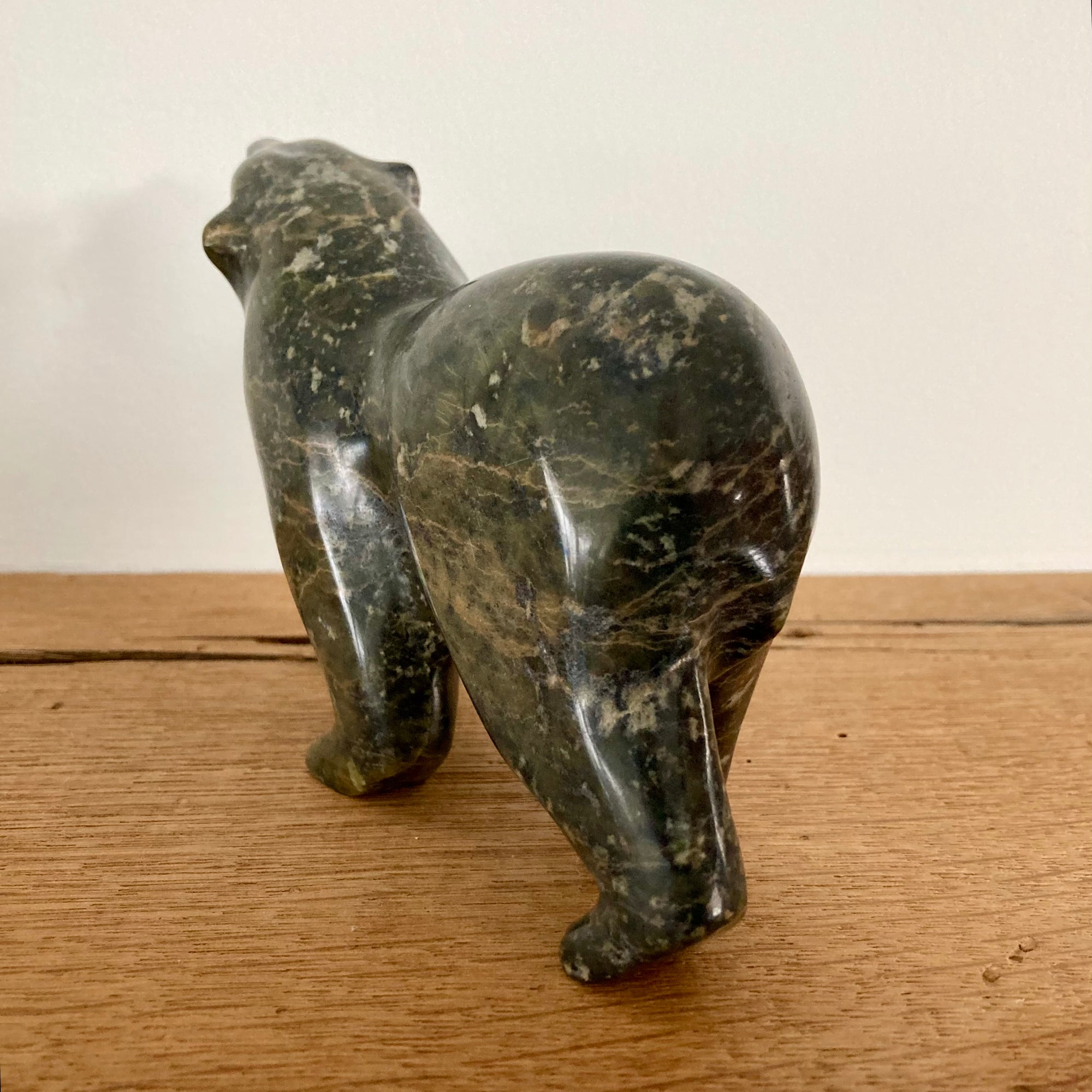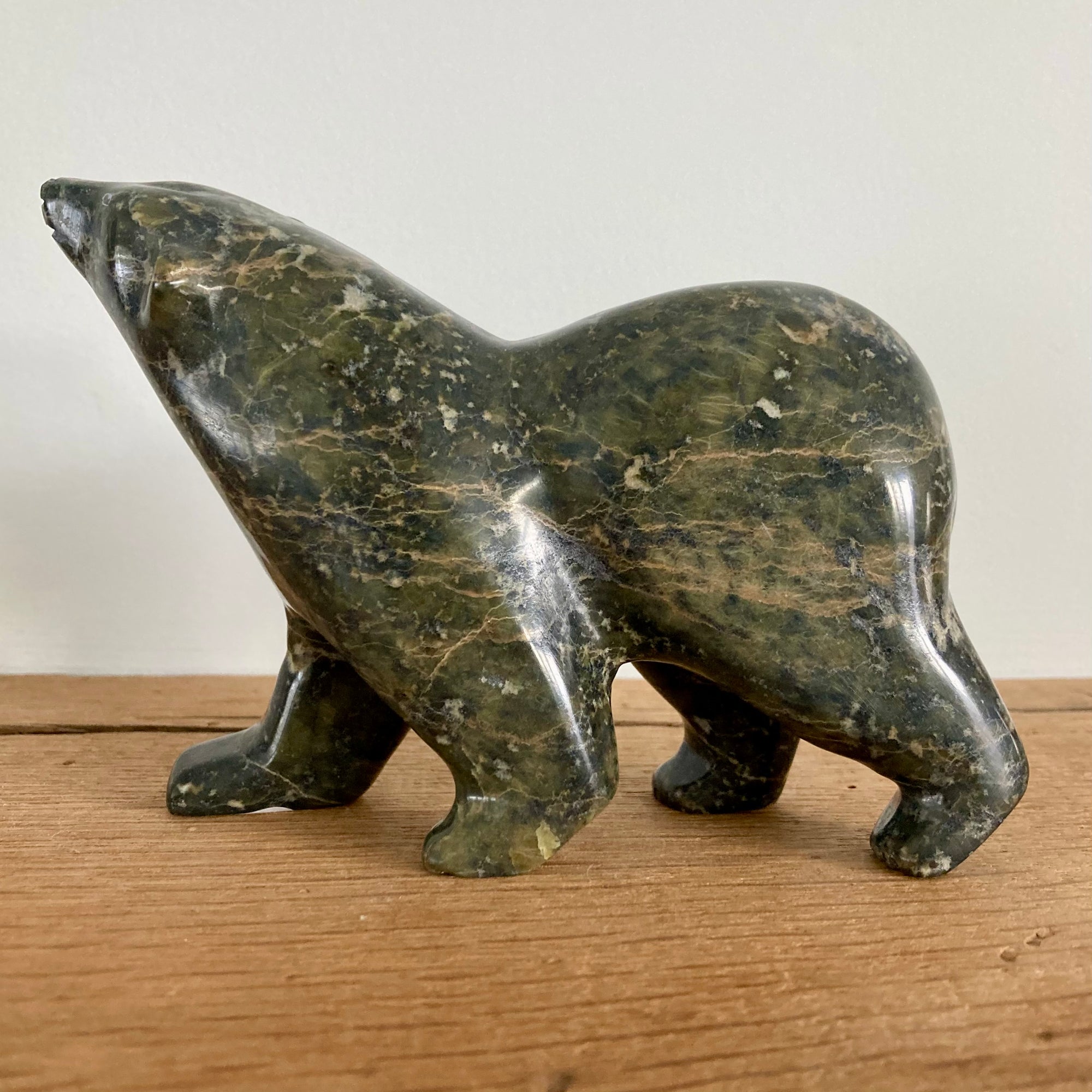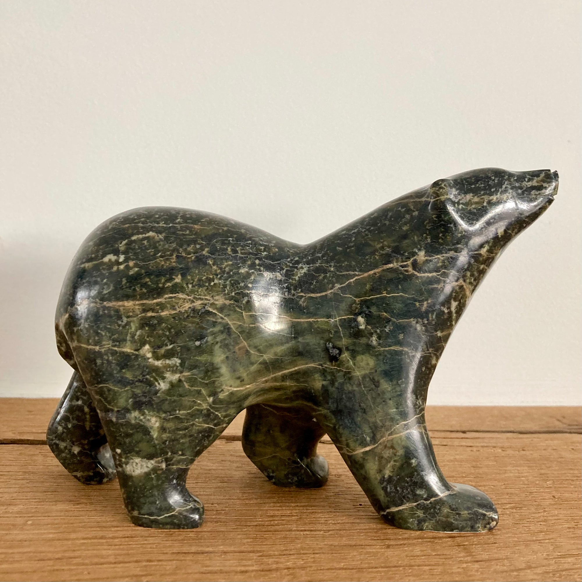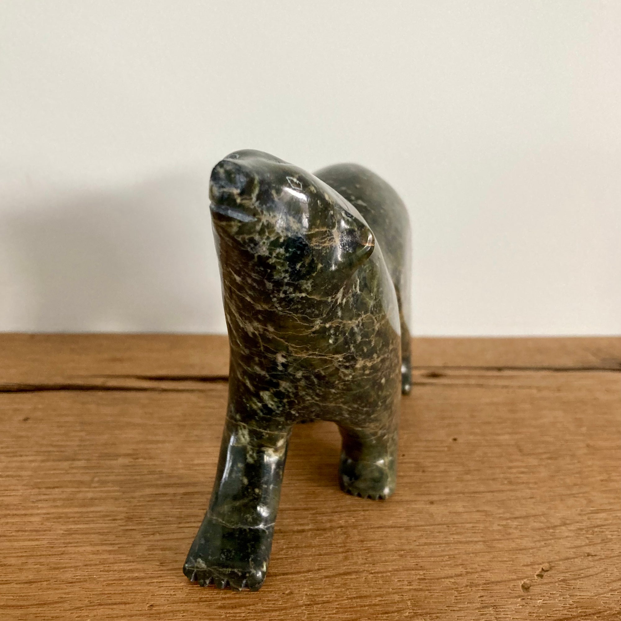 Hand carved by master artists of the First Nation Inuit community of Cape Dorset, Nunavut, in the Northwest Passages of the arctic region of Canada, this bear is made of serpentinite or soapstone.