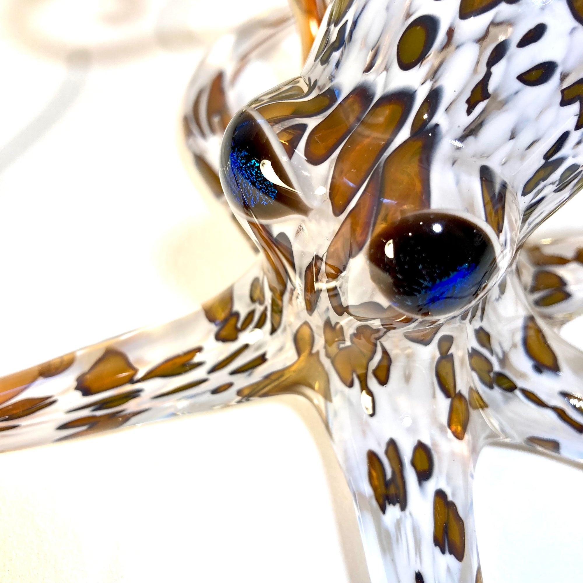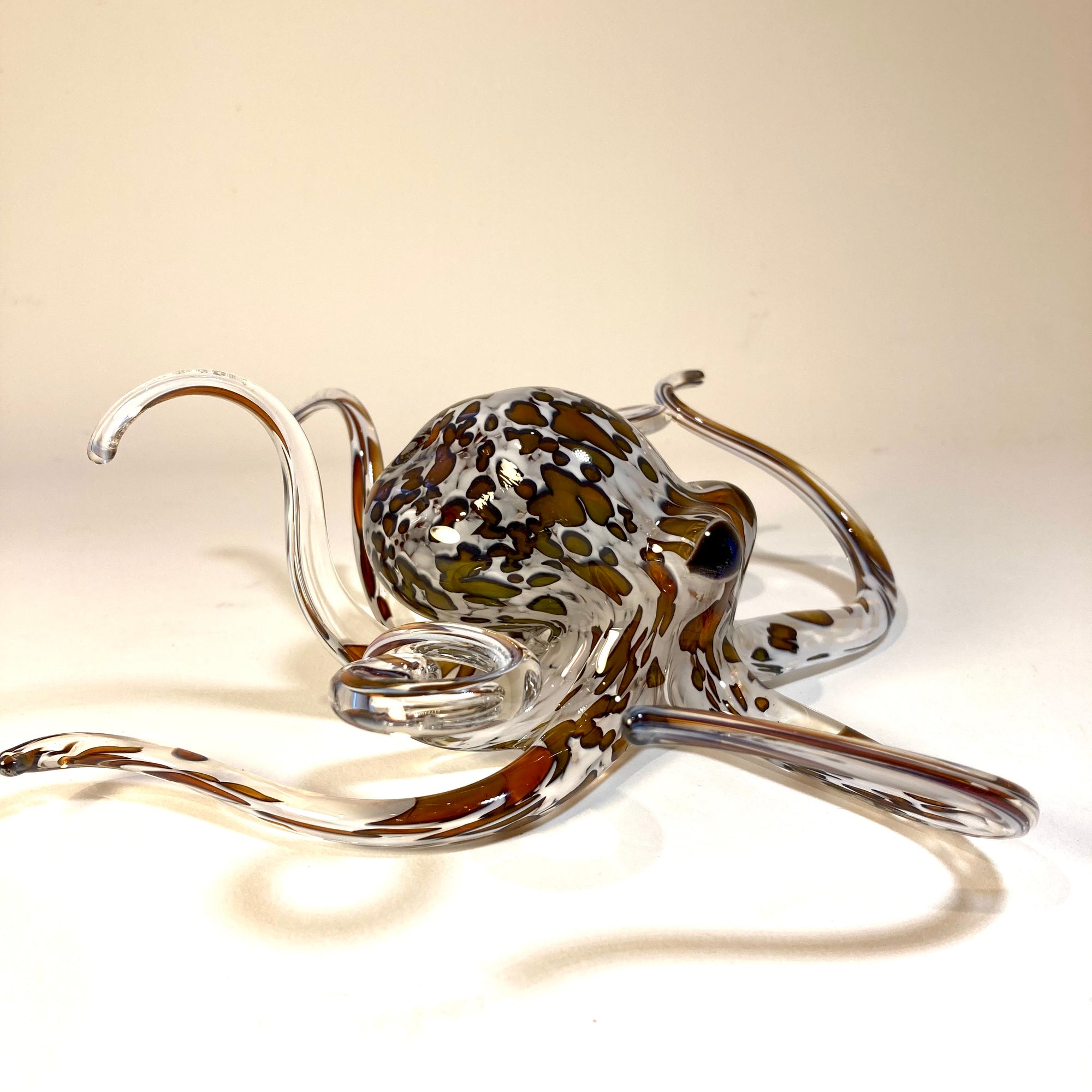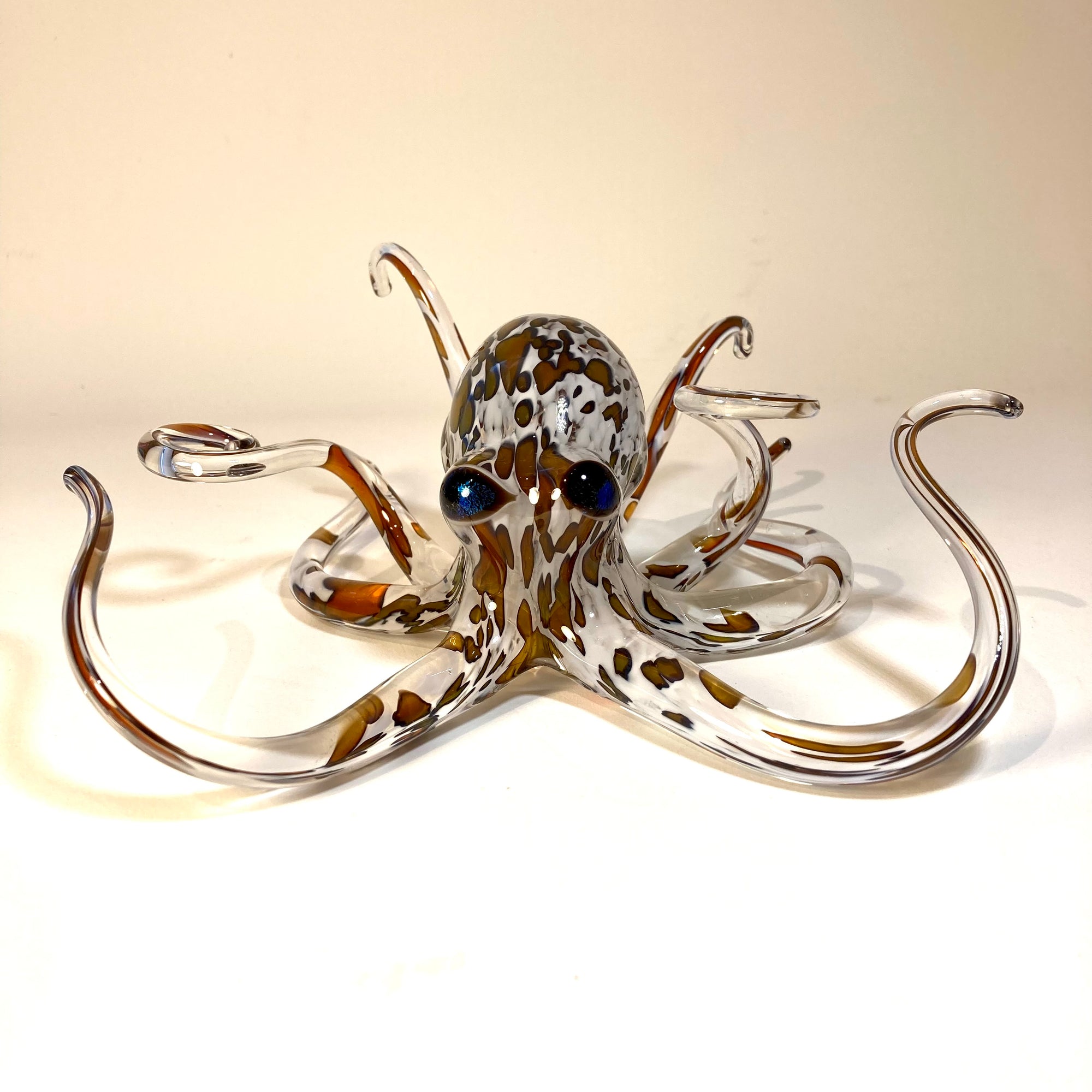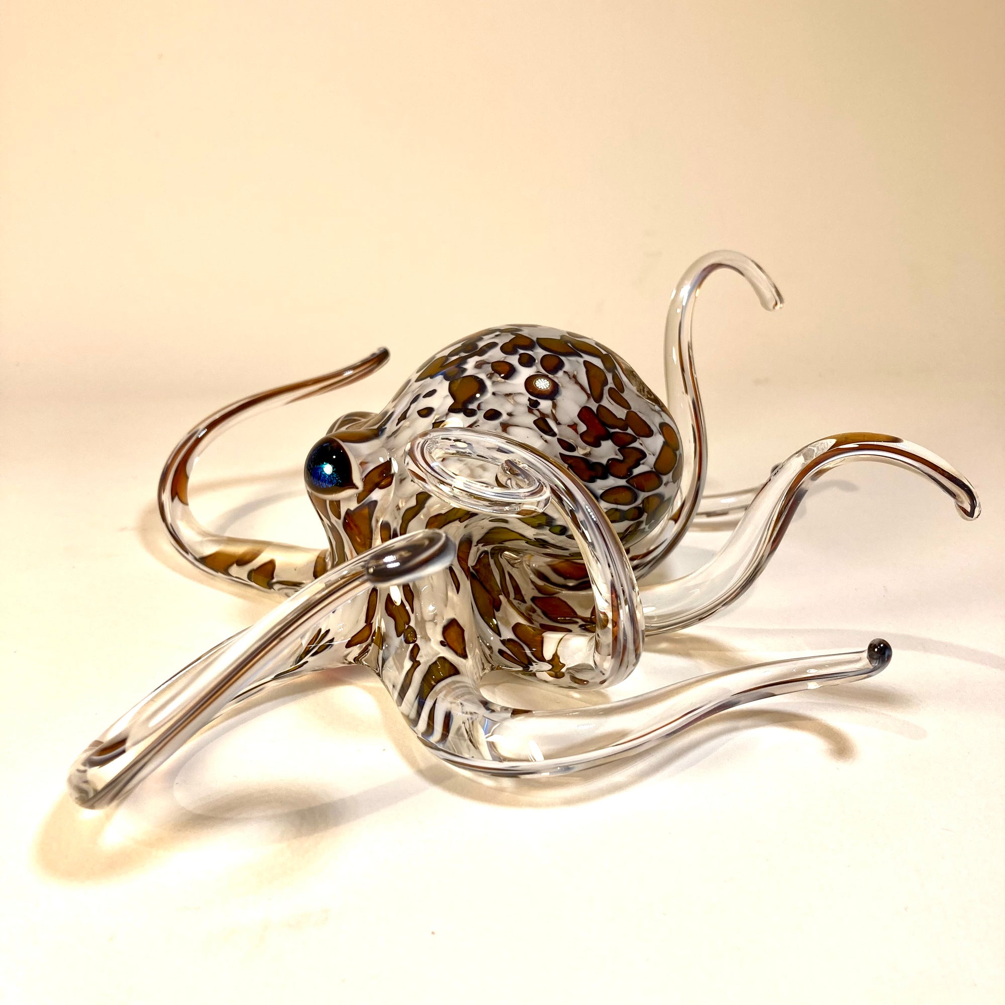 Earth tone and black spots run through this gorgeous piece against an opaline white background, an extraordinarily lifelike combination of colors that makes this octopus come to life. The glittering dichroic glass eyes makes this octopus seem ready to crawl away at a moment's notice.