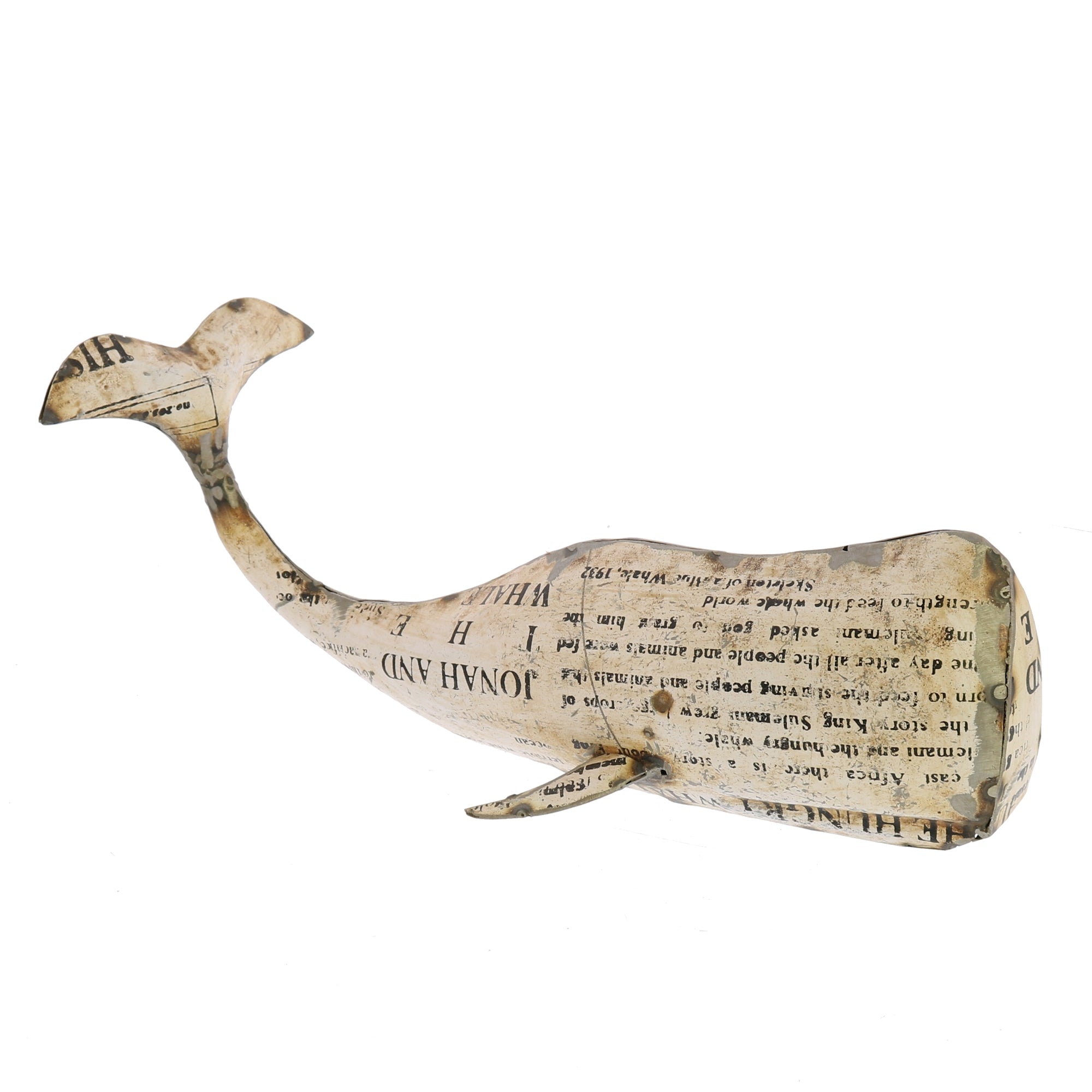 Made from reclaimed metal from old industrial drums, this perfect desk piece is covered in text from nautical themed literature. No two are ever alike, just like the real whales.