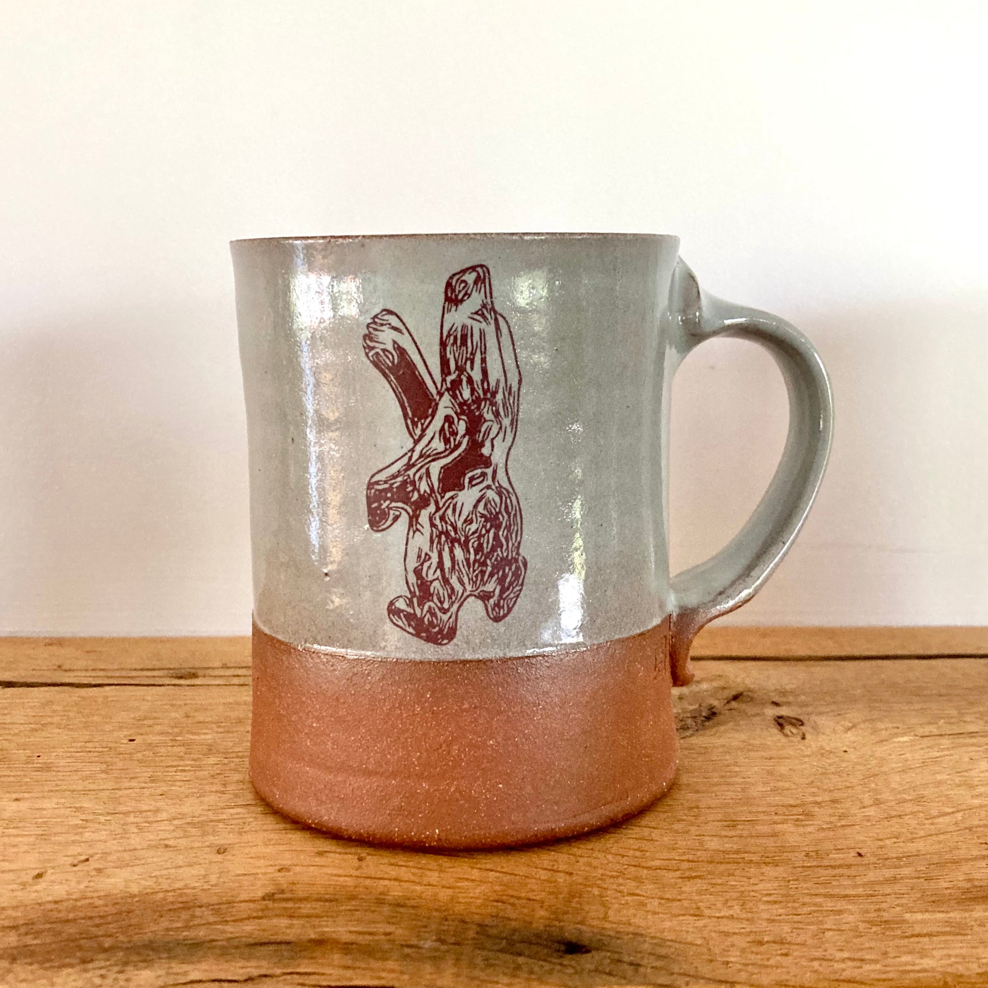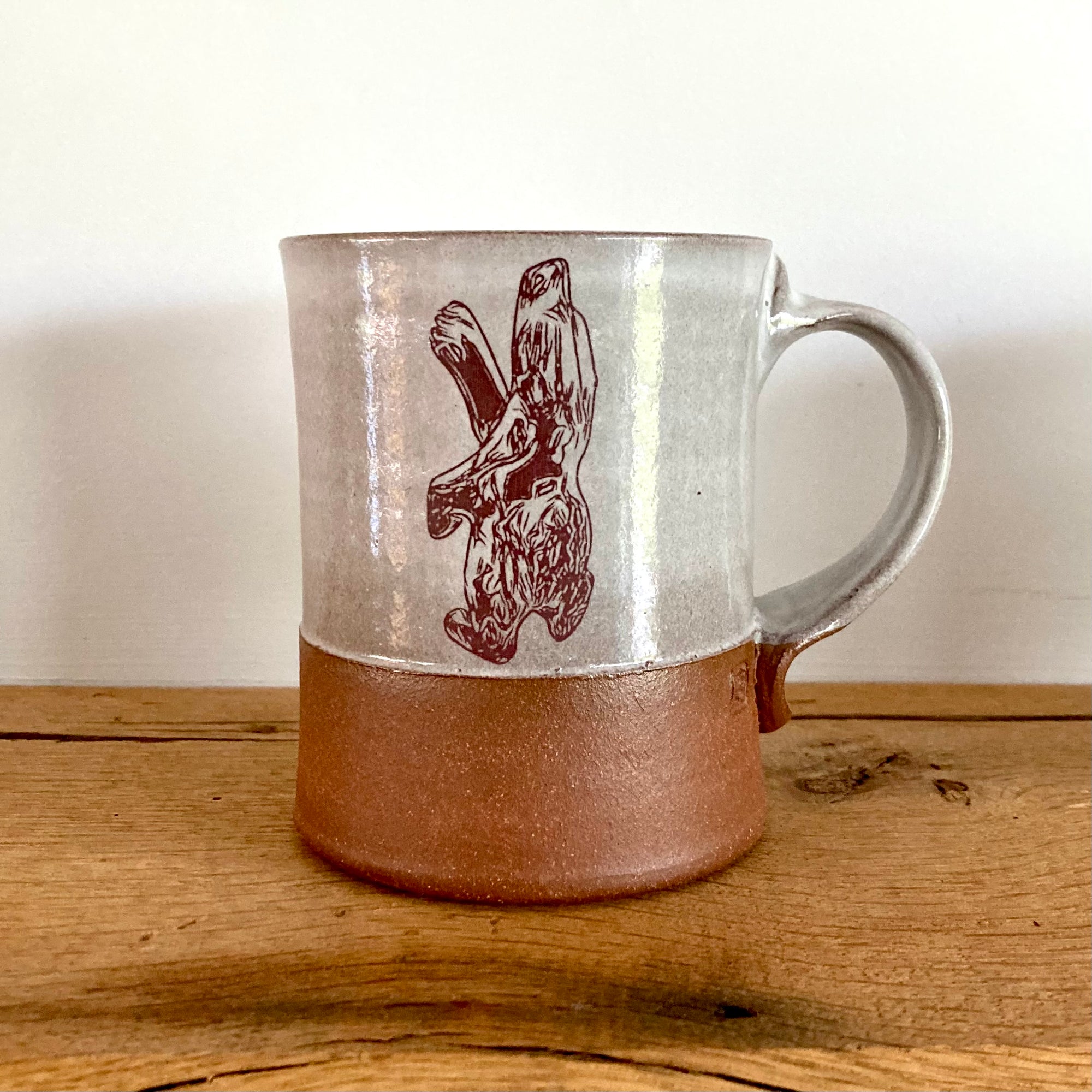 A wheel thrown ceramic mug is glazed with either a blue grey or mist white glaze, then my dancing bear design is reproduced into the glaze (for more info on the design, see our clothing section - available as a tank top, tee, baseball shirt and hoody).
