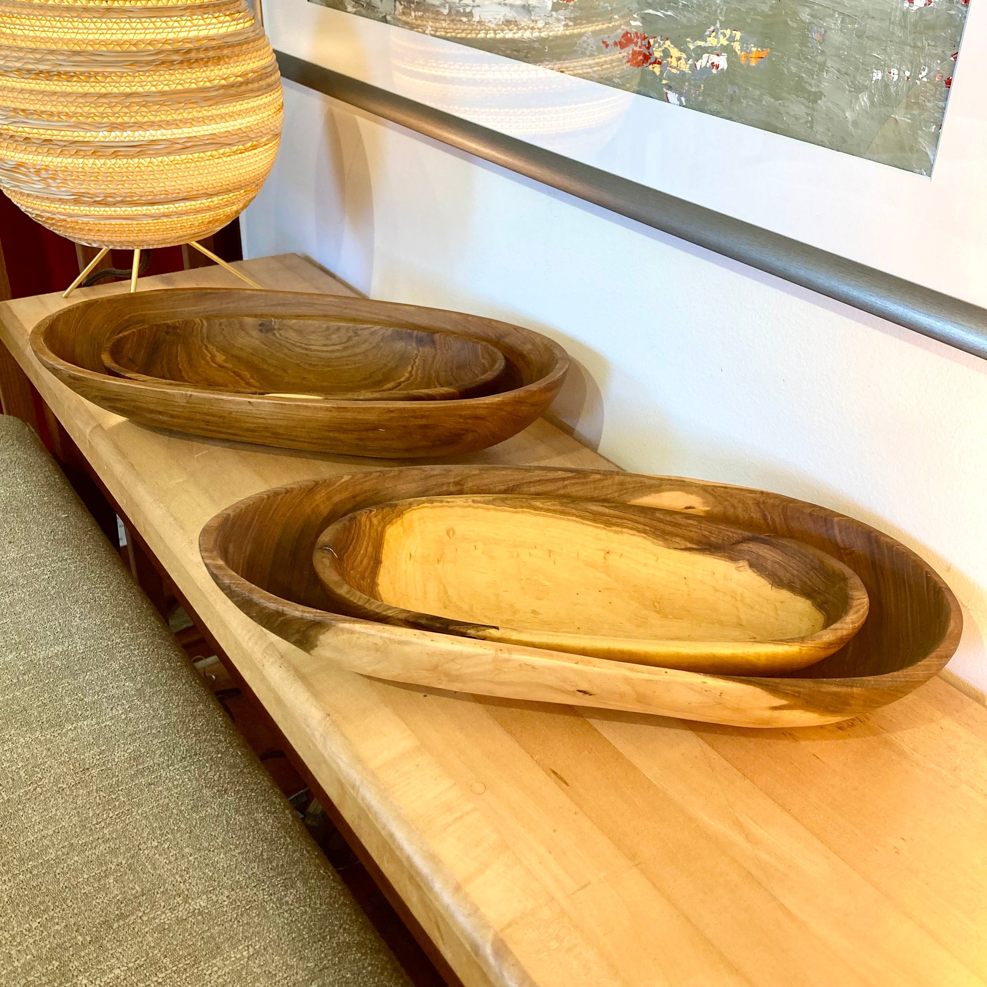 Sustainably harvested mahogany is hand carved into elegant ovals to create these beautiful, functional serving bowls which nest beautifully if purchased as a set. Perfect for serving bread, chips, fruit, and once oiled repeatedly over time, salads, grains, etc.