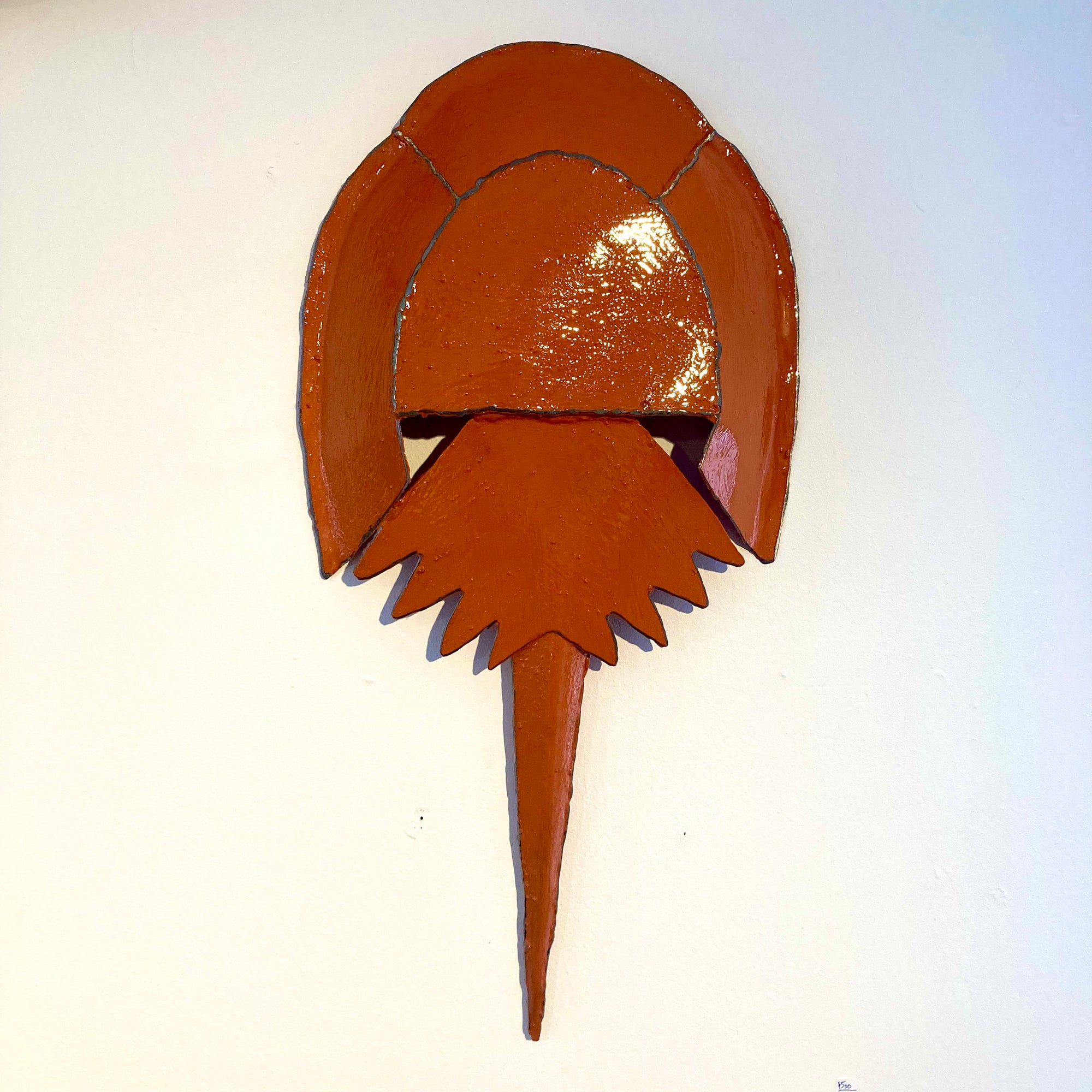 Custom made just for Arcadia from reclaimed metal from old farm equipment, this horseshoe crab will hang comfortably on a wall or rest nicely on a mantel or shelf, or even outside.