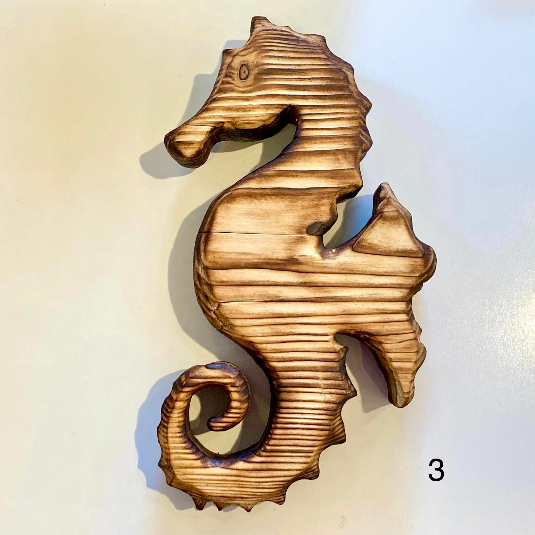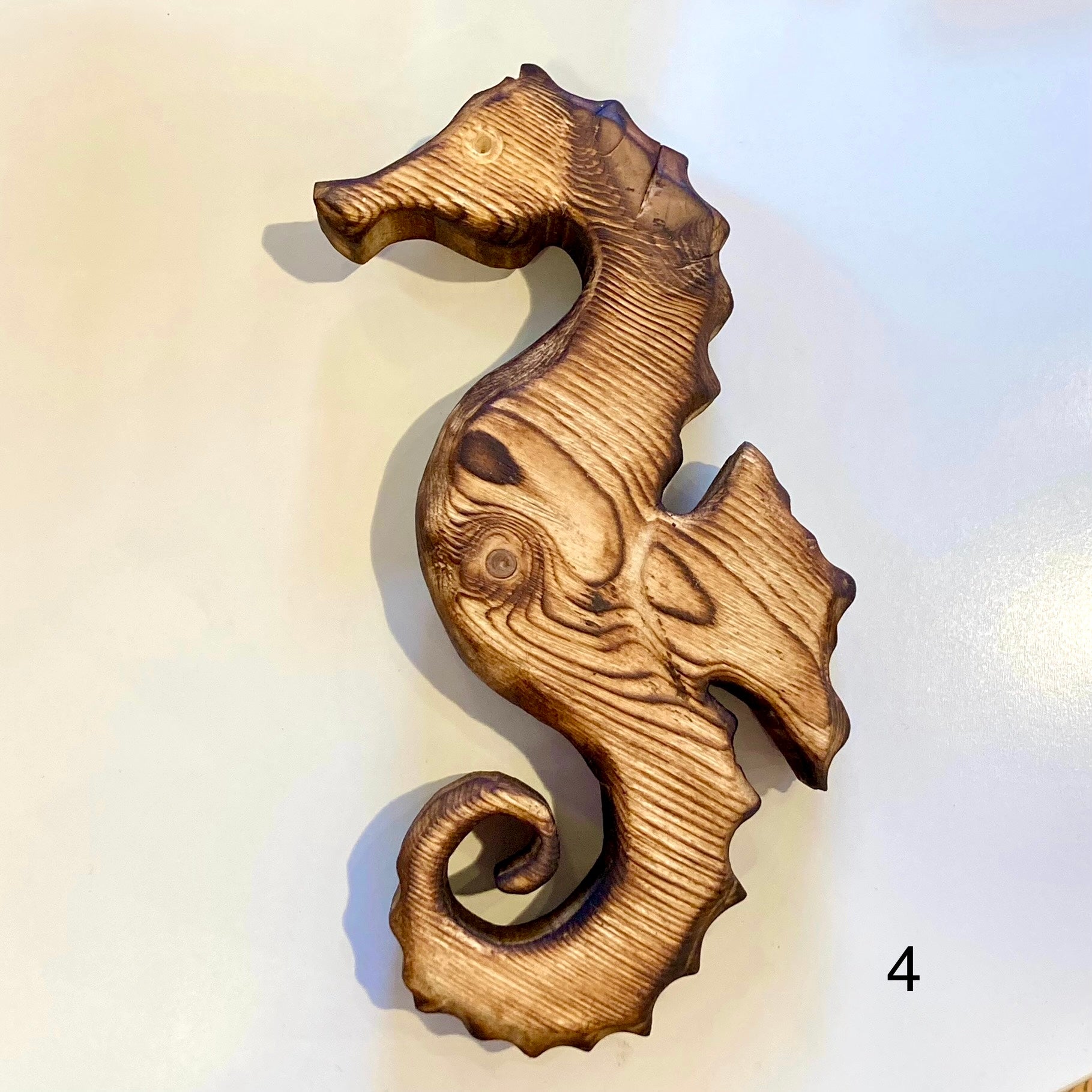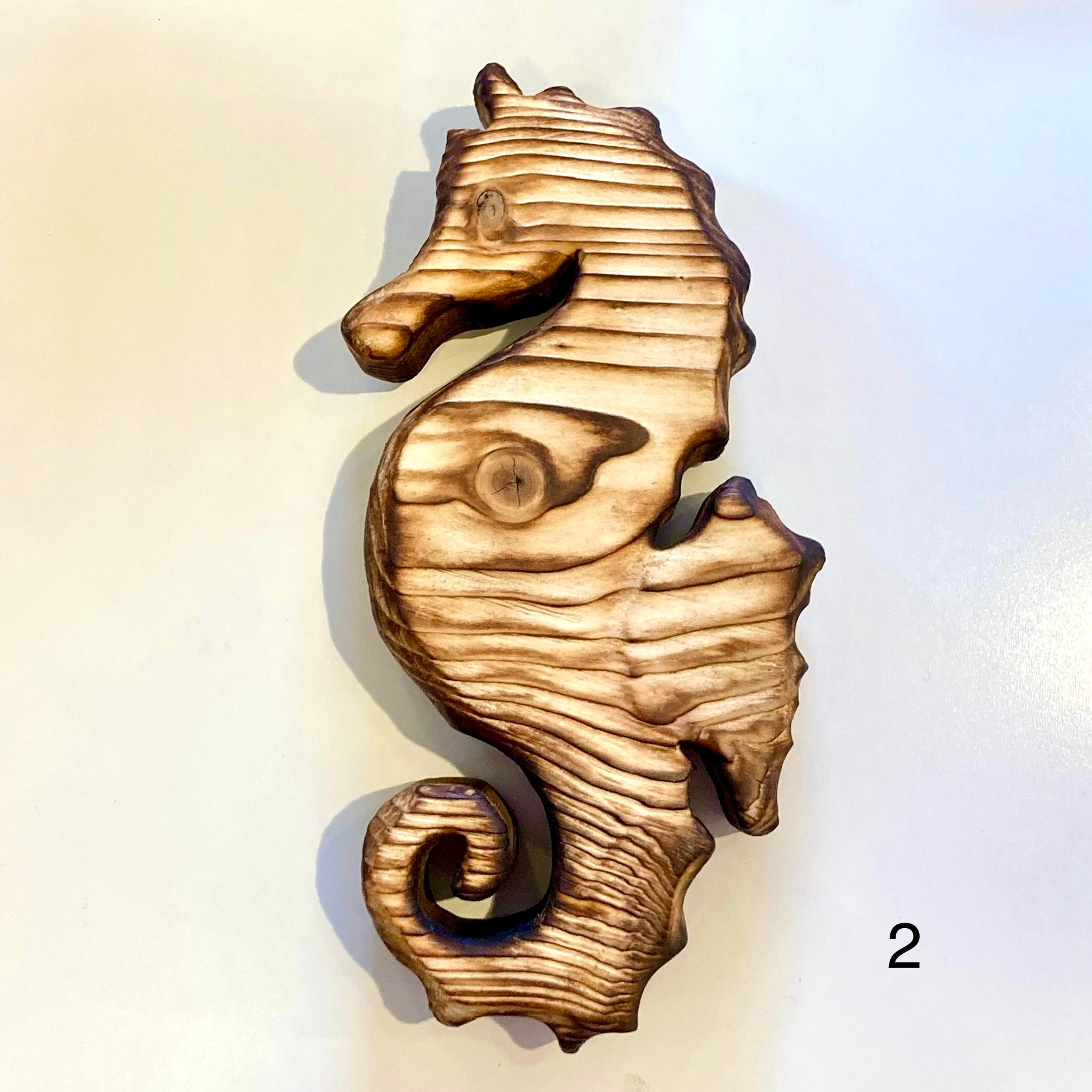 Seahorses measure approximately 9" tall by 4.5" wide by 1.5" thick and weighs 9 ounces. Each piece is signed and dated on the back and has a secure wire for easy hanging. May be displayed outside but expect some bleaching and fading over time.