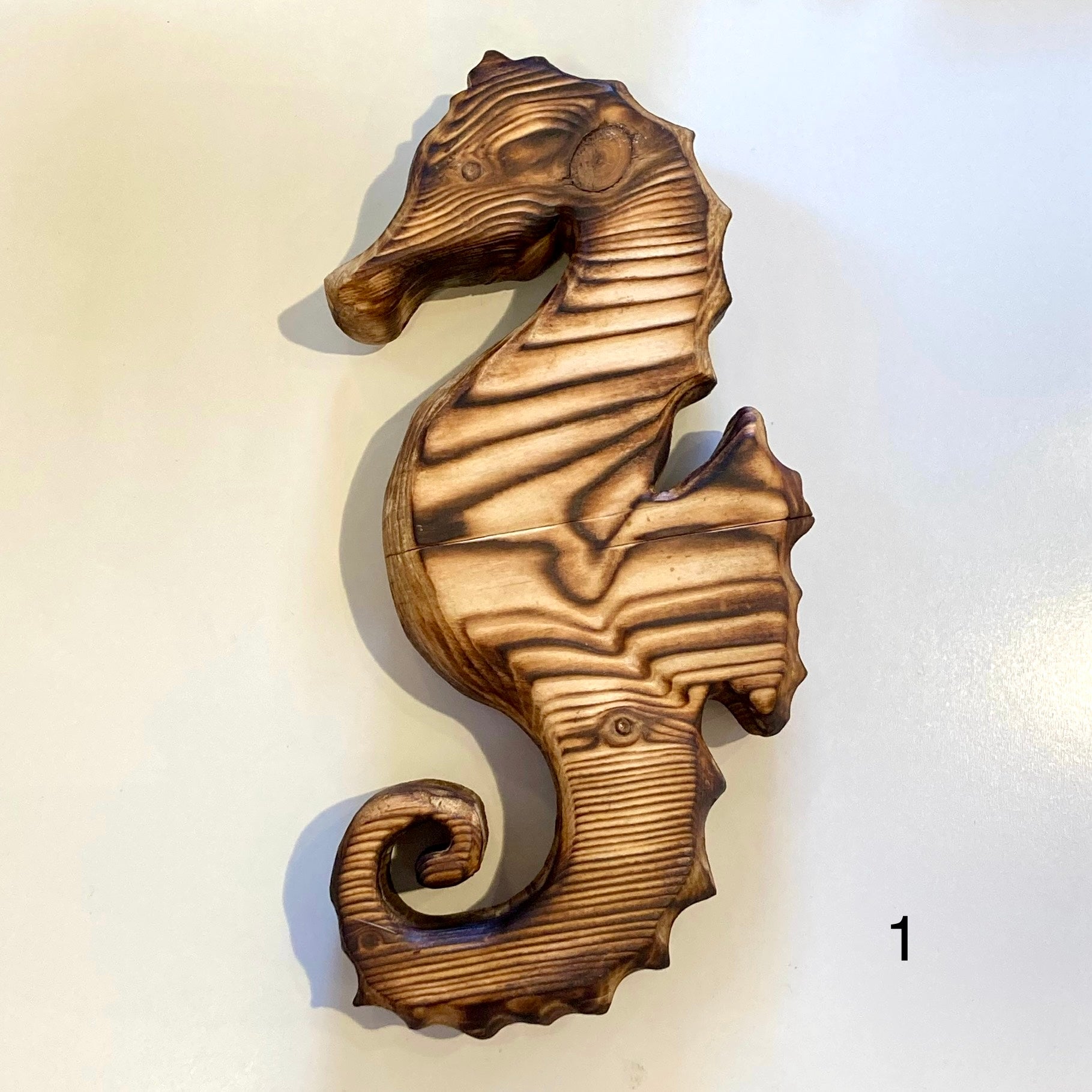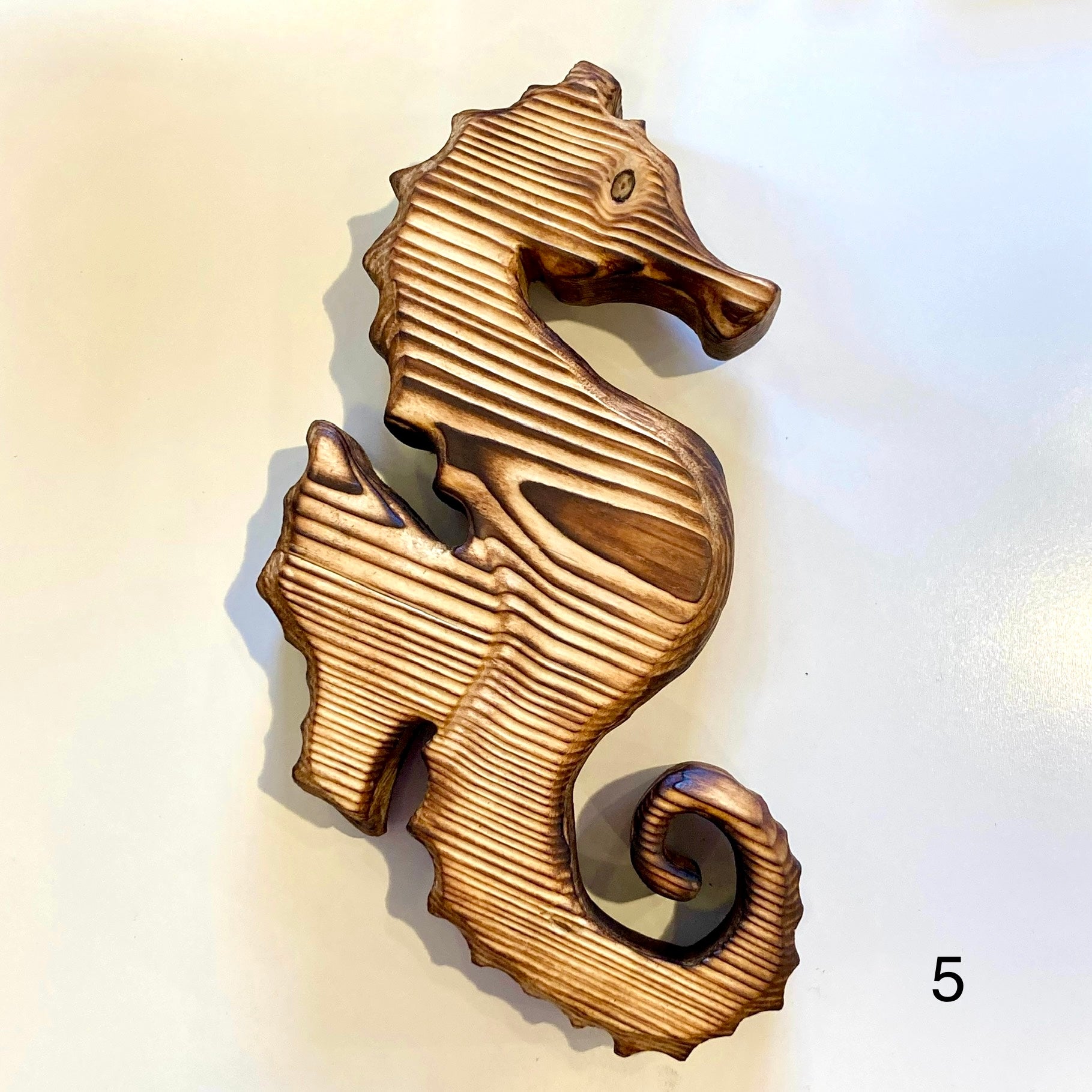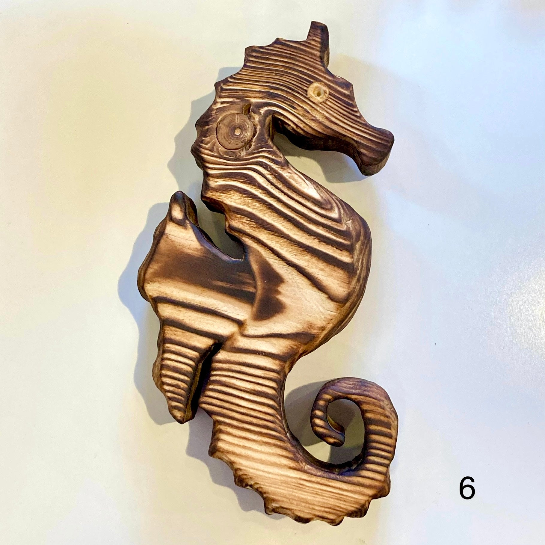 Seahorses measure approximately 9" tall by 4.5" wide by 1.5" thick and weighs 9 ounces. Each piece is signed and dated on the back and has a secure wire for easy hanging. May be displayed outside but expect some bleaching and fading over time.