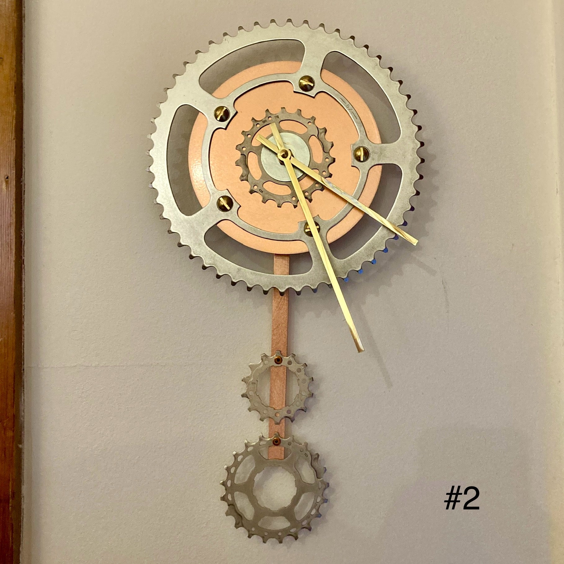 Clock #2 is 8.5" in diameter, 16" in length with the removable bike gear pendulum.
