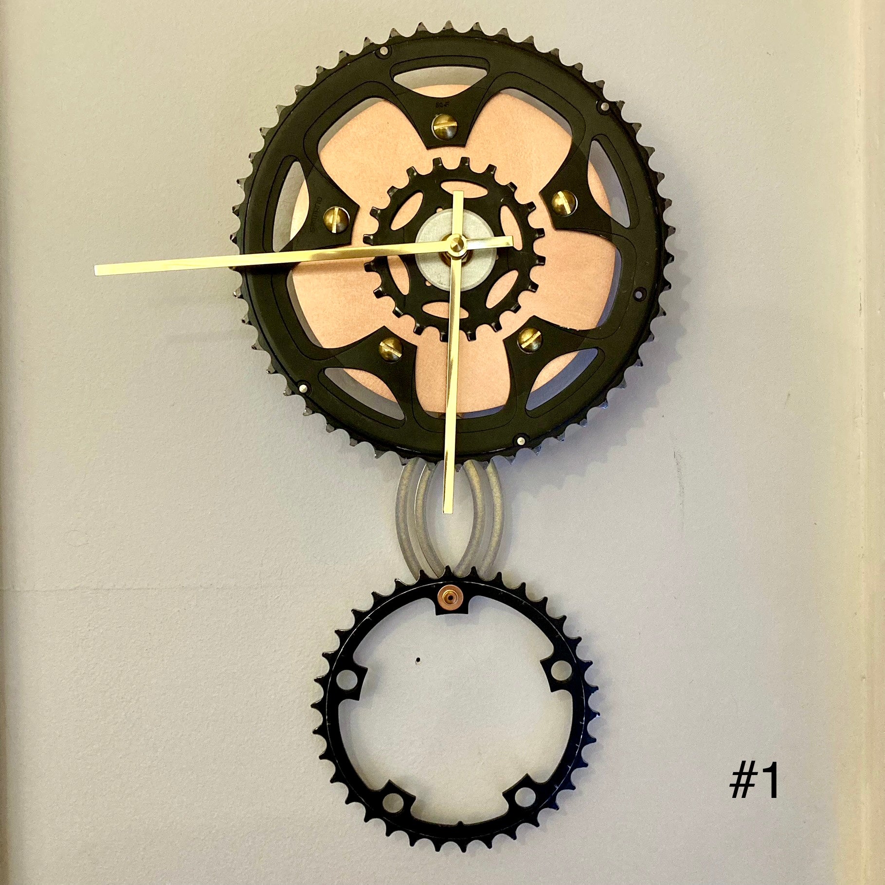 Clock #1 is 8" in diameter, 15" length with the removable bike gear pendulum.