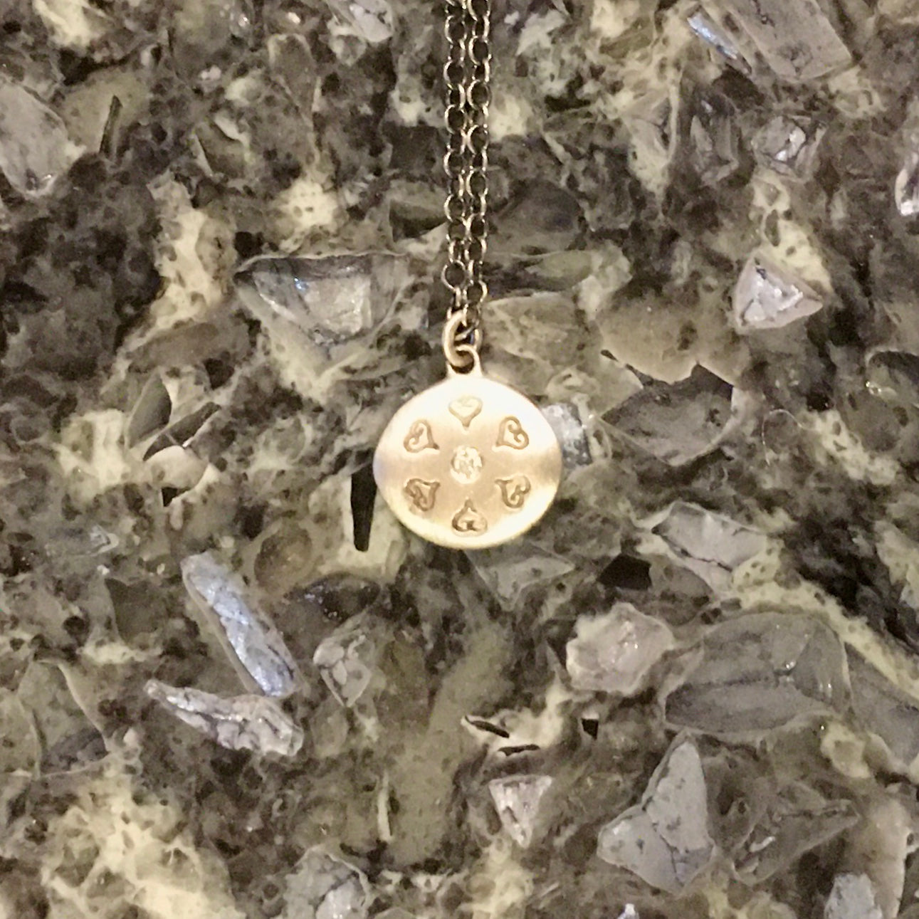 A delicate circle of etched hearts surround a .01ct faceted diamond, glittering fiercely at the center of this pendant.