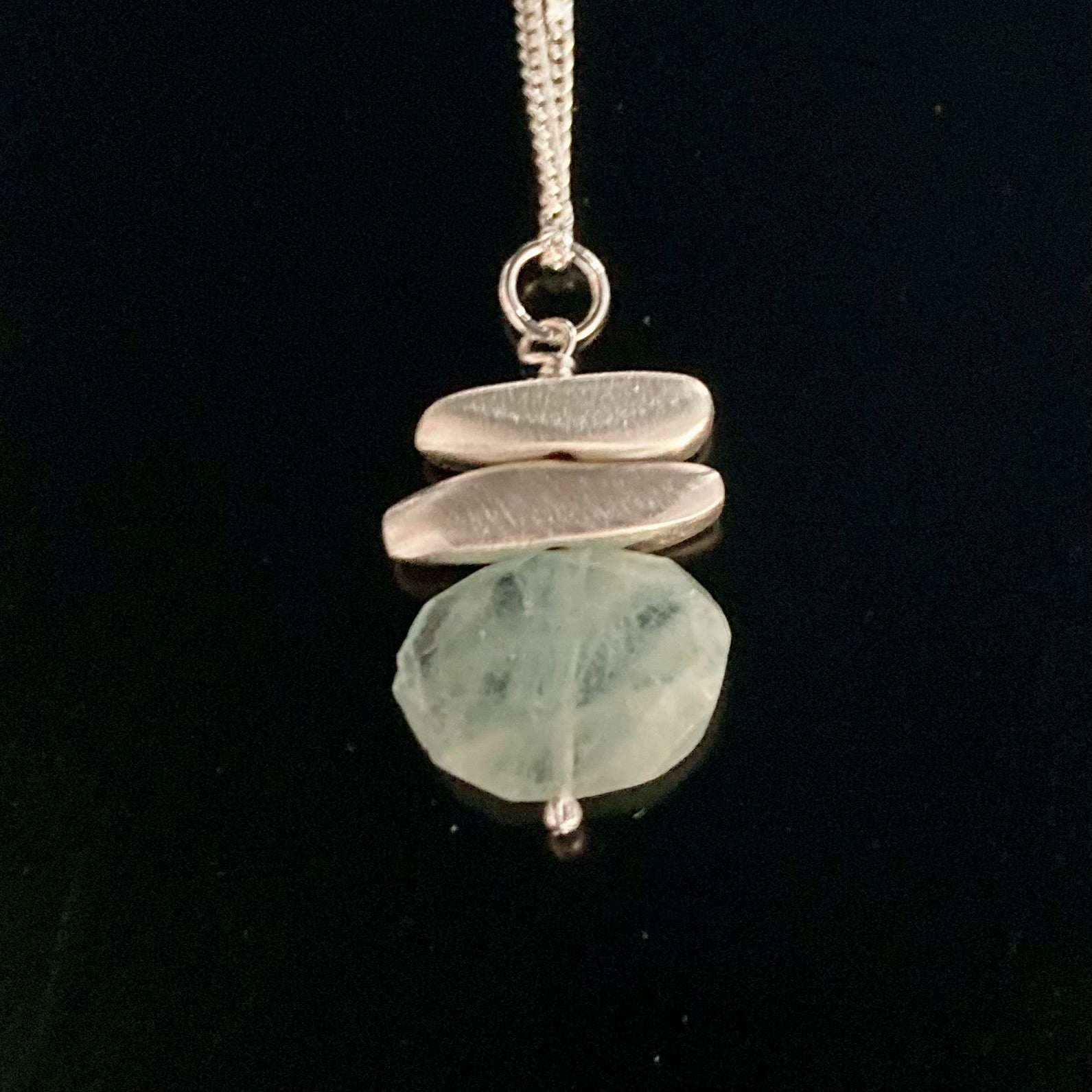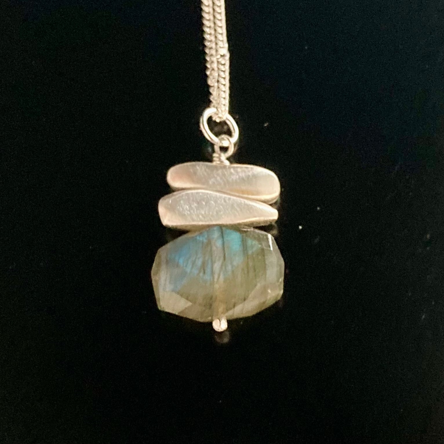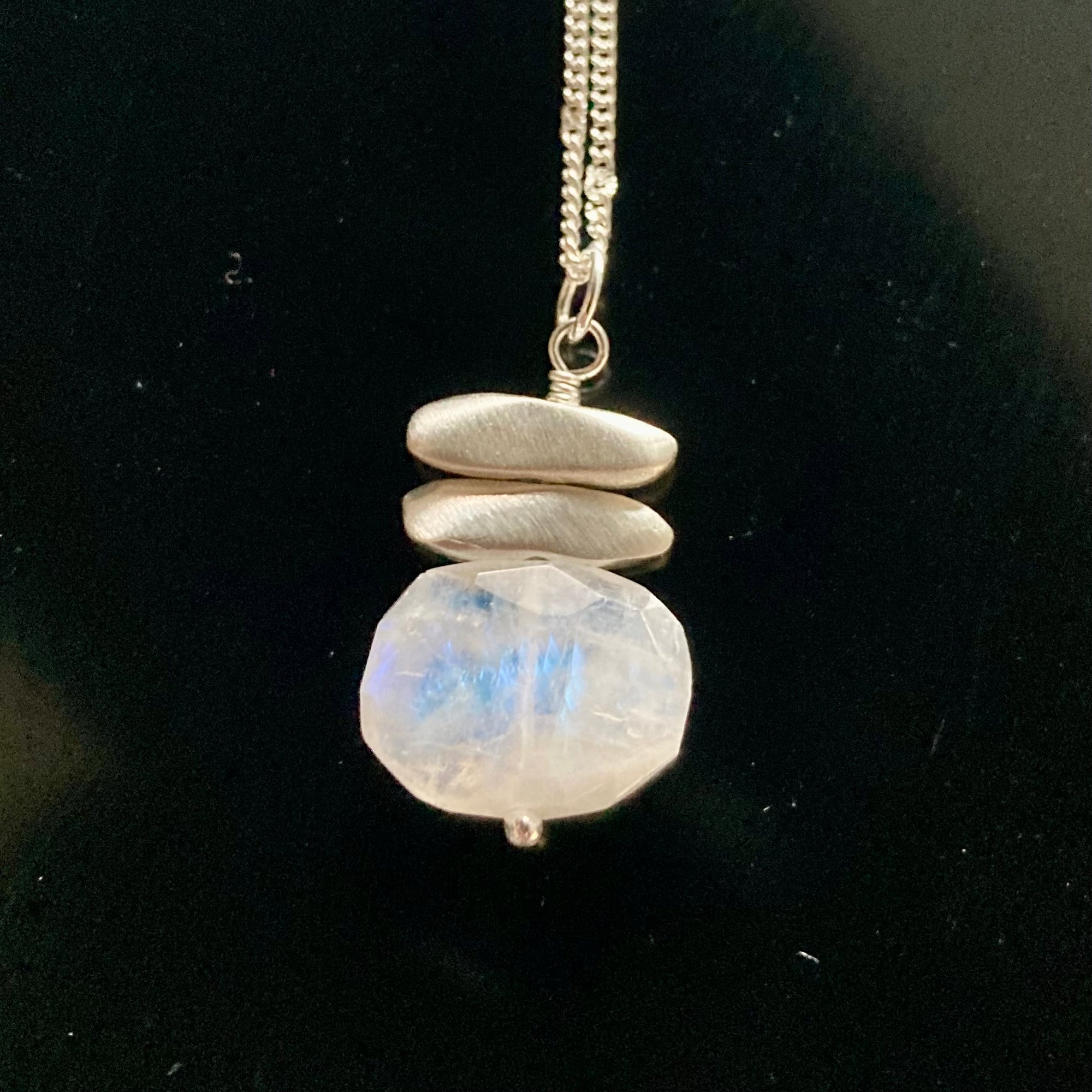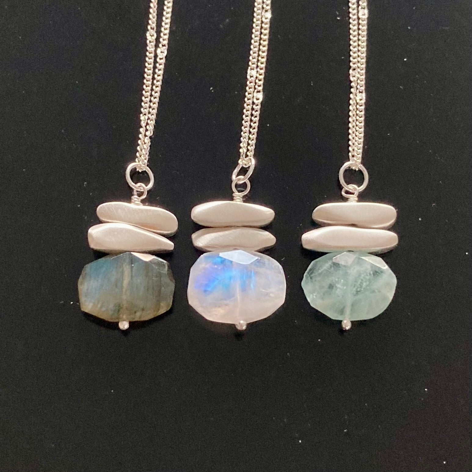 Two brushed sterling silver stones are loosely stacked above a faceted moonstone, aquamarine or labradorite with enough space to move separately, inviting play and giving the pendant it's own energy and a bit of flash when the stone catches the light. Moonstone flashes purple/blue, labradorite flashes silver/blue/green, aquamarine glows when in direct light.