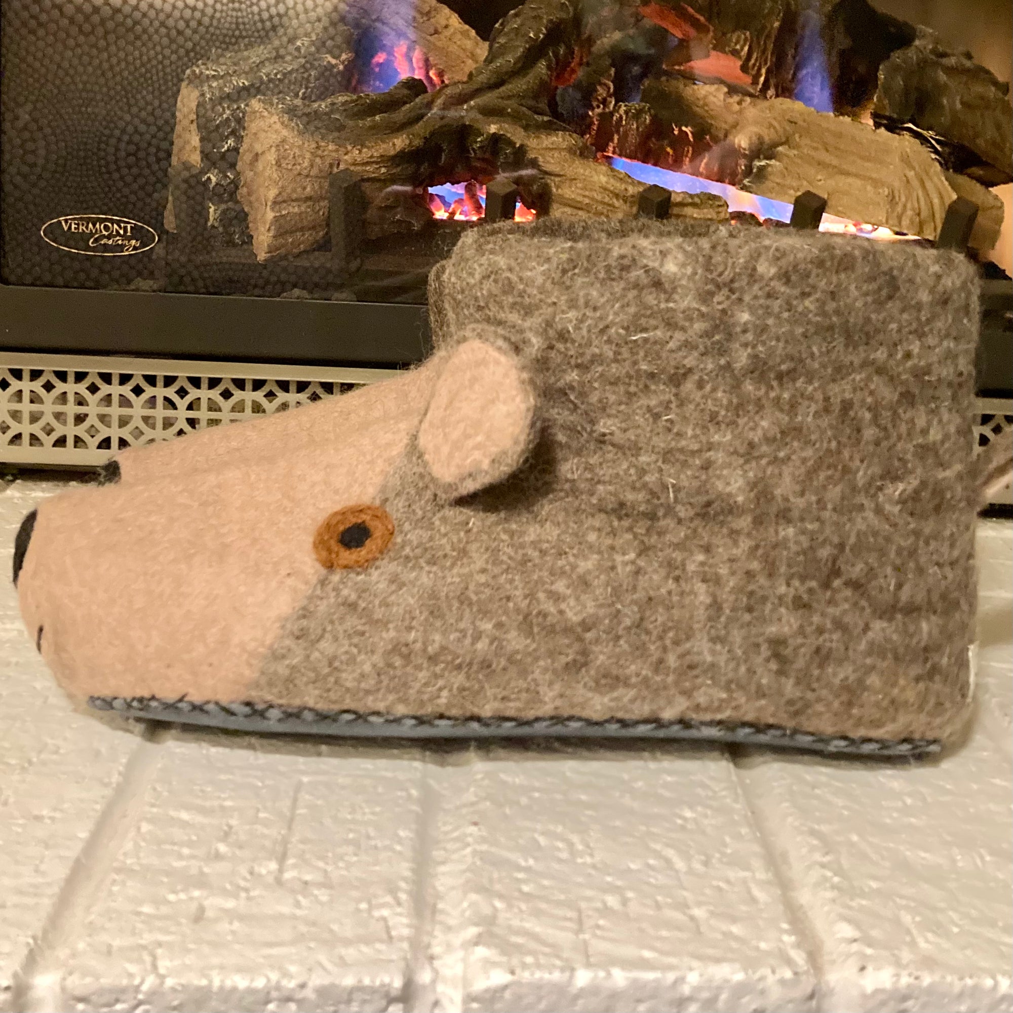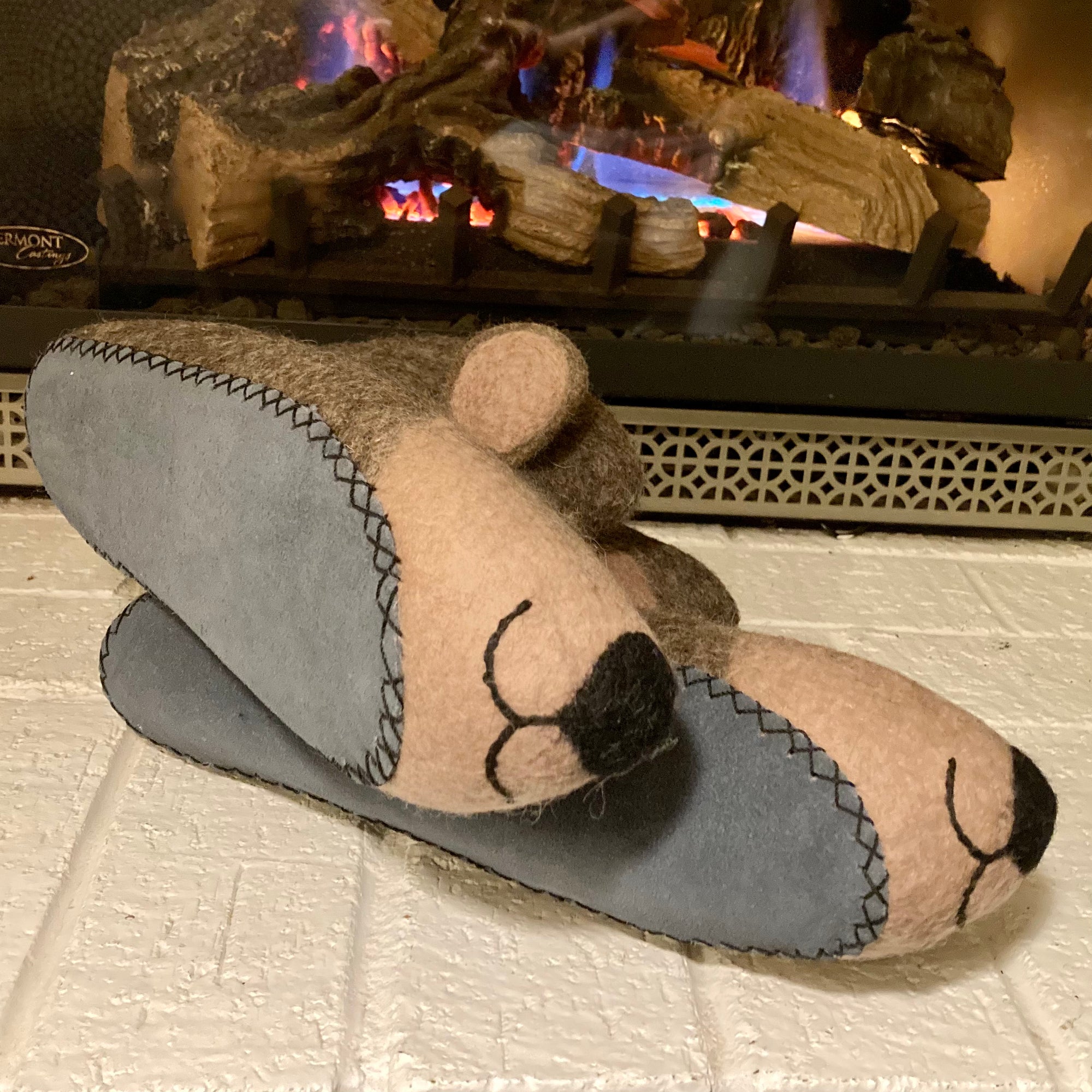 This slippers are made of super soft, 1/2" thick, breathable, handmade wool felt, carefully stitched to a suede bottom to help with traction and insulation, and the most adorable little smile, eyes and ears complete the look.