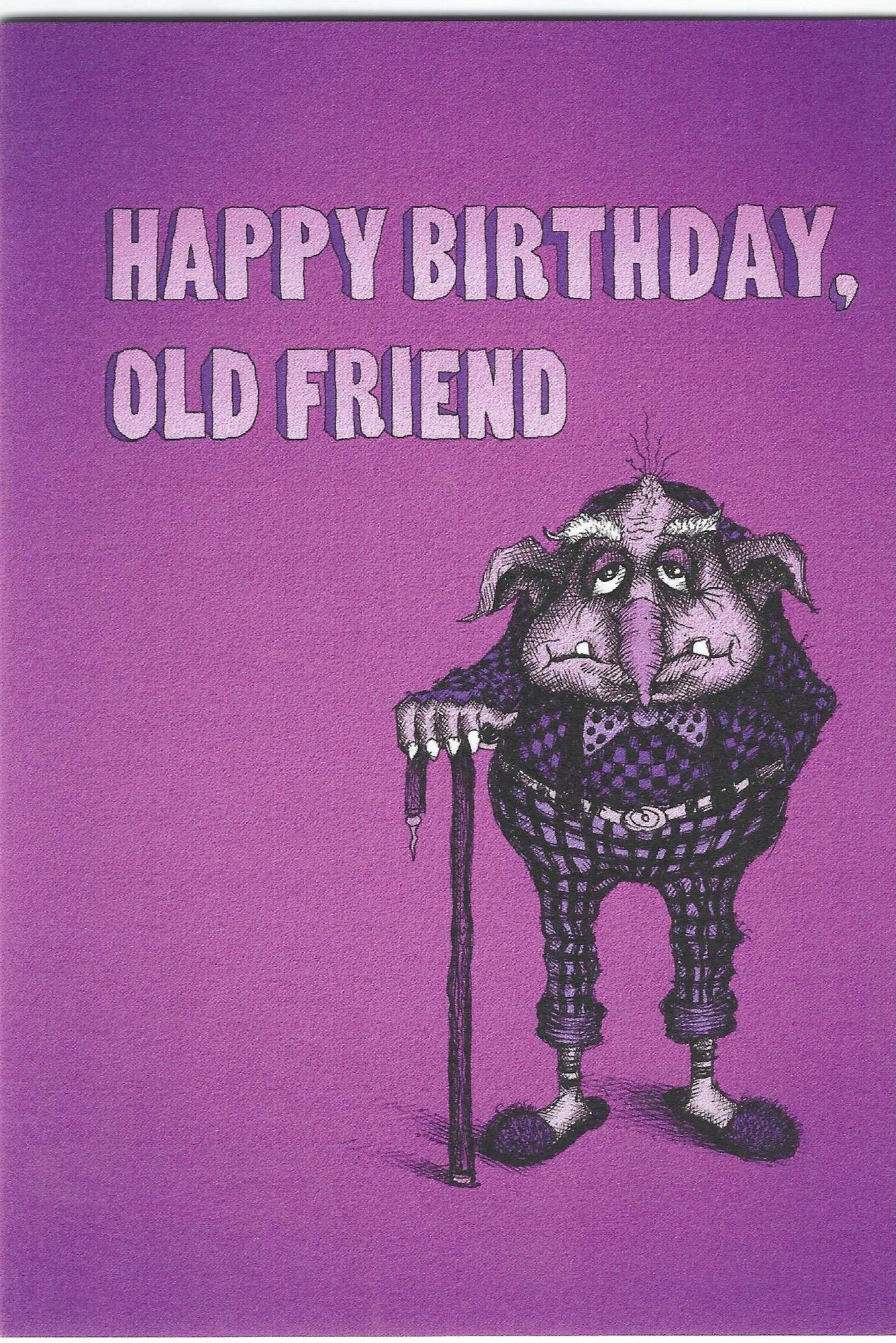 Cover reads "HAPPY BIRTHDAY, OLD FRIEND." in pale pink ink on a purple background with a bucktoothed ogre-like creature with a carrot shaped nose, pig ears and a large sharp nails on the hand holding a cane, wearing black and purple heavily patterned clothing and fuzzy slippers.
