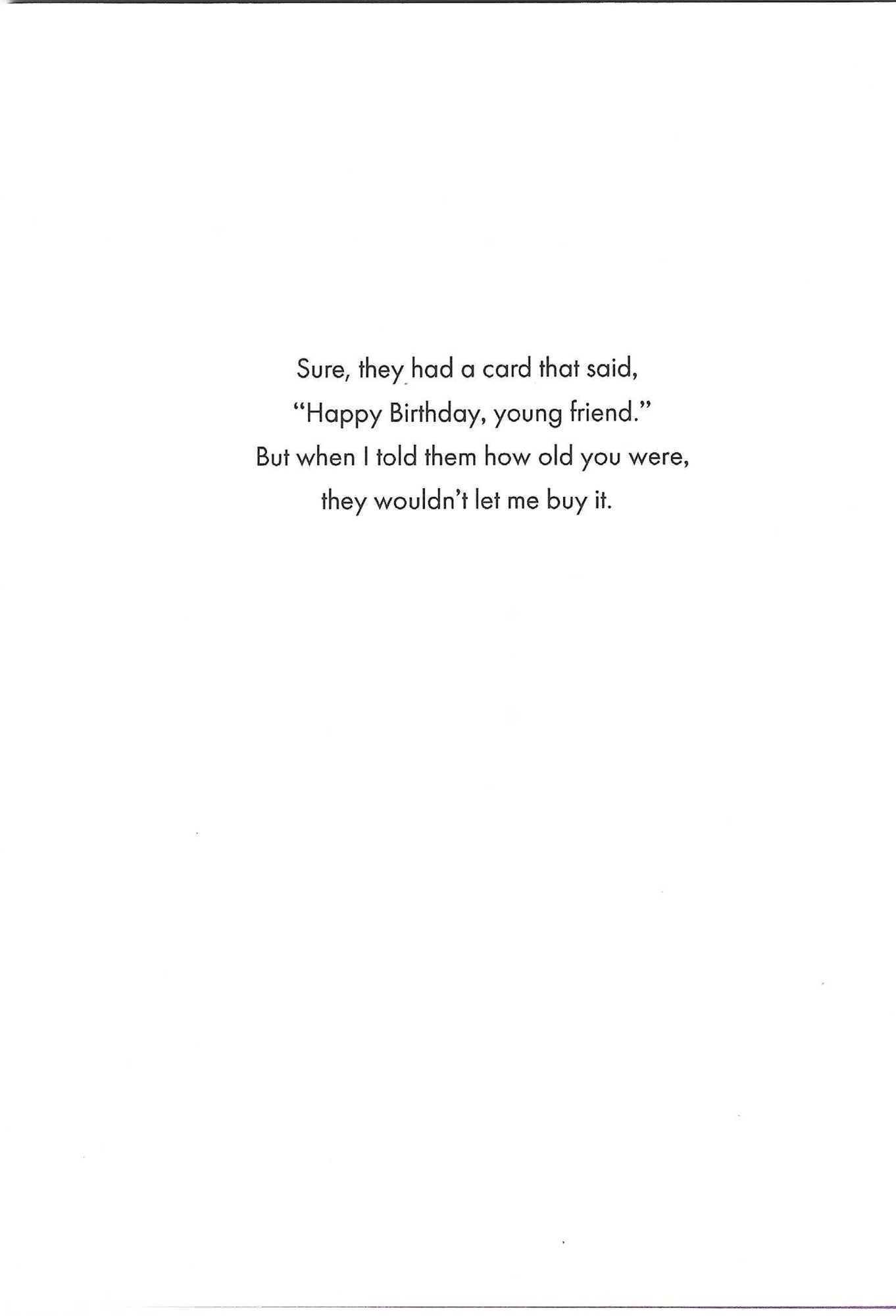 Inside of card reads, "Sure, they had a card that said, "Happy Birthday, young friend." But when I told them how you were, they wouldn't let me buy it."