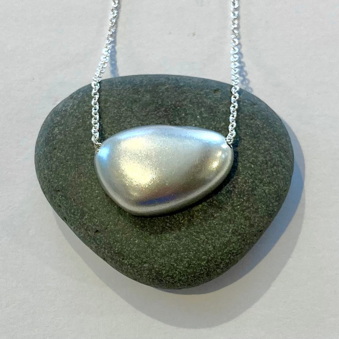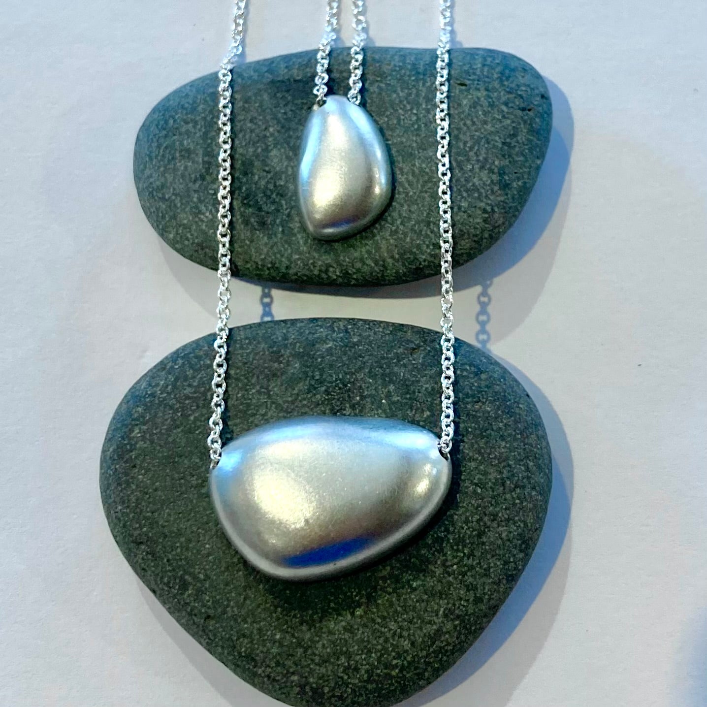 A sterling silver organically shaped pebble is simply suspended from a 19" delicate sterling silver chain with loops at 17" and 18" as well so you can decide how to wear it. The pendants are hollow so they are feather light with a satin finish.