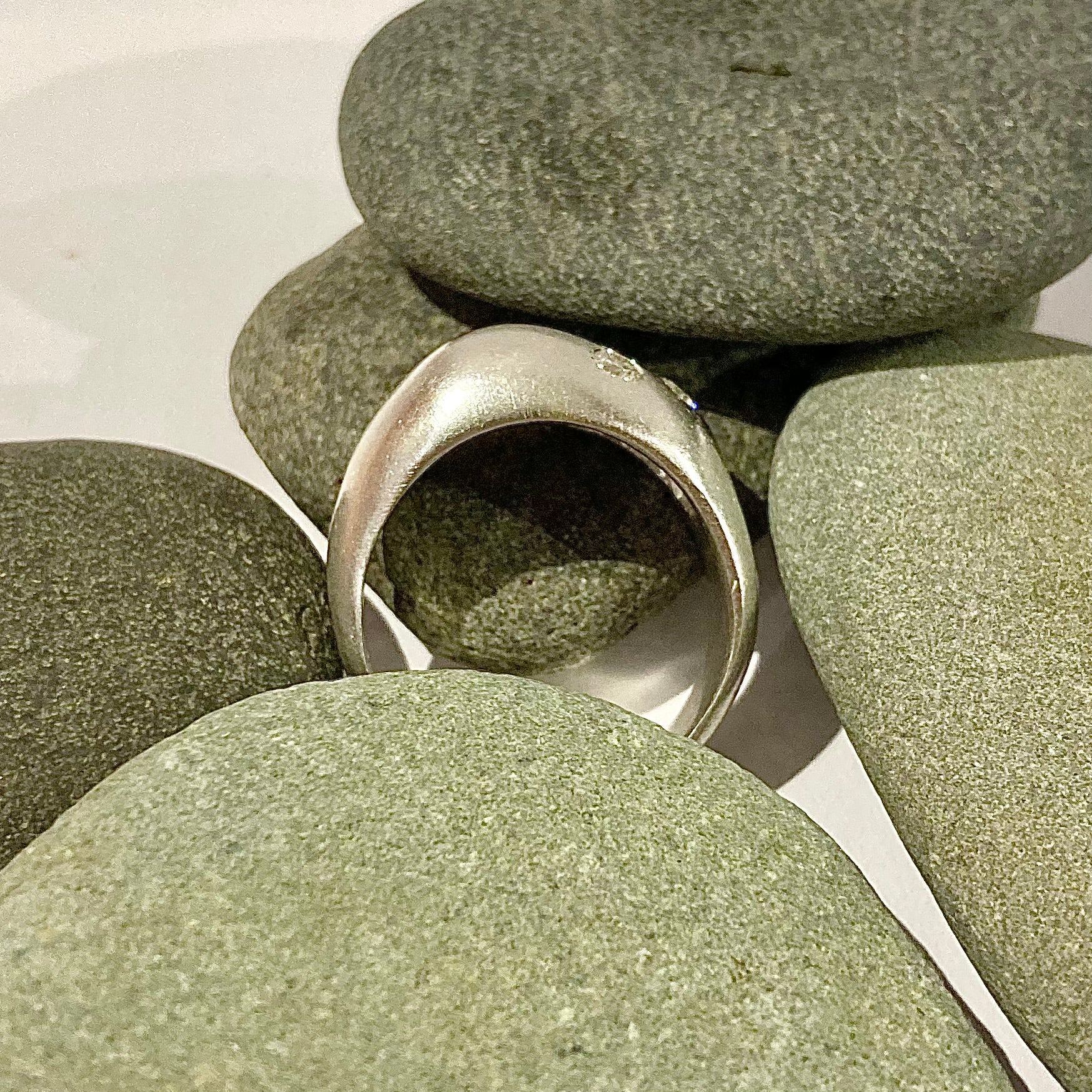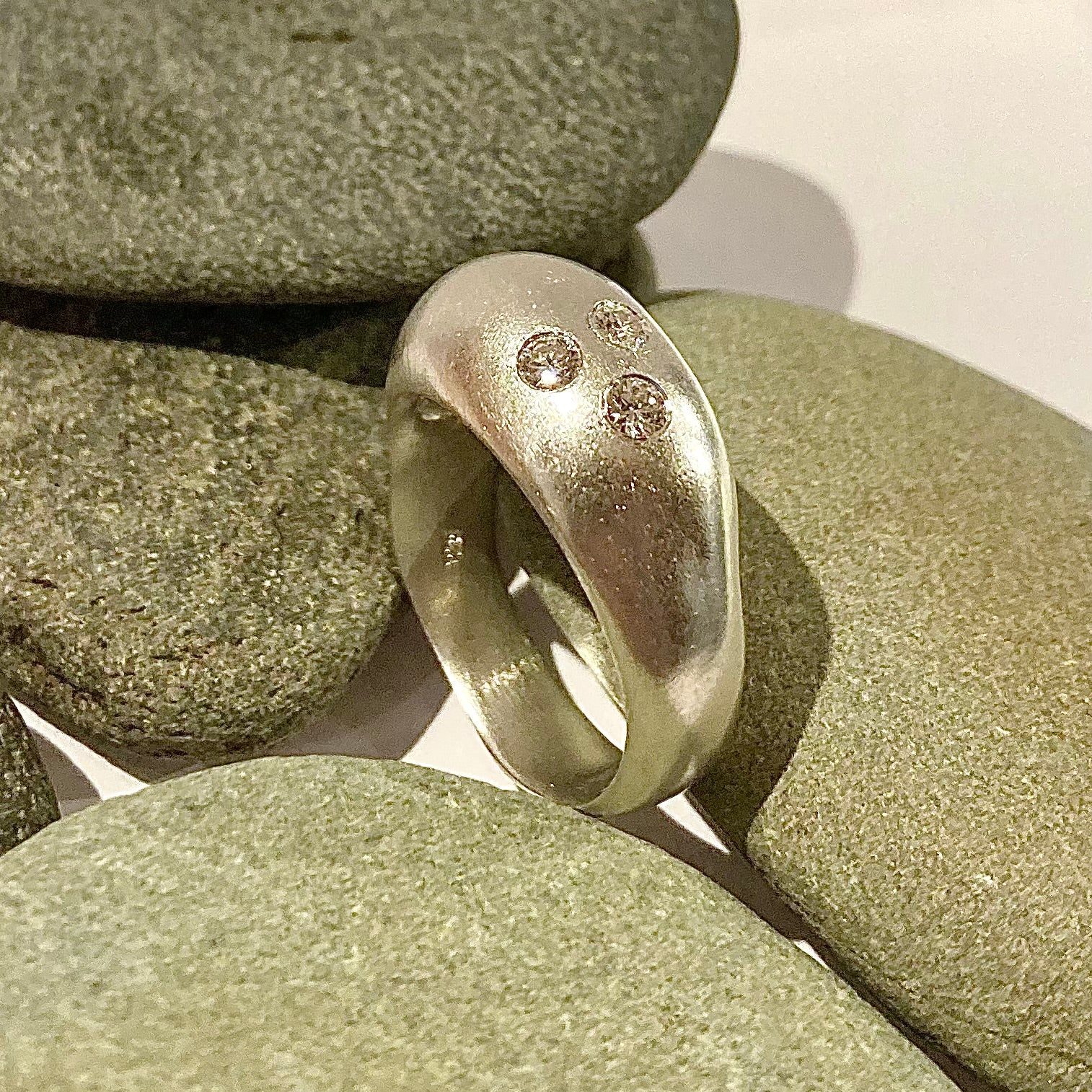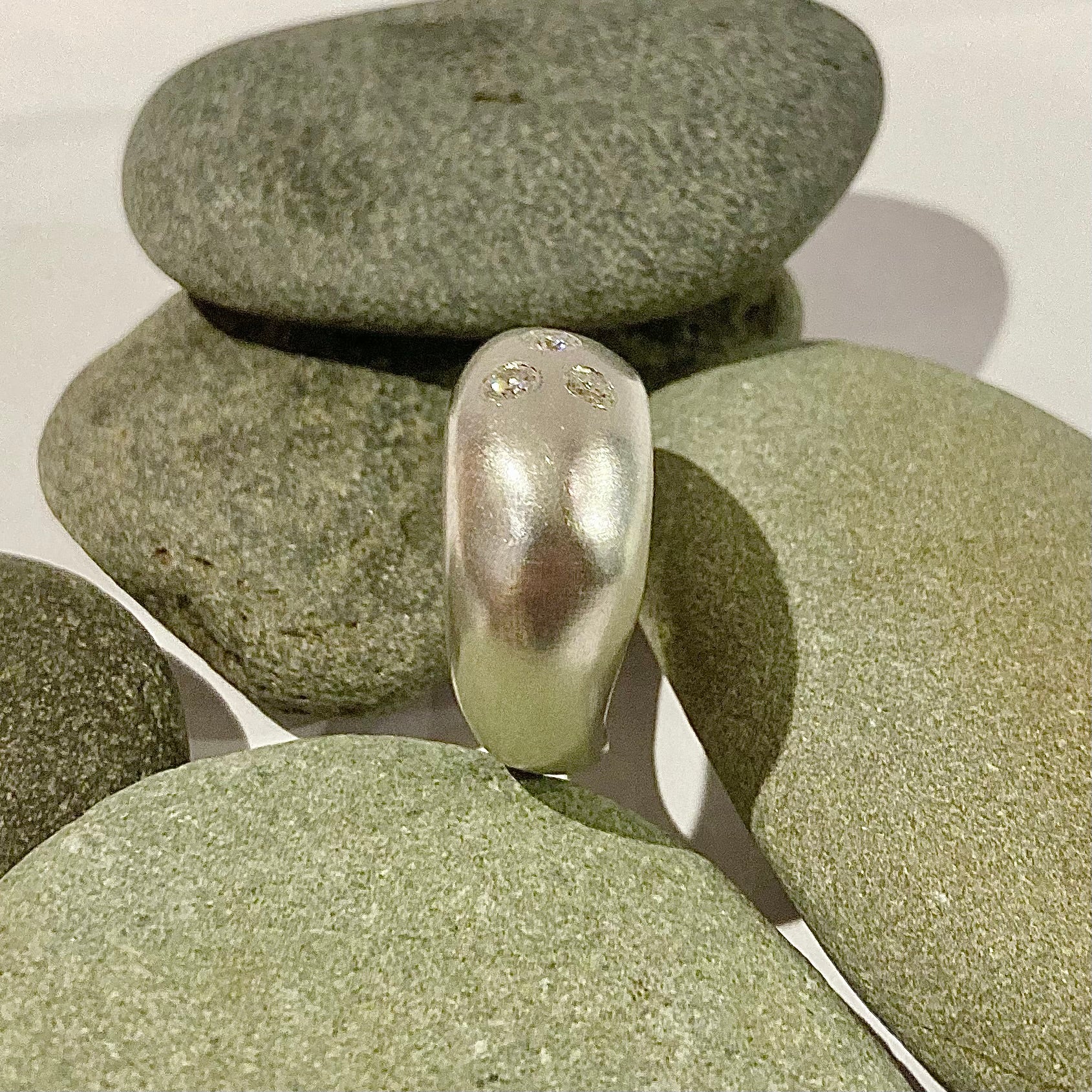Three flush set faceted diamonds (total .24 carat) set off this totally organically shaped, satin finish sterling silver ring. Imagine a beach rock, rubbed smooth over millenia and drilled through to create a ring, then accented with 3 diamonds.