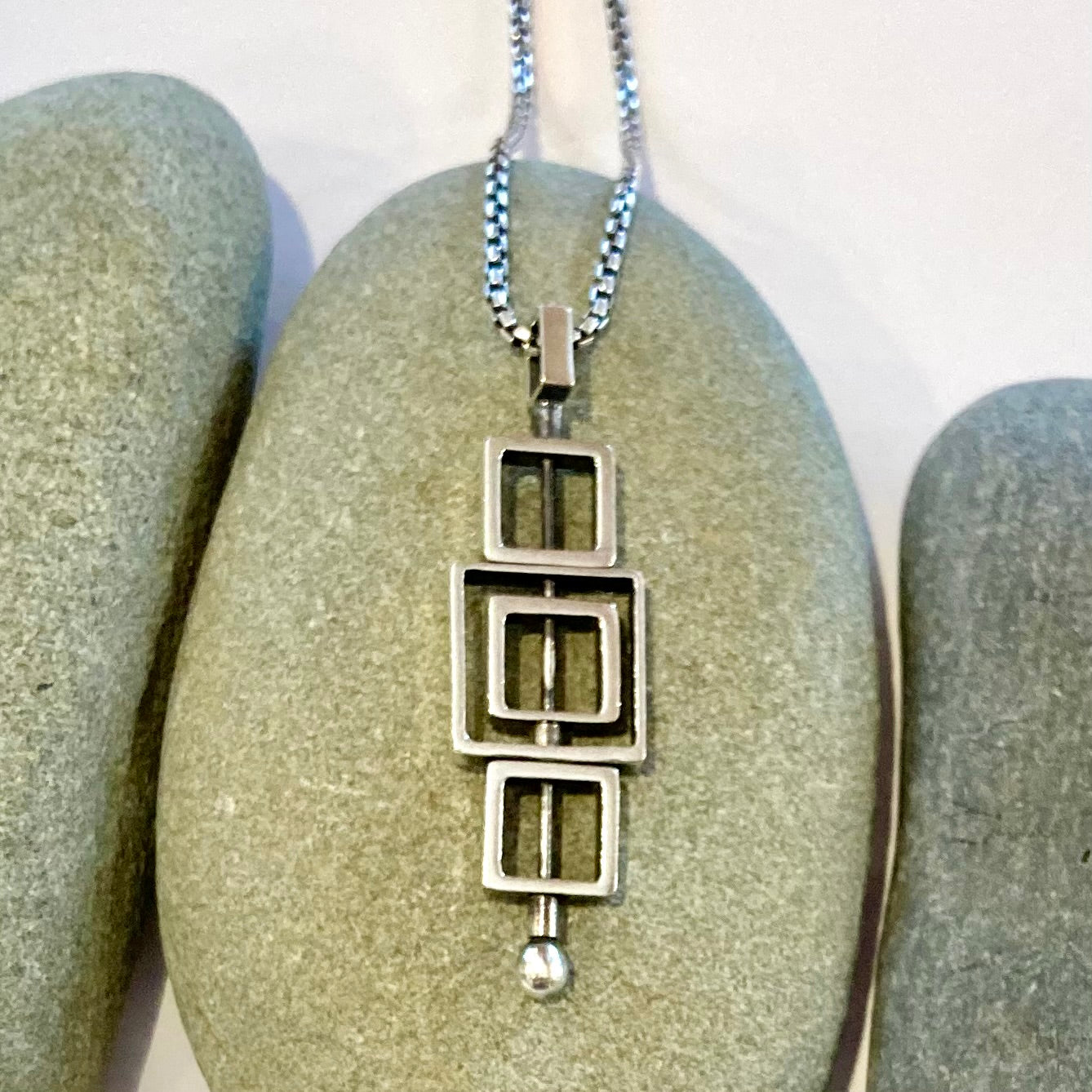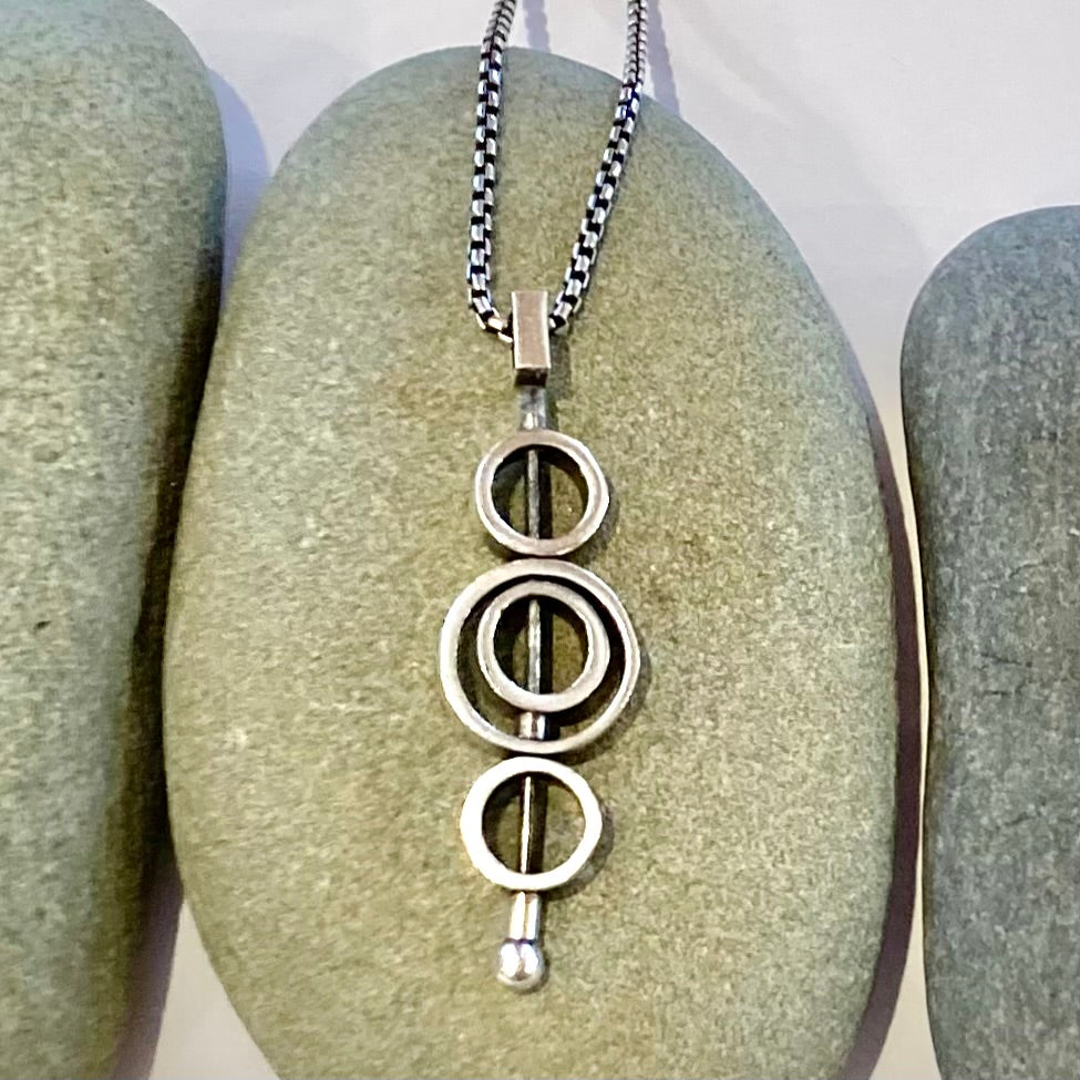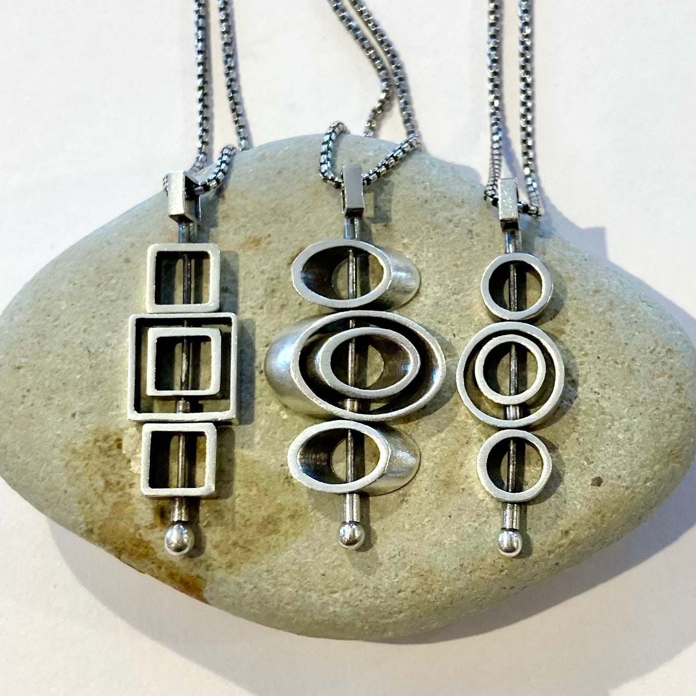 Four sterling silver circles, ovals or squares are stacked on a 1.25" length sterling silver pin so that they will spin freely as you move through life. Suspended from an 18" sterling silver box chain, the interiors and chain are all lightly oxidized to highlight the geometry and fun of each piece. Makes a great fidget toy too!