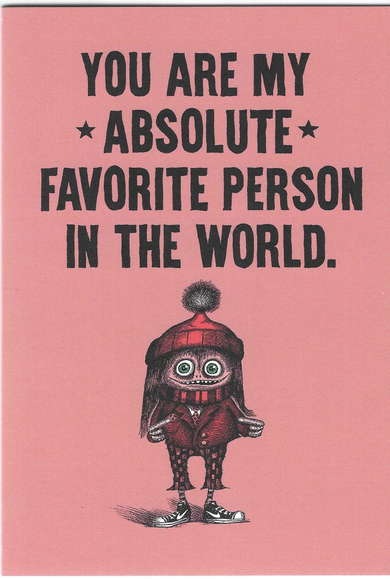 Cover reads "YOU ARE MY *ABSOLUTE* FAVORITE PERSON IN THE WORLD" in black ink on a pink background with a small person with big eyes wearing a large red pom pom hat, a red suit and sneakers.