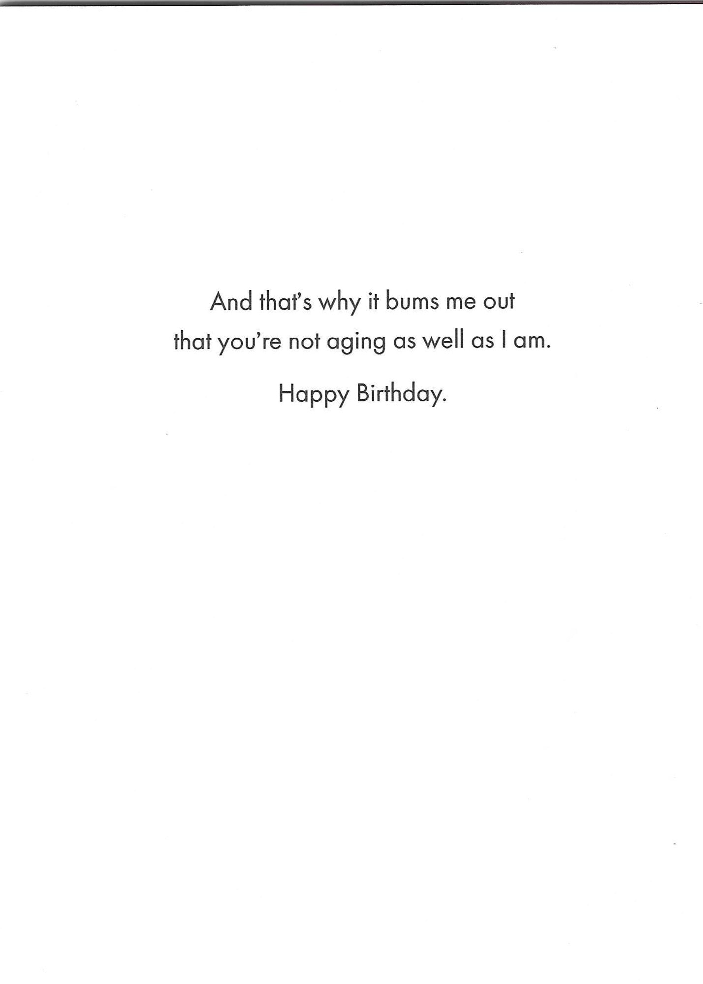 Inside of card reads, "And that's why it bums me out that you're not aging as well as I am. Happy Birthday."