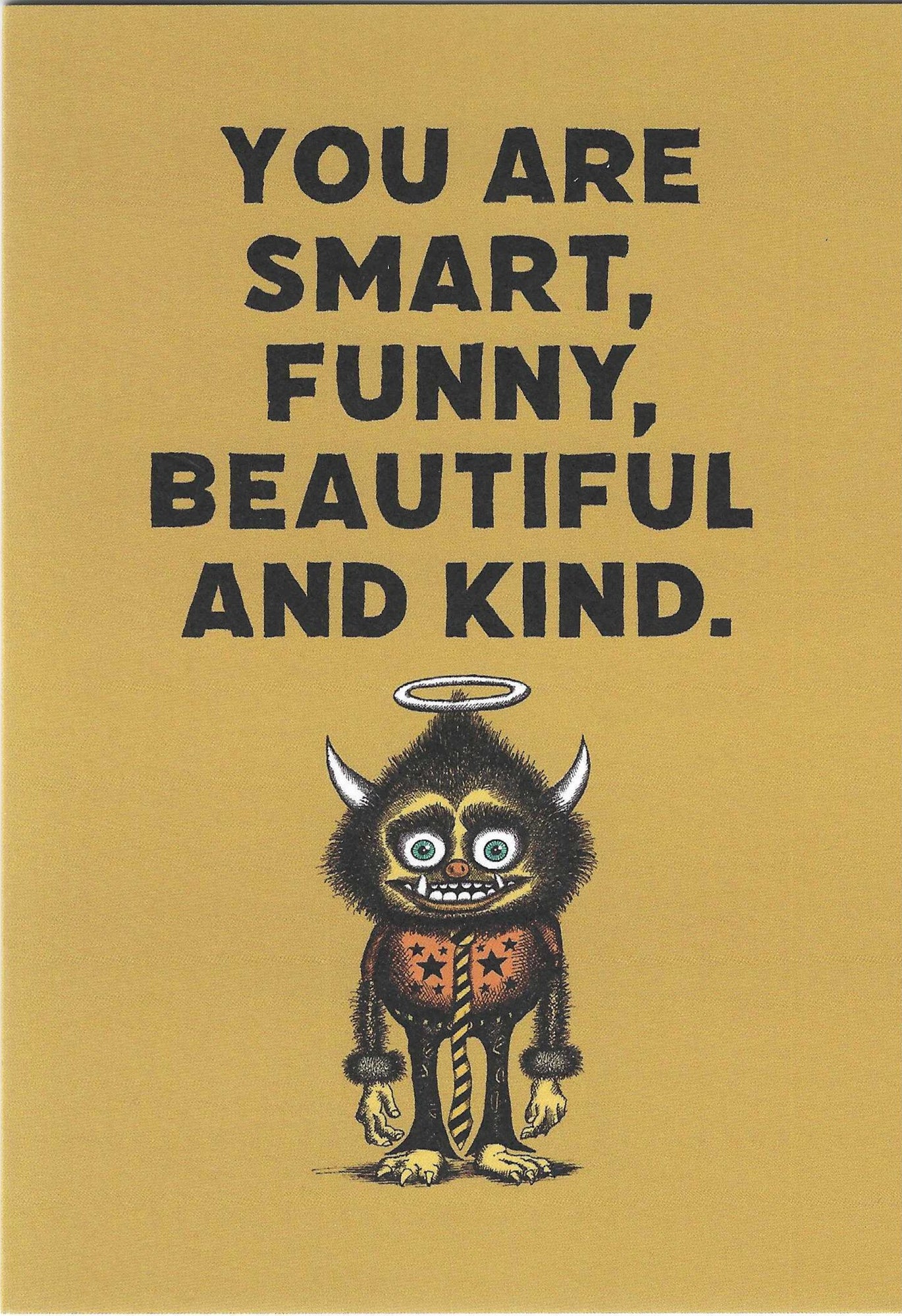 Cover reads "YOU ARE SMART, FUNNY, BEAUTIFUL AND KIND." in black ink on a mustard background with a toothy, horned creature wearing a striped tie and starry sweater and a halo above their head.